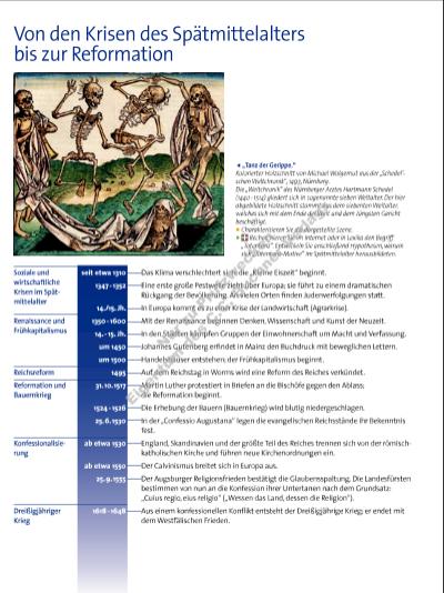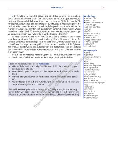 In der Geschichtswissenschaft gilt das Spätmittelalter, vor allem das 14. Jahrhundert, als eine Epoche voller Krisen. Der Klimawandel, die Pest, häufi ge Kriegsverwüstungen und immer wiederkehrende Missernten und Hungersnöte hatten hohe Bevölkerungsverluste zur Folge und riefen religiöse Zweifel, soziale Ängste und politische Unsicherheiten hervor. Andererseits erhielten die Bürger der Städte mehr Mitbestimmungsrechte. Kaufl eute konnten zu Unternehmern werden, die nicht nur mit Waren handelten, sondern auch für ihre Produktion und ihren Vertrieb sorgten. Zudem gewannen die Fürsten immer mehr Einfl uss auf die Könige und das Reich. Die Krisen und der Wandel hatten – trotz eines allgemeinen religiös bestimmten Krisenbewusstseins der Zeit – nicht zu einem tief greifenden Umbruch, zu keiner Revolution, sondern zu zahlreichen politischen, rechtlichen, wirtschaftlichen und kulturellen Modernisierungsprozessen geführt. Einen Umbruch brachte erst die Reformation im 16. Jahrhundert, die eine Glaubensreform zum Ziel hatte und in einer Spaltung der katholischen Kirche endete. Vorbereitet worden war dieser Umbruch in dem Jahrhundert zuvor. Um das Spätmittelalter zu verstehen, gilt es zu untersuchen, was die Krisen und den Wandel ausgelöst hat und welche Veränderungen sie eingeleitet haben. In diesem Kapitel erwerben Sie die Kompetenz, • wirtschaftliche, soziale und religiöse Krisen des Spätmittelalters zu charakterisieren und zu beurteilen, • (Krisen-)Bewältigungsstrategien und ihre Folgen zu beschreiben und zu analysieren, • Modernisierungsschübe wie die Renaissance und den Frühkapitalismus zu erläutern, • Voraussetzungen, Verlauf und Auswirkungen der Reformation im Reich und Europa wiederzugeben und zu erörtern. Zur Methoden-Kompetenz siehe Seite 33 bis 35 („Bildquelle – ,Die vier apokalyptischen Reiter‘ von Dürer“). Zum Kompetenzerwerb im Hinblick auf Theorien und Modelle zu Umbruchsituationen lesen Sie Seite 18 bis 20 („Theorie-Baustein: Krise“). Wichtige Namen • Johannes Calvin • Albrecht Dürer • Erasmus von Rotterdam • Jakob II. Fugger • Johannes Gutenberg • Jan Hus • Karl V. • Nikolaus Kopernikus • Leonardo da Vinci • Martin Luther • Philipp Melanchthon • Thomas Müntzer • John Wyclif • Ulrich Zwingli Wichtige Begriffe • Ablass • Agrarkrise • Augsburger Religionsfrieden • Bann • Bauernkrieg • Confessio Augustana • Frühkapitalismus • Fürstenreformation • Humanismus • „Kleine Eiszeit“ • Konfessionalisierung • Landeskirche • Medienrevolution • Partizipationsbewegungen • Pest • Reformation • Reichsacht • Reichsreform • Renaissance • Volksfrömmigkeit • Volksreformation 9Auf einen Blick 7316_1_1_2015_008-079_Krisen_Revolutionen.indd 9 05.05.15 12:59 Nu r z u Pr üf zw ec ke n Ei ge nt um d es C .C . B uc hn er V er la gs | |