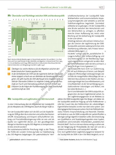 127Mauerfall und „Wende“ in der DDR 1989 –550000 195 1 195 3 195 5 195 7 195 9 196 1 196 3 196 5 196 7 196 9 197 1 197 3 197 5 197 7 197 9 198 1 198 3 198 5 198 7 198 9 150000 –500000 –450000 –400000 –350000 –300000 –250000 –200000 –150000 –100000 –50000 0 50000 100000 Bau der Mauer 13. 08. 61 Zuzüge in die DDR von 1951 bis 1965 1989 1990 Flüchtlinge/Übersiedler aus der DDR von 1949 bis 1961 von 1962 bis 1988 von 1989 bis 1990 3,854 Mio. 0,626 Mio. 0,781 Mio. 622767 5135 36217 Fall der Mauer 09. 11. 89 Nach: Hartmut Wendt, Wanderungen in Deutschland zwischen Ost und West […], in: Paul Ganz und Franz-Josef Kemper (Hrsg.), Mobilität und Migration in Deutschland, Erfurt 1995, S. 6 8, und Matthias Judt (Hrsg.), DDR-Geschichte in Dokumenten. Beschlüsse, Berichte, interne Materialien und Alltagszeugnisse, Berlin 1998, S. 545 f. 1. Überlegen Sie, welche Motive es für die Migration zwischen den beiden deutschen Staaten gegeben hat. 2. In der Zentralkartei der DDR war die registrierte Zahl der Übersiedler immer doppelt so hoch wie von Behörden der Bundesrepublik angegeben. Ab 1966 machte die DDR überhaupt keine Angaben mehr zur Zahl der Übersiedler. Erklären Sie mögliche Gründe, warum das Ausmaß von Flucht und Übersiedlung politisch stets sehr brisant war. 3. Erläutern Sie die Folgen der Fluchtbewegung für Staat, Gesellschaft und Wirtschaft der DDR. M1 Übersiedler und Flüchtlinge zwischen DDR und Bundesrepublik schaftsmechanismus der Sozialpolitik habe Wohlverhalten und konsumorientierte Anpassung hervorgerufen oder verstärkt, so wird die Stabilisierungsthese begründet. Zumindest zeitweise sei es gelungen, mit der Sozialpolitik eine Brücke zwischen den Herrschenden und den Beherrschten zu schlagen, so pfl ichten manche dieser Auffassung bei, meist unter Berufung auf die Aufwertung der Sozialpolitik in den 70er-Jahren. Allerdings betonen alle seriösen Untersuchungen die Grenzen der Legitimierung der DDRSozialpolitik und deren widersprüchlichen, teils Anerkennung stiftenden, teils Protest hervorrufenden Wirkungen. […] Hockerts2 zufolge sind die „sozialistischen Errungenschaften“ wie Vollbeschäftigung und Grundversorgung von der Bevölkerung insgesamt angenommen und genutzt worden. Aber als Herrschaftsstützen seien sie viel zu schwach, wenn nicht gar morsch gewesen. […] Die Sozialpolitik fand nicht nur Zustimmung, sie rief auch Widerspruch hervor, zum Beispiel aufgrund offenkundiger Leistungsmängel, wie im Falle der mangelhaften Altenpfl ege, der verfallenden Bausubstanz in den Städten, der Ausstattungsmängel des Gesundheitswesens, und Unzufriedenheit ob der Vernachlässigung produktionsferner Lebenslagen und Risiken, wie bei vielen Rentnern. […] Damit sind Kehrseiten der DDR-Sozialpolitik angesprochen, die kaum legitimierend wirken. Zu den Legitimierungsgrenzen ist ein Weiteres zu zählen: Die DDR-Sozialpolitik legte ihre Bürger viel stärker als die Sozialpolitik westlicher Prägung auf eine Politiknehmerrolle fest. Soweit dies den Politiknehmer der unbotmäßigen Eigeninitiative beraubte, konnte man darin eine systemund ideologiegerechte Konsequenz sehen. Doch der Politiknehmerstatus förderte Anspruchshaltung und Passivität. Überdies verhinderte er, was die DDR-Sozialpolitik der parteioffi ziellen Ideologie zufolge eigentlich bewirken sollte: die Entwicklung von Qualifi kation und Staatsbürgertugenden einer loyalen, produktiven und konstruktiv mitwirkenden „sozialistischen Persönlichkeit“. Doch von der war ebenso wenig zu sehen wie von der Steigerung der Produktivität, die man sich von der „Einheit von Wirtschaftsund Sozialpolitik“ erhoffte. Eine noch gefährlichere Legitimierungsgrenze bestand für die Sozialpolitik der DDR in dem Ost-West-Vergleich, vor alM2 Sozialpolitik und Legitimation der SED-Herrschaft In einer Untersuchung über die Wirksamkeit der Sozialpolitik für die Akzeptanz des DDR-Regimes durch die Bürger heißt es: Von der Sozialpolitik hatten sich die SED und die Staatsführung der DDR großen ökonomischen und politischen Nutzen erhofft. Voraussetzung und Ansporn wirtschaftlicher Leistung und Produktivitätssteigerung sollte sie sein und als Quelle von Legitimität dienen, um den grundlegenden Mangel an Anerkennung des SED-Regimes zu kompensieren. Ist dies erreicht worden? Die sozialwissenschaftliche Forschung neigt zu der These, die Politik der sozialen Sicherung habe zur Stabilisierung des SED-Regimes beigetragen. Der paternalistische1 Herr1 paternalistisch: väterlich bevormundend 2 Hans Günter Hockerts: deutscher Zeithistoriker (*1943) 5 10 15 20 25 30 35 40 45 50 55 7316_1_1_2015_114-137_Krisen_Revolutionen.indd 127 05.05.15 13:09 Nu r z u Pr üf zw ec ke n Ei ge nt um d es C .C . B uc hn er V er la gs | |