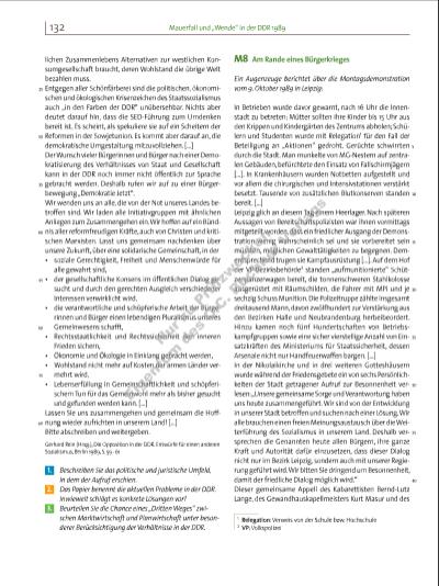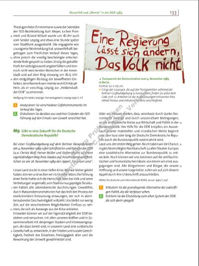 133Mauerfall und „Wende“ in der DDR 1989 Theologen Peter Zimmermann sowie der Sekretäre der SED-Bezirksleitung Kurt Meyer, Jochen Pommert und Roland Wötzel wurde um 18 Uhr auch vom Sender Leipzig und etwa eine Stunde später vom Stadtfunk ausgestrahlt. Die engagierte wie couragierte Wortmeldung hat unzweifelhaft beigetragen zum friedlichen Verlauf dieses Tages, ohne jedoch die voreilig bescheinigte entscheidende Rolle gespielt zu haben. Einzig die geballte Kraft der siebzigtausend angsterfüllten und dennoch nicht weichenden Menschen in der Innenstadt und auf dem Ring erzwang um 18.25 Uhr den endgültigen Rückzug der bewaffneten Einheiten. Jene Namenlosen meinte wohl Christoph Hein, als er vorschlug, Leipzig zur „Heldenstadt der DDR“ zu ernennen. Wolfgang Schneider, Leipziger Demontagebuch, Leipzig 1990, S. 71 f. 1. Analysieren Sie verschiedene Gefahrenmomente im Verlauf des Tages. 2. Diskutieren Sie darüber, aus welchen Gründen die SEDFührung auf den Einsatz von Gewalt verzichtet hat. M9 Gibt es eine Zukunft für die Deutsche Demo kratische Republik? Bei einer Großkundgebung auf dem Berliner Alexanderplatz am 4. November 1989 rufen Schriftsteller und Künstler der DDR (u. a. Christa Wolf, Heiner Müller und Stefan Heym) zu einem eigenständigen Weg ihres Staates auf. Anschließend veröffentlichen sie am 26. November 1989 den Appell „Für unser Land“: Unser Land steckt in einer tiefen Krise. Wie wir bisher gelebt haben, können und wollen wir nicht mehr leben. Die Führung einer Partei hatte sich die Herrschaft über das Volk und seine Vertretungen angemaßt, vom Stalinismus geprägte Strukturen hatten alle Lebensbereiche durchdrungen. Gewaltfrei, durch Massendemonstrationen hat das Volk den Prozess der revolutionären Erneuerung erzwungen, der sich in atemberaubender Geschwindigkeit vollzieht. Uns bleibt nur wenig Zeit, auf die verschiedenen Möglichkeiten Einfl uss zu nehmen, die sich als Auswege aus der Krise anbieten. Entweder können wir auf der Eigenständigkeit der DDR bestehen und versuchen, mit allen unseren Kräften und in Zusammenarbeit mit denjenigen Staaten und Interessengruppen, die dazu bereit sind, in unserem Land eine solidarische Gesellschaft zu entwickeln, in der Frieden und soziale Gerechtigkeit, Freiheit des Einzelnen, Freizügigkeit aller und die Bewahrung der Umwelt gewährleistet sind. Oder wir müssen dulden, dass, veranlasst durch starke ökonomische Zwänge und durch unzumutbare Bedingungen, an die einfl ussreiche Kreise aus Wirtschaft und Politik in der Bundesrepublik ihre Hilfe für die DDR knüpfen, ein Ausverkauf unserer materiellen und moralischen Werte beginnt und über kurz oder lang die Deutsche Demokratische Republik durch die Bundesrepublik vereinnahmt wird. Lasst uns den ersten Weg gehen. Noch haben wir die Chance, in gleichberechtigter Nachbarschaft zu allen Staaten Europas eine sozialistische Alternative zur Bundesrepublik zu entwickeln. Noch können wir uns besinnen auf die antifaschistischen und humanistischen Ideale, von denen wir einst ausgegangen sind. Alle Bürgerinnen und Bürger, die unsere Hoffnung und unsere Sorge teilen, rufen wir auf, sich diesem Appell durch ihre Unterschrift anzuschließen. Blätter für deutsche und internationale Politik, Januar 1990, S. 124 f. 1. Erläutern Sie die grundlegende Alternative der zukünftigen Politik, die die Verfasser sehen. 2. Erörtern Sie die Einstellung zum alten System der DDR, die sich darin spiegelt. i Transparent der Demonstration vom 4. November 1989 in Berlin. Format: 60 x 129 cm. p Einige der Losungen, die auf den Transparenten während der Berliner Großkundgebung zu lesen waren, fi nden Sie unter dem Code 7316-12. Arbeiten Sie die in den Losungen kritisierten Missstände heraus und erläutern Sie diese anschließend. 45 50 55 5 10 15 20 25 30 7316_1_1_2015_114-137_Krisen_Revolutionen.indd 133 05.05.15 13:09 Nu r z u Pr üf zw ec ke n Ei ge nt um d es C .C . B uc hn r V er la gs | |