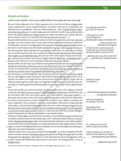 Beispiel und Analyse 135 Joachim Gauck schreibt in seinen 2009 veröffentlichten Erinnerungen über den Herbst 1989: Bis zum Herbst 1989 war ich ein Pastor gewesen, der im kirchlichen Dienst aufging, dabei seinen Jugendlichen, seinen Gesprächskreisen und seiner Gemeinde im Gottesdienst die Wahrheit nicht schuldig blieb – das war in Rostock bekannt –, aber ich gehörte keiner außerkirchlichen Opposition an. Im Herbst 1989 wuchs ich Schritt für Schritt in eine politische Rolle hinein. Der Sturm hatte mich mitgenommen; nie waren wir aktiver als in diesen Wochen. Binnen Kurzem nannte mich eine Rostocker Zeitung „Revolutionspastor“ [...]. Rasend schnell breitete sich aus, was in Sachsen auf die Formel gebracht worden war „Wir sind das Volk“. Ich hörte in diesem Satz mit, was deren Erfi nder 1989 wahrscheinlich noch gar nicht im Kopf hatten. Mit der Ermächtigung der Vielen ging die Ermächtigung des Einzelnen einher. Wer einst nur als Staatsinsasse mit staatlich geregelter Eingangsund Ausgangsordnung aus dem Biotop gelebt hatte, erkannte nun seine Rechte, erklärte sich für zuständig. Die Losung war ein ernster Appell an den, der sie aussprach: Wenn du das Volk bist, also der Souverän, dann trägst du auch Verantwortung. „Wir sind das Volk“ sollte in jedem Klassenzimmer hängen. Gibt es einen schöneren Satz aus dem langen Kampf für Menschenund Bürgerrechte in diesem Land? Gehörte er nicht ins kollektive Gedächtnis der ganzen Nation? Damals wehte mit dem Satz aus Sachsen eine doppelte Botschaft über das Land: Den Einen bestritt sie das Recht zu herrschen, weil sie ohne Recht herrschten, die Anderen forderte sie auf, den nun offenen Raum zu betreten, die Macht, die auf der Straße lag, zu übernehmen, an das Recht zu binden und als frei gewählte Volksvertretung auszuüben. Auch Tausende von Parteimitgliedern der SED spürten die Kraft, die von der Losung ausging. Die neue Mündigkeit wirkte ansteckend. Viele einfache Parteimitglieder protestierten durch Austritt, sie wollten nicht länger Teil einer herrschenden Klasse sein, die als Gegner oder als Feind des Volkes agierte, andere waren ermutigt: Bald würden die reaktionären Bastionen der ideologischen Festung gestürmt, alte Kader gestürzt und sogar aus der Partei ausgeschlossen sein. Sicher wäre all dies auch ohne eine starke Losung geschehen, aber mit ihr ging es schneller und besser. Am Ende wurde aus unserer Protestbewegung eine Revolution. Das Oberste, was für alle Zeiten hatte oben sein wollen, wurde nach unten gekehrt. Ganz ohne Gewalt [...]. Revolution war bis dahin immer mit Gewalt verbunden gewesen. Viele sprechen daher lieber von einem Zusammenbruch, einem Kollaps, einer Implosion, einer Wende, zumindest von einer „friedlichen“, einer „samtenen“ oder einer „verhandelten“ Revolution im Osteuropa des Jahres 1989 [...]. All diese Einschränkungen ändern für mich nichts an der grundlegenden, eine Revolution kennzeichnenden Tatsache, dass eine staatliche Ordnung durch das Volk gestürzt und durch ein neues System ersetzt worden ist – auch wenn kein Blut fl oss und die Aufbegehrenden Transparente und Kerzen statt Waffen in den Händen hielten. Damals, im Herbst 1989, versuchten Partei und Staat noch, die Mobilisierung der Bevölkerung umzuleiten, die Menschen von der Straße wegund in institutionalisierte Bahnen zurückzulenken. Dialogveranstaltungen sollten die Unzufriedenheit auffangen und die Meinungsführerschaft der Partei wiederherstellen. Der stellvertretende Rostocker Bürgermeister erschien sogar in unserem Fürbittgottesdienst am 19. Oktober, um für eine derartige Veranstaltung am folgenden Tag in der Ostseehalle zu werben. Hätte die SED ein Jahr zuvor, etwa auf dem Kirchentag 1988 [...], auf die privilegierte Rolle der Partei verzichtet und einen Parteienpluralismus akzeptiert, wir Bürgerbewegte wären auf das Dialogangebot eingegangen. Jetzt sahen wir in den Herrschenden keinen Dialogpartner mehr, sondern nutzten die öffentlichen Diskussionen in der Sportund Kongresshalle, um sie zu delegitimieren. Joachim Gauck, Winter im Sommer – Frühling im Herbst. Erinnerungen, München 2009, S. 212 214 5 10 15 20 25 30 35 40 45 Einschätzung seiner bisherigen politischen Haltung Erklärung für sein wachsendes Engagement Bewertung der Losung „Wir sind das Volk“ Anders als bisher in der DDR zählt das Individuum Politische Rechte werden beansprucht, bringen aber auch Verantwortung für das gesellschaftliche Handeln mit sich. Zuordnung der Losung „Wir sind das Volk“ zu den Menschenund Bürgerrechten Signalwirkung der Losung Reaktionen einiger SED-Mitglieder Von der Protestbewegung zur Revolution Gewaltfreiheit als Merkmal Alternative Begriffe für die Vorgänge in der DDR Begründung für die Bezeichnung „Revolution“ Der „Dialogversuch“ der SED kommt zu spät und misslingt. Früheres Einlenken der SED hätte Gespräche mit der Opposition ermöglicht. Parteienpluralismus als Forderung „Delegitimierung“ der SED 7316_1_1_2015_114-137_Krisen_Revolutionen.indd 135 05.05.15 13:09 Nu r z u Pr üf zw ec ke n Ei ge nt um de s C .C . B uc hn er V er la gs | |