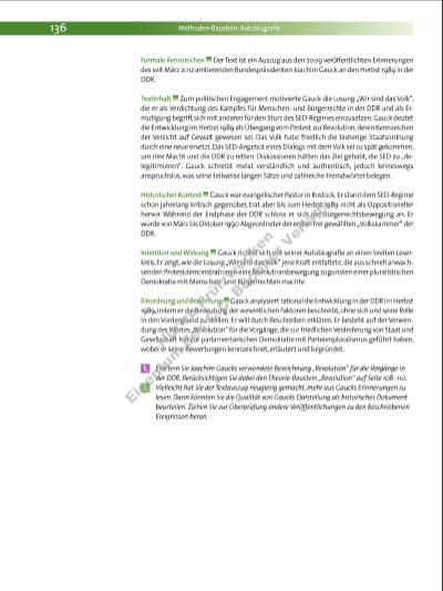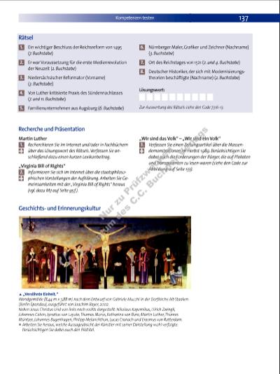 i „Versöhnte Einheit.“ Wandgemälde (8,44 m x 3,88 m) nach dem Entwurf von Gabriele Mucchi in der Dorfkirche Alt-Staaken (Berlin-Spandau), ausgeführt von Joachim Bayer, 2002. Neben Jesus Christus sind von links nach rechts dargestellt: Nikolaus Kopernikus, Ulrich Zwingli, Johannes Calvin, Ignatius von Loyola, Thomas Morus, Katharina von Bora, Martin Luther, Thomas Müntzer, Johannes Bugenhagen, Philipp Melanchthon, Lucas Cranach und Erasmus von Rotterdam. p Arbeiten Sie heraus, welche Aussageabsicht der Künstler mit seiner Darstellung wohl verfolgte. Berücksichtigen Sie dabei auch den Bildtitel. Rätsel Recherche und Präsentation Geschichtsund Erinnerungskultur Martin Luther 1. Recherchieren Sie im Internet und/oder in Fachbüchern über das Lösungswort des Rätsels. Verfassen Sie anschließend dazu einen kurzen Lexikonbeitrag. „Virginia Bill of Rights“ 2. Informieren Sie sich im Internet über die staatsphilosophischen Vorstellungen der Aufklärung. Arbeiten Sie Gemeinsamkeiten mit der „Virginia Bill of Rights“ heraus (vgl. dazu M7 auf Seite 95 f.). 1. Ein wichtiger Beschluss der Reichsreform von 1495 (7. Buchstabe) 2. Er war Voraussetzung für die erste Medienrevolution der Neuzeit (2. Buchstabe) 3. Niedersächsischer Reformator (Vorname) (3. Buchstabe) 4. Von Luther kritisierte Praxis des Sündennachlasses (7. und 11. Buchstabe) 5. Familienunternehmen aus Augsburg (6. Buchstabe) 137Kompetenzen testen 6. Nürnberger Maler, Grafi ker und Zeichner (Nachname) (3. Buchstabe) 7. Ort des Reichstages von 1521 (2. und 4. Buchstabe) 8. Deutscher Historiker, der sich mit Modernisierungstheorien beschäftigte (Nachname) (2. Buchstabe) Lösungswort: Zur Auswertung des Rätsels siehe den Code 7316-13. „Wir sind das Volk“ – „Wir sind ein Volk“ 3. Verfassen Sie einen Zeitungsartikel über die Massendemonstrationen im Herbst 1989. Berücksichtigen Sie dabei auch die Forderungen der Bürger, die auf Plakaten und Transparenten zu lesen waren (siehe den Code zur Abbildung auf Seite 133). 7316_1_1_2015_114-137_Krisen_Revolutionen.indd 137 05.05.15 13:09 Nu r z u Pr üf zw ec ke n Ei ge nt um d es C .C . B uc hn er V er la gs | |
