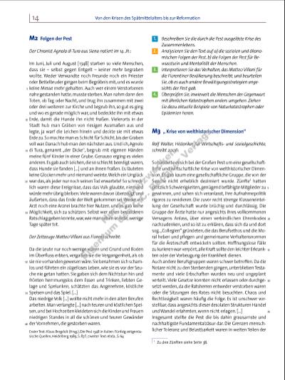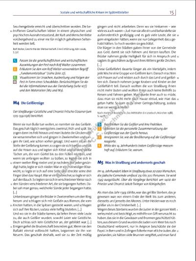 15Soziale und wirtschaftliche Krisen im Spätmittelalter Seuchengebiete erreicht und überschritten worden. Die betroffenen Gesellschaften lebten in einem physischen und psychischen Ausnahmezustand, der Kult und Menschenliebe vorübergehend zu einer nie für möglich gehaltenen Seltenheit werden ließ. Rolf Walter, Geschichte der Weltwirtschaft. Eine Einführung, Köln 2006, S. 77 f. 1. Fassen Sie die gesellschaftlichen und wirtschaftlichen Auswirkungen der Pest nach Rolf Walter zusammen. 2. Erläutern Sie den von Rolf Walter verwendeten Begriff „Fundamentalzäsur“ (siehe Zeile 27). 3. Visualisieren Sie Ursachen, Ausbreitung und Folgen der Pest in Form eines Schaubildes. Berücksichtigen Sie dabei die Informationen aus der Darstellung (Seite 10 f.) und den Materialien (M2 und M3). M4 Die Geißlerzüge Der Straßburger Geistliche und Chronist Fritsche Closener (um 1315-1390/96) berichtet: Wenn sie nun Buße tun wollen, so nannten sie das Geißeln. Das geschah täglich wenigstens zweimal, früh und spät. Sie zogen dann ins Feld hinaus und man läutete die Glocken und sie versammelten sich und gingen in Zweierreihen und sangen ihr Lied, wie schon vorher gesagt. Und wenn sie an die Stelle der Geißelung kamen, so zogen sie sich barfuss und bis auf die Hosen aus und legten sich Kittel oder andere weiße Tücher um, die vom Gürtel bis zu den Füßen reichten, und wenn sie anfangen wollten zu büßen, so legten sie sich in einem weiten Ring nieder und je nachdem wie jeder gesündigt hatte, legte er sich nieder: War er ein meineidiger Bösewicht, so legte er sich auf eine Seite und streckte seine drei Finger über das Haupt. War er ein Ehebrecher, so legte er sich auf den Bauch. So legten sie sich in verschiedener Weise nach den Sünden verschiedener Art, die sie begangen hatten. Dabei sah man genau, welcherlei Sünde jeder begangen hatte. […] Unterdessen gingen die Brüder in Zweierreihen um den Ring herum und schlugen sich mit Geißeln aus Riemen, die vorn Knoten hatten, in die Spitzen gesteckt waren, und schlugen sich auf ihre Rücken, sodass viele heftig bluteten. […] Und wo sie in die Städte kamen, da liefen ihnen viele Leute zu, die auch Geißler wurden, sowohl Laien wie Geistliche. Doch schloss sich kein Geistlicher an, der gebildet war. […] Einigen gefi el die Bruderschaft besonders gut. Wenn sie den Bußakt einmal vollbracht hatten, begannen sie ihn von Neuem. Das geschah deshalb, weil sie zu der Zeit müßig gingen und nicht arbeiteten. Denn wo sie hinkamen – wie viele es auch waren –, lud man sie alle ein und behandelte sie außerordentlich großzügig und es gab viele Leute, die sie gern eingeladen hätten, wenn sie nur Gelegenheit dazu gehabt hätten. So hoch wurden sie geschätzt. Die Bürger in den Städten gaben ihnen von der Gemeinde aus Geld, damit sie sich Fahnen und Kerzen kauften. Die Brüder nahmen große Heiligkeit für sich in Anspruch und sagten: Es geschähen aufgrund ihres Willens große Zeichen. […] Diese Geißelfahrt dauerte länger als ein Vierteljahr, indem jede Woche eine Gruppe von Geißlern kam. Danach machten sich Frauen auf und reisten auch durch das Land und geißelten sich. Danach nahmen junge Knaben und Kinder an der Geißelfahrt teil. Danach wollten die von Straßburg ihnen nicht mehr läuten und wollten ihnen auch keine Beihilfe zu Kerzen und Fahnen geben. Man wurde ihrer auch so müde, dass man sie nicht mehr nach Hause einlud, wie man das getan hatte. So kam es zu einer Geringschätzung, sodass man sie wenig achtete. Nach: Hartmut Boockmann, Das Mittelalter. Ein Lesebuch, München 1988, S. 247 ff. 1. Beschreiben Sie die Geißler und ihre Praktiken. 2. Arbeiten Sie die personelle Zusammensetzung der Geißlerzüge aus der Quelle heraus. 3. Analysieren Sie, wie die Bevölkerung auf die Geißlerzüge reagierte. 4. Mitte des 14. Jahrhunderts traten Geißlerzüge massenhaft auf. Erläutern Sie, warum. M5 Was in Straßburg und andernorts geschah Im 14. Jahrhundert leben in Straßburg etwa 20 000 Menschen, die jüdische Gemeinde umfasst 250 bis 300 Personen. Sie wird 1349 ausgelöscht. Über die Vorgänge berichtet um 1400 der Priester und Chronist Jakob Twinger von Königshofen: Als man das Jahr 1349 zählte, war das größte Sterben, das je gewesen war; von einem Ende der Welt bis zum anderen, diesseits und jenseits des Meeres. Unter Heiden war es noch größer als in der Christenheit. […] Wegen dieses Sterbens wurden die Juden in der ganzen Welt verleumdet und bezichtigt, es mithilfe von Gift verursacht zu haben, das sie in die Gewässer und Brunnen geschüttet hätten; aus diesem Grund wurden die Juden vom Meer bis nach Deutschland verbrannt, nur in Avignon beschützte sie der Papst. In Bern und in Zofi ngen folterte man etliche Juden, die gestanden, sie hätten viele Brunnen vergiftet, und man fand 5 10 15 20 25 5 10 30 30 35 40 45 7316_1_1_2015_008-079_Krisen_Revolutionen.indd 15 05.05.15 12:59 Nu r z u Pr üf zw ec ke n Ei ge nt um d s C .C . B uc hn er V er la gs | |