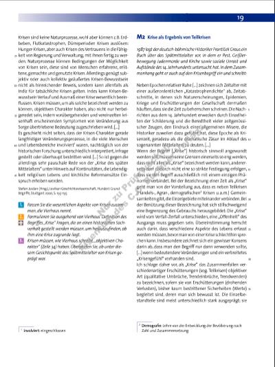 19 Krisen sind keine Naturprozesse, wohl aber können z. B. Erdbeben, Flutkatastrophen, Dürreperioden Krisen auslösen: Hunger-Krisen, aber auch Krisen des Vertrauens in die Fähigkeit von Regierung und Verwaltung, mit ihnen fertig zu werden. Naturprozesse können Bedingungen der Möglichkeit von Krisen sein, diese sind von Menschen erfahrene, erlittene, gemachte und genutzte Krisen. Allerdings genügt subjektiv oder auch kollektiv geäußertes Krisen-Bewusstsein nicht als hinreichender Beweis, sondern kann allenfalls als Indiz für tatsächliche Krisen gelten. Indes kann Krisen-Bewusstsein Verlauf und Ausmaß einer Krise wesentlich beeinfl ussen. Krisen müssen, um als solche bezeichnet werden zu können, objektiven Charakter haben, also nicht nur herbeigeredet sein, indem vorübergehenden und vereinzelten krisenhaft erscheinenden Symptomen von Veränderung aus Sorge übertriebene Bedeutung zugeschrieben wird. […] Es geschieht nicht selten, dass der Krisen-Charakter gerade langfristiger Veränderungsprozesse, in die viele Menschen und Lebensbereiche involviert1 waren, nachträglich von der historischen Forschung unterschiedlich interpretiert, infrage gestellt oder überhaupt bestritten wird. […] So ist gegen die allerdings sehr pauschale Rede von der „Krise des späten Mittelalters“ unter Hinweis auf Kontinuitäten, die Lebendigkeit religiösen Lebens und kirch liche Reformansätze Einspruch erhoben worden. Stefan Jordan (Hrsg.), Lexikon Geschichtswissenschaft. Hundert Grundbegriffe, Stuttgart 2002, S. 193-195 1. Fassen Sie die wesentlichen Aspekte von Krisen zusammen, die Vierhaus nennt. 2. Formulieren Sie ausgehend von Vierhaus’ Defi nition des Begriffes „Krise“ Fragen, die an einen historischen Sachverhalt gestellt werden müssen, um herauszufi nden, ob ihm eine Krise zugrunde liegt. 3. Krisen müssen, wie Vierhaus schreibt, „objektiven Charakter“ (Zeile 34) haben. Überprüfen Sie, ob unter diesem Gesichtspunkt das Spätmittelalter von Krisen geprägt war. M2 Krise als Ergebnis von Teilkrisen 1987 legt der deutsch-böhmische Historiker Frantisˇek Graus ein Buch über das Spätmittelalter vor, in dem er Pest, Geißlerbewegung Judenmorde und Kirche sowie soziale Unrast und Aufstände des 14. Jahrhunderts untersucht hat. In dem Zusammenhang geht er auch auf den Krisenbegriff ein und schreibt: Neben Epochen relativer Ruhe […] zeichnen sich Zeitalter mit einer außerordentlichen „Katastrophendichte“ ab, Zeitabschnitte, in denen sich Naturerscheinungen, Epidemien, Kriege und Erschütterungen der Gesellschaft dermaßen häuften, dass sie die Zeit zu beherrschen scheinen. Die Nachrichten aus dem 14. Jahrhundert erwecken durch Einzelheiten der Schilderung und die Beredtheit vieler zeitgenössischer Zeugen, den Eindruck einer allgemeinen Misere, die Historiker zuweilen dazu geführt hat, diese Epoche als Krisenzeit, geradezu als die dramatische Zäsur im Ablauf des sogenannten Mittelalters zu deuten. […] Wenn der Begriff [„Krise“] historisch sinnvoll angewandt werden soll, müssen seine Grenzen einerseits so eng werden, dass nicht alles als „Krise“ bezeichnet werden kann, andererseits darf dadurch nicht eine so strikte Festlegung erfolgen, dass sie den Begriff ausschließlich mit einem einzigen Phänomen verbindet. Bei der Bezeichnung einer Zeit als „Krise“ geht man von der Vorstellung aus, dass es neben Teilkrisen (Handels-, Agrar-, demogra fi schen2 Krisen u. a. m.) Gemeinsamkeiten gibt, die Einzelgebiete miteinander verbinden. Bei der Benützung dieser Bezeichnung hat sich stillschweigend eine Begrenzung des Gebrauchs herausgebildet: Die „Krise“ wird vom Verfall-Zerfall unterschieden, eine „Offenheit“ des Ausgangs muss gegeben sein. Übereinstimmung herrscht auch darin, dass verschiedene Aspekte des Lebens erfasst werden müssen, bevor man von einer Krise schlechthin sprechen kann. Insbesondere zeichnet sich ein gewisser Konsens darin ab, dass man den Begriff nur dann verwenden sollte, […] wenn bedeutendere Veränderungen und ein verbreitetes „Krisengefühl“ vorhanden sind. Ich schlage daher vor, als „Krise“ das Zusammenfallen verschiedenartiger Erschütterungen (sog. Teilkrisen) objektiver Art (qualitative Umbrüche, Trendeinbrüche, Trendwenden) zu bezeichnen, sofern sie von Erschütterungen (drohenden Verlusten), bisher kaum bestrittener Sicherheiten (Werte) begleitet sind, deren man sich bewusst ist. Die Einzelbestandteile sind meist unterschiedlich stark ausgeprägt; sie 2 Demografi e: Lehre von der Entwicklung der Bevölkerung nach Zahl und Zusammensetzung1 involviert: eingeschlossen 25 30 35 40 45 5 10 15 20 25 30 35 7316_1_1_2015_008-079_Krisen_Revolutionen.indd 19 05.05.15 12:59 Nu r z u Pr üf zw ec ke n Ei ge nt um d es C .C . B uc hn er V er la gs | |
