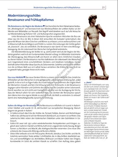 21Modernisierungsschübe: Renaissance und Frühkapitalismus Modernisierungsschübe: Renaissance und Frühkapitalismus Die Renaissance, der Beginn der Moderne Das französische Wort Renaissance bedeutet „Wiedergeburt“ und kennzeichnet das Wiederaufl eben der antiken Kultur an der Wende vom Mittelalter zur Neuzeit. Der Begriff wird daneben auch auf alle Versuche zur Wieder belebung früherer Stilund Kulturepochen angewendet. Unter Renaissance als einer historischen Epoche verstehen Historiker die Ära von etwa 1350 bis 1600 (u M1). In dieser Zeit versuchten die Europäer systematisch, das gesamte Wissen der alten Griechen und Römer zu erfassen, um es weiterzuführen und in Wissenschaft, Kunst, Religion und Politik zu nutzen. Die Leistungen der Antike galten als „klassisch“, also als vorbildlich. Die Renaissance war damit im Kern eine Bildungsbewegung, die die Lebenswelt der Menschen tief greifend veränderte. Die Wiederentdeckung der Antike im 14. Jahrhundert wird als der Beginn der Moderne gesehen, weil sich ein fundamentaler Wandel vollzog. Im Mittelalter dominierte die Überzeugung, dass Wissenschaft und Kunst vor allem dem christlichen Glauben zu dienen hatten. Die Renaissance machte stattdessen die Lebenswelt des Menschen zum Gegenstand eines vorurteilsfreien Denkens und kreativen Gestaltens. Genau deshalb sehen Historiker diese Epoche als Zeitenwende. Gelehrte und Künstler wollten nun die sichtbare Welt aus sich selbst heraus verstehen. Die Erklärung, dass Gott sie so gewollt habe, genügte ihnen nicht mehr. Das neue Weltbild Das neue Denken führte zu einem neuen Weltbild. Das christliche Mittelalter sah den Menschen in eine gottgewollte, unwandelbare Ordnung (lat.: ordo) gestellt, in die er sich zu fügen hatte. Auch Leid hatte er hinzunehmen, die Ungleichheit der Menschen, Gewalt und Not. Die Erlösung kam erst im Jenseits. In der Renaissance dagegen sahen Künstler und Gelehrte den Menschen als Gestalter seiner Lebenswelt. Damit wandten sie sich nicht vom Evangelium ab, aber von der Auslegung der Kirche, dass der Mensch allein für sein Seelenheil lebe. Das Denken der Renaissance sprach dem Menschen eine eigene Würde zu und die Kraft, die Welt zu verändern. Es entwarf damit eine menschengewollte, dyna mische Ordnung. Italien: die Wiege der Renaissance Die Renaissance entfaltete sich zuerst in italienischen Städten und wurde im 16. Jahrhundert zur europäischen Bewegung. Warum begann sie gerade in Italien? • In Italien erlosch das Erbe der Antike nie. Tempel, Paläste, Arenen und Wohnhäuser hatten das Jahrtausend seit der Römerzeit überdauert, auch wenn sie zerfi elen. Das Lateinische blieb neben den italienischen Dialekten unter den Gebildeten in Gebrauch. • Italien litt zwar seit 1350 un ter wiederkehrenden Pestepidemien und Kriegen, zugleich aber nahmen Handel und Wirtschaft einen ungeahnten Aufschwung. Bürger kamen zu Reichtum und Macht, alte Adelsgeschlechter verarmten. Eine neue Elite entstand, die niveauvolle Bildung und Kunst schätzte. • Diese Elite befasste sich mit Philosophie, Rhetorik, Literatur, Geschichte und Recht. Gelehrte sammelten Texte antiker Schriftsteller, die in Abschriften überliefert waren, und verviel fältigten sie. Architekten, Bildhauer und Maler hatten den Ehrgeiz, Kunstwerke im Geist der antiken Klassik zu schaffen. Den Auftrag dazu gaben i „David.“ Statue von Michelangelo, 1501-1504. Die fast sechs Tonnen schwere Figur war ursprünglich für eine Kirchenfassade gedacht. Sie fand dann aber ihren Platz vor dem Regierungsgebäude von Florenz. Das Original befi ndet sich heute in der Galleria dell’ Accademia. Michelangelo schuf die erste nachantike Kolossalfi gur aus Marmor (5,17 m hoch). Er bildete David anders als üblich nicht als Sieger, sondern vor dem Kampf mit Goliath ab. Die Gestaltung weicht provozierend von der antiken Klassik ab mit übergroßen Händen und Füßen, plastisch hervortretenden Adern und sichtbaren Muskeln. Nebenbei: Die biblische Figur des David diente mehreren Renaissancekünstlern als Motiv. Mit dem Hirtenjungen David erinnerte man die mächtigen Fürsten an die Stärke und Kampfbereitschaft der kleinen städtischen Führungsschicht. Zur Rolle der Städte siehe Seite 36 38. 7316_1_1_2015_008-079_Krisen_Revolutionen.indd 21 05.05.15 12:59 Nu r z u Pr üf zw ec ke n Ei ge nt um de s C .C . B uc hn er V er la gs | |