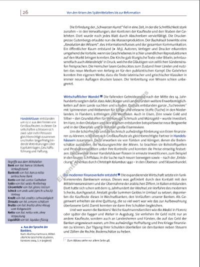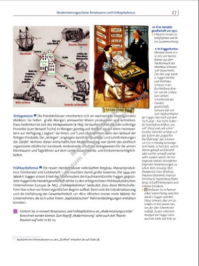 27Modernisierungsschübe: Renaissance und Frühkapitalismus Verlagswesen Die Handelshäuser orientierten sich an wachsenden überregionalen Märkten. Sie ließen große Mengen preiswerter Waren produzieren und vertreiben. Dazu bedienten sie sich des Verlagswesens (u M4). Sie kauften Rohstoffe oder unfertige Produkte (zum Beispiel Tuche) in Mengen günstig auf, stellten sie vor allem Heimwerkern zur Verfügung („legten“ sie ihnen „vor“) und übernahmen dann den Verkauf der fertigen Produkte. Die „Verleger“ umgingen damit die Qualitätsund Lohnforderungen der Zünfte1. Verlierer dieser wirtschaftlichen Modernisierung war damit das zünftisch organisierte städtische Handwerk. Andererseits schuf das Verlagswesen für die armen Kleinbauern und Tagelöhner auf dem Lande neue Erwerbsund Einkommensmöglichkeiten. Frühkapitalismus Die neuen Handelshäuser verknüpften Bergbau, Massenproduktion, Fernhandel und Geldverleih – und machten damit große Gewinne. Die 1494 von Jakob II. Fugger, einem Enkel des Stammvaters der Kaufmannsfamilie Fugger, gegründete Fugger’sche Handelsgesellschaft zählte zu den erfolgreichsten frühkapitalistischen Unternehmen Europas (u M5). „Frühkapitalismus“ bedeutet, dass diese Wirtschaftsform hier schon vor ihrem eigentlichen Beginn auftrat. Denn erst die Industrialisierung und die Einführung der Gewerbefreiheit um 1800 öffneten immer mehr Märkte für Unternehmen, die sich unter freien „kapitalistischen“ Rahmenbedingungen entfalten konnten. Erörtern Sie, in wieweit Renaissance und Frühkapitalismus als „Modernisierungsschübe“ bezeichnet werden können. Zum Begriff „Modernisierung“ siehe auch den Theorie Baustein auf Seite 111 bis 113. 1 Ausführliche Informationen zu den „Zünften“ erhalten Sie auf Seite 38. o Im Fuggerkontor. Miniatur (etwa 16 x 10 cm) von Narziss Renner aus dem Trachtenbuch des Matthäus Schwarz, 1526 (Ausschnitt). Das Bild zeigt Jakob II. Fugger (rechts) und Matthäus Schwarz in der Buchhaltung (Kontor: von lat. computare: zählen; Schreibstube der Handelsgesellschaft). Schwarz war seit 1516 Chefbuchhalter der Fugger. Das Buch auf dem Tisch zeigt – hier nicht lesbar – die Seitenüberschriften „uns soll“ (links) und „wir sollen“ (rechts). Dahinter verbirgt sich das System der „doppelten Buchführung“, das Schwarz vor 1517 in Venedig kennengelernt hatte. Es hielt fest, welche Waren gekauft und bezahlt oder welche verkauft und bezahlt worden waren. Im Hintergrund sind die Aktenfächer folgender Niederlassungen zu sehen: Rom, Venedig, Ofen (Budapest), Craca (Krakau), Mayland (Mailand), Inspruck (Innsbruck), Nuerenberg (Nürnberg), Antorff (Antwerpen) und Lisbona (Lissabon). p Verfassen Sie in Partnerarbeit einen Dialog zwischen Jakob II. Fugger und Matthäus Schwarz über ein Geschäft z. B. mit einem Fürsten, der über Silberminen verfügt. Zu den Unternehmungen der Fugger siehe auch die Karte auf Seite 32. oo Eine Handelsgesellschaft um 1500. p Erläutern Sie die Geschäftsfelder und ihren Zusammenhang. 7316_1_1_2015_008-079_Krisen_Revolutionen.indd 27 05.05.15 12:59 Nu r z u Pr üf zw ck en Ei ge nt um d es C .C . B uc hn er V er la gs | |