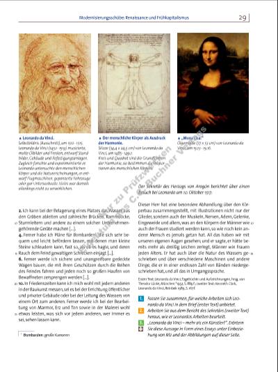 29Modernisierungsschübe: Renaissance und Frühkapitalismus 2. Ich kann bei der Belagerung eines Platzes das Wasser aus den Gräben ableiten und zahlreiche Brücken, Rammböcke, Sturmleitern und andere zu einem solchen Unternehmengehörende Geräte machen […]. 4. Ferner habe ich Pläne für Bombarden1, die sich sehr bequem und leicht befördern lassen, mit denen man kleine Steine schleudern kann, fast so, als ob es hagle, und deren Rauch dem Feind gewaltigen Schrecken einjagt […]. 6. Ferner werde ich sichere und unangreifbare gedeckte Wagen bauen, die mit ihren Geschützen durch die Reihen des Feindes fahren und jeden noch so großen Haufen von Bewaffneten zersprengen werden […]. 10. In Friedenszeiten kann ich mich wohl mit jedem anderen in der Baukunst messen, sei es bei der Errichtung öffentlicher und privater Gebäude oder bei der Leitung des Wassers von einem Ort zum anderen. Ferner werde ich bei der Bearbeitung von Marmor, Erz und Ton sowie in der Malerei wohl etwas leisten, was sich vor jedem anderen, wer immer es sei, sehen lassen kann. Der Sekretär des Herzogs von Aragón berichtet über einen Besuch bei Leonardo am 10. Oktober 1517: Dieser Herr hat eine besondere Abhandlung über den Körperbau zusammengestellt, mit Illustrationen nicht nur der Glieder, sondern auch der Muskeln, Nerven, Adern, Gelenke, Eingeweide und allem, was an den Körpern der Männer wie auch der Frauen studiert werden kann, so wie noch kein anderer Mensch es jemals getan hat. All das haben wir mit unseren eigenen Augen gesehen; und er sagte, er hätte bereits mehr als dreißig Leichen zerlegt, Männer wie Frauen jeden Alters. Er hat auch über die Natur des Wassers geschrieben und über verschiedene Maschinen und andere Dinge, die er in einer endlosen Zahl von Bänden niedergeschrieben hat, und all das in Umgangssprache. Erster Text: Leonardo da Vinci, Tagebücher und Aufzeichnungen, hrsg. von Theodor Lücke, München 21952, S. 889 f.; zweiter Text: Kenneth Clark, Leonardo da Vinci, Reinbek 1989, S. 167 f. 1. Fassen Sie zusammen, für welche Arbeiten sich Leonardo da Vinci in dem Brief (erster Text) anbietet. 2. Arbeiten Sie aus dem Bericht des Sekretärs (zweiter Text) heraus, wie er Leonardos Arbeiten beurteilt. 3. „Leonardo da Vinci – mehr als ein Künstler?“. Erörtern Sie diese Aussage in Form eines Essays unter Einbeziehung von M2 und der Abbildungen auf dieser Seite. 1 Bombarden: große Kanonen i Leonardo da Vinci. Selbstbildnis (Ausschnitt), um 1512 1515. Leonardo da Vinci (1452 1519) musizierte, malte Ölbilder und Fresken, entwarf Standbilder, Gebäude und Befestigungsanlagen. Zugleich forschte und experimentierte er. Leonardo untersuchte den menschlichen Körper und die Naturerscheinungen, er entwarf Flugmaschinen, gepanzerte Fahrzeuge oder gar Unterseeboote. Vieles war damals allerdings nicht zu verwirklichen. i Der menschliche Körper als Ausdruck der Harmonie. Skizze (34,4 x 24,5 cm) von Leonardo da Vinci, um 1485 1490. Kreis und Quadrat sind die Grundformen der Harmonie, sie bestimmen die Proportionen des menschlichen Körpers. i „Mona Lisa.“ Ölgemälde (77 x 53 cm) von Leonardo da Vinci, um 1503 1506. 10 15 20 25 30 35 7316_1_1_2015_008-079_Krisen_Revolutionen.indd 29 05.05.15 12:59 Nu r z u Pr üf zw ec ke n Ei ge nt um d es C .C . B uc hn er V er la gs | |