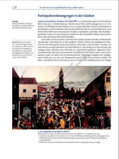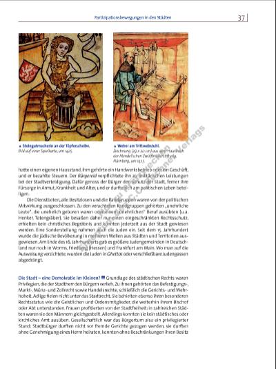 37Partizipationsbewegungen in den Städten hatte einen eigenen Hausstand, ihm gehörte ein Handwerksbetrieb oder ein Geschäft, und er bezahlte Steuern. Der Bürgereid verpfl ichtete ihn zu militärischen Leis tungen bei der Stadtverteidigung. Dafür genoss der Bürger den Schutz der Stadt, ferner ihre Fürsorge in Armut, Krankheit und Alter, und er durfte sich am politischen Leben beteiligen. Die Dienstboten, alle Besitzlosen und die Randgruppen waren von der politischen Mitwirkung ausgeschlossen. Zu den verachteten Randgruppen gehörten „unehrliche Leute“, die unehelich geboren waren oder einen „unehrlichen“ Beruf ausübten (u. a. Henker, Totengräber). Sie besaßen daher nur einen eingeschränkten Rechtsschutz, erhielten kein christliches Begräbnis und konnten jederzeit aus der Stadt gewiesen werden. Eine Sonderstellung nahmen auch die Juden ein. Seit dem 15. Jahrhundert wurde die jüdische Bevölkerung in mehreren Wellen aus Städten und Terri torien ausgewiesen. Am Ende des 16. Jahrhunderts gab es größere Judengemeinden in Deutschland nur noch in Worms, Friedberg (Hessen) und Frankfurt am Main. Wo man auf die Ausweisung verzichtete, wurden die Juden in Ghettos oder verschließbare Judengassen abgedrängt. Die Stadt – eine Demokratie im Kleinen? Grundlage des städtischen Rechts waren Privilegien, die der Stadtherr den Bürgern verlieh. Zu ihnen gehörten das Befestigungs-, Markt-, Münzund Zollrecht sowie Handelsrechte, schließlich die Gerichtsund Wehrhoheit. Adlige fi elen nicht unter das Stadtrecht. Sie behielten ebenso ihren besonderen Rechtsstatus wie die Geistlichen und Ordensmitglieder, die weiterhin ihrem Bischof oder Abt unterstanden. Frauen profi tierten von der Stadtfreiheit; in zahlreichen Städten waren sie den Männern gleichgestellt. Allerdings konnten sie kein städtisches oder kirchliches Amt ausüben. Gesellschaftlich war das Bürgertum also ein privilegierter Stand: Stadtbürger durften nicht vor fremde Gerichte gezogen werden, sie durften ohne Genehmigung eines Herrn heiraten, konnten ohne Beschränkungen ihren Besitz i Steingutmacherin an der Töpferscheibe. Bild auf einer Spielkarte, um 1425. i Weber am Trittwebstuhl. Zeichnung (29 x 20 cm) aus dem Hausbuch der Mendel’schen Zwölfbrüderstiftung, Nürnberg, um 1425. 7316_1_1_2015_008-079_Krisen_Revolutionen.indd 37 05.05.15 12:59 Nu r z u Pr üf zw ec ke n Ei ge nt um d es C .C . B uc hn er Ve rla gs | |