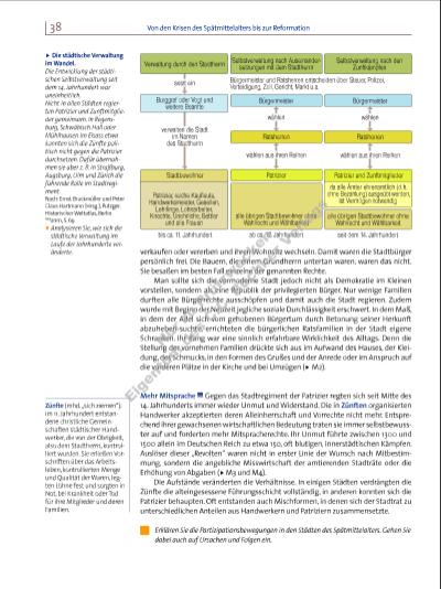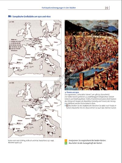 39Partizipationsbewegungen in den Städten M1 Europäische Großstädte um 1500 und 1600 1. Analysieren Sie vergleichend die beiden Karten. 2. Beurteilen Sie die Aussagekraft der Karten. Karten nach: Hein Schilling, Aufbruch und Krise. Deutschland 1517 1648, München 1998, S. 54 f. i Florenz um 1500. Die sogenannte „Carta della Catena“, um 1482/92 (Ausschnitt). Die Städte Italiens gehörten zu unabhängigen Königreichen, Fürstentümern und Stadtrepubliken. Politisch bestimmend waren fünf Staaten: das Königreich Neapel, die Republiken Venedig und Florenz, das Herzogtum Mailand und der Kirchenstaat in Rom. p Beschreiben Sie die Stadtansicht. Beziehen Sie dabei noch heute erhaltene Bauwerke mit ein. Dazu können Sie auch das Internet nutzen. 7316_1_1_2015_008-079_Krisen_Revolutionen.indd 39 05.05.15 13:00 Nu r z u Pr üf zw ec ke n Ei ge nt um d es C .C . B uc hn er V er la gs | |