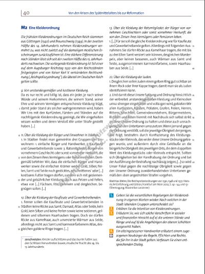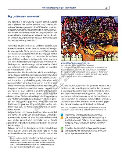 41Partizipationsbewegungen in den Städten M3 „In übler Weise bevormundet“ 1374 kommt es in Braunschweig zu einem Konfl ikt zwischen den Zünften und dem Stadtrat. Er weitet sich zu einem Zunftaufstand aus, der sogenannten „Schicht“. Bei einer Versammlung des nur von Patriziern besetzten Rates mit den Zunftmeistern werden mehrere Ratsherren von Zunftmitgliedern und anderen Bürgern getötet oder vertrieben. Im Sommer des Jahres schreiben die Zunftmeister der Bäcker an ihre Amtskollegen in Lüneburg, Hamburg und Lübeck: Aufrichtige Leute haben uns zu verstehen gegeben, dass Eure Ratsherren mit anderen Räten der Seestädte übereingekommen sind, alle Zünfte und die gesamte Stadtgemeinde von Braunschweig wegen der Schicht, die dort gegen den Rat geschehen ist, zu verfolgen; und zwar sollen die Kaufl eute und alle Bürger von Braunschweig aus der Hanse1 verwiesen und ihnen ihre Rechte in allen Regionen genommen werden. Die Bürger und ihr Kaufmannsgut sollen in jeder Stadt Geleit und Sicherheit verlieren, und in allen Städten soll man über sie wie über Mörder richten. Wisst nun aber, liebe Freunde, dass alle Zünfte und die gesamte Bürgerschaft in Braunschweig in außergewöhnlichem Maße von dem früheren Rat beschwert und bedrückt worden sind, indem er große Willkür gezeigt hat und uns nicht zu unserem Recht verhalf. Auch wurden wir vom Rat in übler Weise bevormundet; denn die Ratsherren hatten viele Jahre lang durch Sondersteuern viel Geld von uns eingenommen und hatten die Stadt trotzdem in große Schulden gebracht, was wir wohl beweisen können. Darüber hinaus hatte der Rat zuletzt den Zünften und der Bürgerschaft neue Abgaben und Pfl ichten auferlegt, […] wie dies zuvor nicht üblich gewesen war. Dies geschah gegen die Freiheit der Stadt, der Zünfte und der gesamten Bürgerschaft. Insbesondere wollten sie neue Maße für Wein und Bier einführen, um sie kleiner zu machen. Aufgrund dieser und vieler anderer Nöte, mit denen der Rat alle Zünfte und Bürger von Braunschweig zu Unrecht beschwert hatte, ist dem Rat diese Schicht widerfahren. Und zwar ist alles ganz öffentlich mit Urteilen und vor Gericht geschehen; folglich tun uns alle Unrecht, die uns deshalb für Mörder halten. […] Falls uns nunmehr die Seestädte aus der Gemeinschaft der Hanse ausschließen und uns und unsere Habe für friedlos erklären wollen, so tun sie uns großes Unrecht. Darum bitten wir, liebe Freunde, dass ihr um des gemeinen Nutzens, des Friedens und aller aufrichtigen Leute willen, die in Eurer und in unserer Zunft sind, die ehrbaren Ratsherren in Güte bittet, dass sie uns und anderen Zunftmitgliedern […] nicht Unrecht tun oder uns zu Feinden werden, da wir Euch und ihnen, so sie sich freundlich mit uns halten wollen, mit Liebe und Güte zu Diensten sein wollen. Dafür wollen wir uns Euch gegenüber dankbar erweisen; und bitten Euch um Antwort. Nach: Klaus Arnold (Bearb.), Das Mittelalter. Quellen zur deutschen und europäischen Geschichte vom 8.-15. Jahrhundert, Paderborn 1991, S. 81 f. 1. Fassen Sie die Gründe des Konfl iktes zusammen. 2. 1386 wurde einigen Zünften doch noch der Einzug in den Stadtrat erlaubt. Erläutern Sie, mit welcher Zielsetzung diese Beteiligung von den Zünften angestrebt wurde. 3. Entwickeln Sie eine mögliche Gegenposition zu dem Brief aus Sicht eines Ratsherrn. Gehen Sie dabei auch auf die Argumente der Bäcker ein. 5 10 15 20 25 30 35 40 i Die „Kölner Weberschlacht“ von 1371. Nachträglich kolorierter Holzschnitt von 1499. Der Protest der Zünfte löste im 14. Jahrhundert in vielen Städten Bürgerkämpfe aus. In Köln führten die Weber den Protest gegen den patrizischen Rat an. In einer Schlacht gewannen die Vertreter der alten Oberschicht die Herrschaft über die Stadt zurück und bestraften die aufständischen Handwerker hart. 1 Hanse: zunächst eine Gemeinschaft von Kaufl euten im Ostund Nordseeraum. Unter Führung Lübecks entstand um die Mitte des 13. Jahrhunderts ein Bund von freien Hansestädten, der bis zum 15. Jahrhundert im Ostseeraum den Handel beherrschte und zugleich eine starke politische Macht war. 7316_1_1_2015_008-079_Krisen_Revolutionen.indd 41 05.05.15 13:00 N r z u Pr üf zw ec ke n Ei ge nt um d es C .C . B uc hn er V er la gs | |