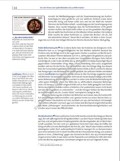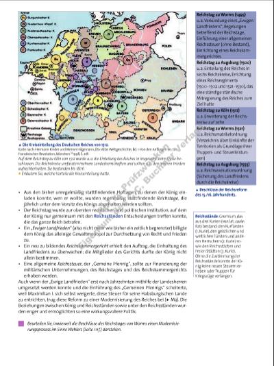 • Aus den bisher unregelmäßig stattfi ndenden Hoftagen, zu denen der König einladen konnte, wen er wollte, wurden regelmäßig stattfi ndende Reichstage, die jährlich unter dem Vorsitz des Königs abgehalten werden sollten. • Der Reichstag wurde zur obersten rechtlichen und politischen Institution, auf dem der König nur gemeinsam mit den Reichsständen Entscheidungen treffen konnte, die das ganze Reich betrafen. • Ein „Ewiger Landfrieden“ (also nicht mehr wie bisher ein zeitlich begrenzter) billigte dem König das alleinige Gewaltmonopol zur Durchsetzung von Recht und Frieden zu. • Ein neu zu bildendes Reichskammergericht erhielt den Auftrag, die Einhaltung des Landfriedens zu überwachen; die Mitglieder des Gerichts durfte der König nicht allein bestimmen. • Eine allgemeine Reichssteuer, der „Gemeine Pfennig“, sollte zur Finanzierung der militärischen Unternehmungen, des Reichstages und des Reichskammergerichts erhoben werden. Auch wenn der „Ewige Landfrieden“ erst nach Jahrzehnten mithilfe der Landesherren umgesetzt werden konnte und die Einführung des „Gemeinen Pfennigs“ scheiterte, weil Maximilian I. sich selbst weigerte, diese Steuer für seine Habsburgischen Lande zu entrichten, trug diese Reform zu einer Modernisierung des Reiches bei (u M3). Die Beziehungen zwischen König und Reichsständen sowie unter den Reichsständen wurden enger und ermöglichten so eine wirkungsvollere Politik. Beurteilen Sie, inwieweit die Beschlüsse des Reichstages von Worms einen Modernisierungsprozess im Sinne Wehlers (Seite 111 f.) darstellen. Reichsstände: Gremium, das aus drei Kurien (von lat. curia: Rat) bestand: den Kurfürsten (1. Kurie), den geistlichen und weltlichen Fürsten und anderen Herrschern (2. Kurie) sowie den Reichsstädten und Freien Städten (3. Kurie). Ohne die Zustimmung der Reichsstände konnte der König keine neuen Steuern erheben oder Truppen für Kriegszüge verlangen. i Die Kreiseinteilung des Deutschen Reiches von 1512. Karte nach: Hermann Kinder und Werner Hilgemann, Dtv-Atlas Weltgeschichte, Bd. 1: Von den Anfängen bis zur Französischen Revolution, München 321998, S. 218 Auf dem Reichstag zu Köln von 1512 wurde u. a. die Einteilung des Reiches in insgesamt zehn Kreise beschlossen. Die Reichskreise umfassten mehrere Landesherrschaften und sollten u. a. den inneren Frieden aufrechterhalten. Sie bestanden bis 1806. p Erläutern Sie, welche Vorteile die Kreiseinteilung hatte. i Beschlüsse der Reichsreform des 15./16. Jahrhunderts. Reichstag zu Worms (1495) u. a. Verkündung eines „Ewigen Landfriedens“, Regelungen betreffend der Reichstage, Einführung einer allgemeinen Reichssteuer (ohne Bestand), Einrichtung eines Reichskammergerichtes Reichstag zu Augsburg (1500) u. a. Einteilung des Reiches in sechs Reichskreise, Errichtung eines Reichsregiments (1500 1502 und 1521 1530), das eine ständige ständische Mitregierung des Reiches zum Ziel hatte Reichstag zu Köln (1512) u. a. Erweiterung der Reichskreise auf zehn Reichstag zu Worms (1521) u. a. Reichsmatrikelordnung (Verzeichnis über Einkünfte der Territorien als Grundlage ihrer Truppenund Steuerleistungen) Reichstag zu Augsburg (1555) u. a. Reichsexekutionsordnung (Sicherung des Landfriedens durch die Reichskreise) 7316_1_1_2015_008-079_Krisen_Revolutionen.indd 45 05.05.15 13:00 Nu r z u Pr üf zw ec ke Ei ge nt um d es C .C . B uc hn er V er la gs | |
