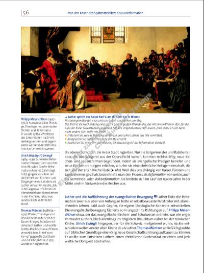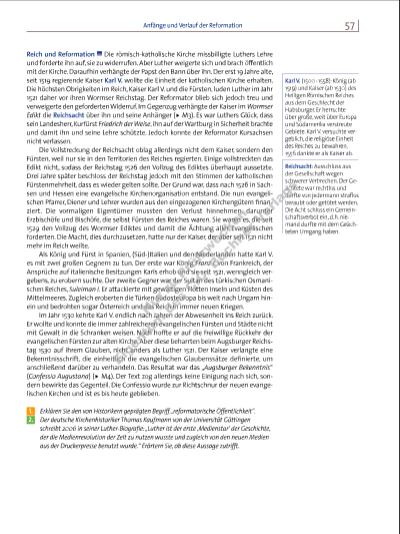 57Anfänge und Verlauf der Reformation Reich und Reformation Die römisch-katholische Kirche missbilligte Luthers Lehre und forderte ihn auf, sie zu widerrufen. Aber Luther weigerte sich und brach öffentlich mit der Kirche. Daraufhin verhängte der Papst den Bann über ihn. Der erst 19 Jahre alte, seit 1519 regierende Kaiser Karl V. wollte die Einheit der katholischen Kirche erhalten. Die höchsten Obrigkeiten im Reich, Kaiser Karl V. und die Fürsten, luden Luther im Jahr 1521 daher vor ihren Wormser Reichstag. Der Reformator blieb sich jedoch treu und verweigerte den geforderten Widerruf. Im Gegenzug verhängte der Kaiser im Wormser Edikt die Reichsacht über ihn und seine Anhänger (u M3). Es war Luthers Glück, dass sein Landesherr, Kurfürst Friedrich der Weise, ihn auf der Wartburg in Sicherheit brachte und damit ihn und seine Lehre schützte. Jedoch konnte der Reformator Kursachsen nicht verlassen. Die Vollstreckung der Reichsacht oblag allerdings nicht dem Kaiser, sondern den Fürsten, weil nur sie in den Territorien des Reiches regierten. Einige vollstreckten das Edikt nicht, sodass der Reichstag 1526 den Vollzug des Ediktes überhaupt aussetzte. Drei Jahre später beschloss der Reichstag jedoch mit den Stimmen der katholischen Fürstenmehrheit, dass es wieder gelten sollte. Der Grund war, dass nach 1526 in Sachsen und Hessen eine evangelische Kirchenorganisation entstand. Die nun evangelischen Pfarrer, Diener und Lehrer wurden aus den eingezogenen Kirchengütern fi nanziert. Die vormaligen Eigentümer mussten den Verlust hinnehmen, darunter Erzbischöfe und Bischöfe, die selbst Fürsten des Reiches waren. Sie waren es, die seit 1529 den Vollzug des Wormser Ediktes und damit die Ächtung aller Evangelischen forderten. Die Macht, dies durchzusetzen, hatte nur der Kaiser, der aber seit 1521 nicht mehr im Reich weilte. Als König und Fürst in Spanien, (Süd-)Italien und den Niederlanden hatte Karl V. es mit zwei großen Gegnern zu tun. Der erste war König Franz I. von Frankreich, der Ansprüche auf italienische Besitzungen Karls erhob und sie seit 1521, wenngleich vergebens, zu erobern suchte. Der zweite Gegner war der Sultan des türkischen Osmanischen Reiches, Suleiman I. Er attackierte mit gewaltigen Flotten Inseln und Küsten des Mittelmeeres. Zugleich eroberten die Türken Südosteuropa bis weit nach Ungarn hinein und bedrohten sogar Österreich und das Reich in immer neuen Kriegen. Im Jahr 1530 kehrte Karl V. endlich nach Jahren der Abwesenheit ins Reich zurück. Er wollte und konnte die immer zahlreicheren evangelischen Fürsten und Städte nicht mit Gewalt in die Schranken weisen. Noch hoffte er auf die freiwillige Rückkehr der evangelischen Fürsten zur alten Kirche. Aber diese beharrten beim Augsburger Reichstag 1530 auf ihrem Glauben, nicht anders als Luther 1521. Der Kaiser verlangte eine Bekenntnisschrift, die einheitlich die evangelischen Glaubenssätze defi nierte, um anschließend darüber zu verhandeln. Das Resultat war das „Augsburger Bekenntnis“ (Confessio Augustana) (u M4). Der Text zog allerdings keine Einigung nach sich, sondern bewirkte das Gegenteil. Die Confessio wurde zur Richtschnur der neuen evangelischen Kirchen und ist es bis heute geblieben. 1. Erklären Sie den von Historikern geprägten Begriff „reformatorische Öffentlichkeit“. 2. Der deutsche Kirchenhistoriker Thomas Kaufmann von der Universität Göttingen schreibt 2006 in seiner Luther-Biografi e: „Luther ist der erste ,Medienstar‘ der Geschichte, der die Medienrevolution der Zeit zu nutzen wusste und zugleich von den neuen Medien aus der Druckerpresse benutzt wurde.“ Erörtern Sie, ob diese Aussage zutrifft. Karl V. (1500 1558): König (ab 1519) und Kaiser (ab 1530) des Heiligen Römischen Reiches aus dem Geschlecht der Habsburger. Er herrschte über große, weit über Europa und Südamerika verstreute Gebiete. Karl V. versuchte vergeblich, die religiöse Einheit des Reiches zu bewahren. 1556 dankte er als Kaiser ab. Reichsacht: Ausschluss aus der Gesellschaft wegen schwerer Verbrechen. Der Geächtete war rechtlos und durfte von jedermann strafl os beraubt oder getötet werden. Die Acht schloss ein Gemeinschaftsverbot ein, d. h. niemand durfte mit dem Geächteten Umgang haben. 7316_1_1_2015_008-079_Krisen_Revolutionen.indd 57 05.05.15 13:00 Nu r z u Pr üf zw ec ke n Ei ge nt um d es C .C . B uc hn er V er la gs | |