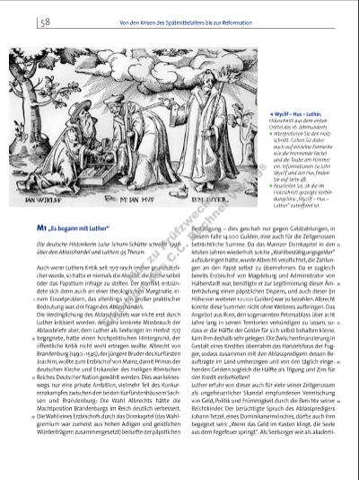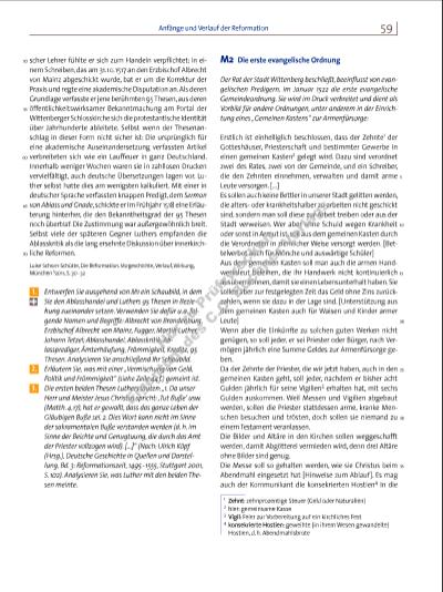 59Anfänge und Verlauf der Reformation 50 55 60 65 70 scher Lehrer fühlte er sich zum Handeln verpfl ichtet; in einem Schreiben, das am 31. 10. 1517 an den Erzbischof Albrecht von Mainz abgeschickt wurde, bat er um die Korrektur der Praxis und regte eine akademische Disputation an. Als deren Grundlage verfasste er jene berühmten 95 Thesen, aus deren öffentlichkeitswirksamer Bekanntmachung am Portal der Wittenberger Schlosskirche sich die protestantische Identität über Jahrhunderte ableitete. Selbst wenn der Thesenanschlag in dieser Form nicht sicher ist: Die ursprünglich für eine akademische Auseinandersetzung verfassten Artikel verbreiteten sich wie ein Lauffeuer in ganz Deutschland. Innerhalb weniger Wochen waren sie in zahllosen Drucken vervielfältigt, auch deutsche Übersetzungen lagen vor. Luther selbst hatte dies am wenigsten kalkuliert. Mit einer in deutscher Sprache verfassten knappen Predigt, dem Sermon von Ablass und Gnade, schickte er im Frühjahr 1518 eine Erläuterung hinterher, die den Bekanntheitsgrad der 95 Thesen noch übertraf. Die Zustimmung war außergewöhnlich breit. Selbst viele der späteren Gegner Luthers empfanden die Ablasskritik als die lang ersehnte Diskussion über innerkirchliche Reformen. Luise Schorn-Schütte, Die Reformation. Vorgeschichte, Verlauf, Wirkung, München 52011, S. 30 32 1. Entwerfen Sie ausgehend von M1 ein Schaubild, in dem Sie den Ablasshandel und Luthers 95 Thesen in Beziehung zueinander setzen. Verwenden Sie dafür u. a. folgende Namen und Begriffe: Albrecht von Brandenburg, Erzbischof Albrecht von Mainz, Fugger, Martin Luther, Johann Tetzel; Ablasshandel, Ablasskritik, Ablassprediger, Ämterhäufung, Frömmigkeit, Kredite, 95 Thesen. Analysieren Sie anschließend Ihr Schaubild. 2. Erläutern Sie, was mit einer „Vermischung von Geld, Politik und Frömmigkeit“ (siehe Zeile 44 f.) gemeint ist. 3. Die ersten beiden Thesen Luthers lauten: „1. Da unser Herr und Meister Jesus Christus spricht: ,Tut Buße‘ usw. (Matth. 4,17), hat er gewollt, dass das ganze Leben der Gläubigen Buße sei. 2. Dies Wort kann nicht im Sinne der sakramentalen Buße verstanden werden (d. h. im Sinne der Beichte und Genugtuung, die durch das Amt der Priester vollzogen wird). […]“ (Nach: Ulrich Köpf (Hrsg.), Deutsche Geschichte in Quellen und Darstellung, Bd. 3: Reformationszeit, 1495 1555, Stuttgart 2001, S. 102). Analysieren Sie, was Luther mit den beiden Thesen meinte. M2 Die erste evangelische Ordnung Der Rat der Stadt Wittenberg beschließt, beeinfl usst von evangelischen Predigern, im Januar 1522 die erste evangelische Gemeindeordnung. Sie wird im Druck verbreitet und dient als Vorbild für andere Ordnungen, unter anderem in der Einrichtung eines „Gemeinen Kastens“ zur Armenfürsorge: Erstlich ist einhelliglich beschlossen, dass der Zehnte1 der Gotteshäuser, Priesterschaft und bestimmter Gewerbe in einen gemeinen Kasten2 gelegt wird. Dazu sind verordnet zwei des Rates, zwei von der Gemeinde, und ein Schreiber, die den Zehnten einnehmen, verwalten und damit arme Leute versorgen. […] Es sollen auch keine Bettler in unserer Stadt gelitten werden, die altersoder krankheitshalber zu arbeiten nicht geschickt sind, sondern man soll diese zur Arbeit treiben oder aus der Stadt verweisen. Wer aber ohne Schuld wegen Krankheit oder sonst in Armut ist, soll aus dem gemeinen Kasten durch die Verordneten in ziemlicher Weise versorgt werden. [Bettelverbot auch für Mönche und auswärtige Schüler] Aus dem gemeinen Kasten soll man auch die armen Handwerksleut beleihen, die ihr Handwerk nicht kontinuierlich ausüben können, damit sie einen Lebensunterhalt haben. Sie sollen aber zur festgelegten Zeit das Geld ohne Zins zurückzahlen, wenn sie dazu in der Lage sind. [Unterstützung aus dem gemeinen Kasten auch für Waisen und Kinder armer Leute] Wenn aber die Einkünfte zu solchen guten Werken nicht genügen, so soll jeder, er sei Priester oder Bürger, nach Vermögen jährlich eine Summe Geldes zur Armenfürsorge geben. Da der Zehnte der Priester, die wir jetzt haben, auch in den gemeinen Kasten geht, soll jeder, nachdem er bisher acht Gulden jährlich für seine Vigilien3 erhalten hat, mit sechs Gulden auskommen. Weil Messen und Vigilien abgebaut werden, sollen die Priester stattdessen arme, kranke Menschen besuchen und trösten, doch sollen sie niemand zu einem Testament veranlassen. Die Bilder und Altäre in den Kirchen sollen weggeschafft werden, damit Abgötterei vermieden wird, denn drei Altäre ohne Bilder sind genug. Die Messe soll so gehalten werden, wie sie Christus beim Abendmahl eingesetzt hat [Hinweise zum Ablauf]. Es mag auch der Kommunikant die konsekrierten Hostien4 in die 5 10 15 20 25 30 35 1 Zehnt: zehnprozentige Steuer (Geld oder Naturalien) 2 hier: gemeinsame Kasse 3 Vigil: Feier zur Vorbereitung auf ein kirchliches Fest 4 konsekrierte Hostien: geweihte (in ihrem Wesen gewandelte) Hostien, d. h. Abendmahlsbrote 7316_1_1_2015_008-079_Krisen_Revolutionen.indd 59 05.05.15 13:00 Nu r z u Pr üf zw ec ke n Ei ge nt um d es C .C . B uc hn r V er la gs | |