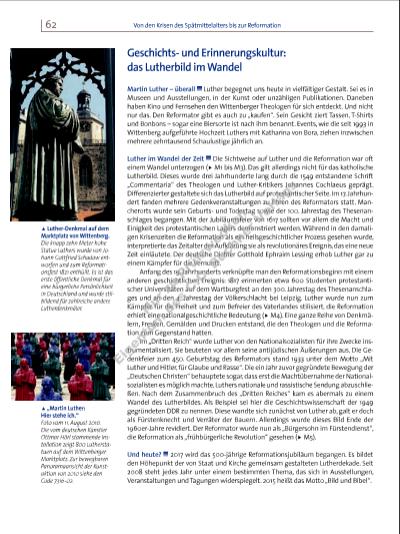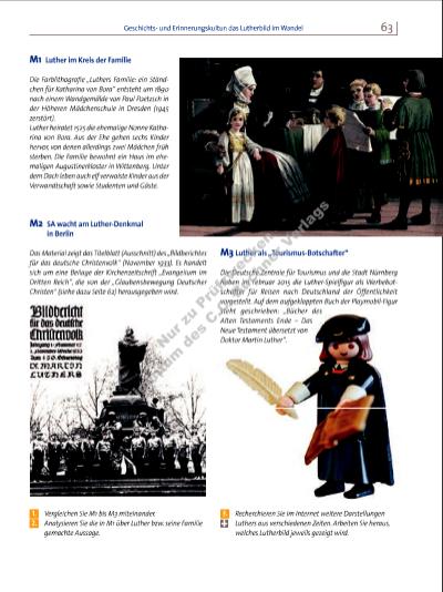 63Geschichtsund Erinnerungskultur: das Lutherbild im Wandel M1 Luther im Kreis der Familie Die Farblithografi e „Luthers Familie: ein Ständchen für Katharina von Bora“ entsteht um 1890 nach einem Wandgemälde von Paul Poetzsch in der Höheren Mädchenschule in Dresden (1945 zerstört). Luther heiratet 1525 die ehemalige Nonne Katharina von Bora. Aus der Ehe gehen sechs Kinder hervor, von denen allerdings zwei Mädchen früh sterben. Die Familie bewohnt ein Haus im ehemaligen Augustinerkloster in Wittenberg. Unter dem Dach leben auch elf verwaiste Kinder aus der Verwandtschaft sowie Studenten und Gäste. M2 SA wacht am Luther-Denkmal in Berlin Das Material zeigt das Titelblatt (Ausschnitt) des „Bildberichtes für das deutsche Christenvolk“ (November 1933). Es handelt sich um eine Beilage der Kirchenzeitschrift „Evangelium im Dritten Reich“, die von der „Glaubensbewegung Deutscher Christen“ (siehe dazu Seite 62) herausgegeben wird. 1. Vergleichen Sie M1 bis M3 miteinander. 2. Analysieren Sie die in M1 über Luther bzw. seine Familie gemachte Aussage. M3 Luther als „Tourismus-Botschafter“ Die Deutsche Zentrale für Tourismus und die Stadt Nürnberg haben im Februar 2015 die Luther-Spielfi gur als Werbebotschafter für Reisen nach Deutschland der Öffentlichkeit vorgestellt. Auf dem aufgeklappten Buch der Playmobil-Figur steht geschrieben: „Bücher des Alten Testaments Ende – Das Neue Testament übersetzt von Doktor Martin Luther“. 3. Recherchieren Sie im Internet weitere Darstellungen Luthers aus verschiedenen Zeiten. Arbeiten Sie heraus, welches Lutherbild jeweils gezeigt wird. 7316_1_1_2015_008-079_Krisen_Revolutionen.indd 63 05.05.15 13:00 Nu r z u Pr üf zw ec ke n Ei ge nt um d es C .C . B uc hn er V er la gs | |