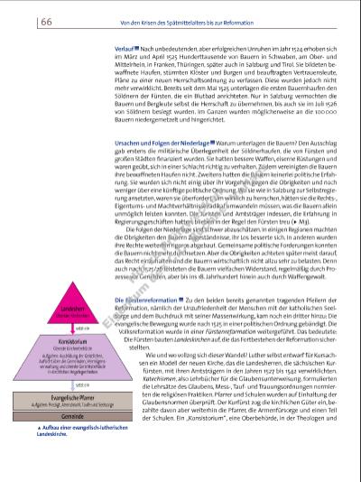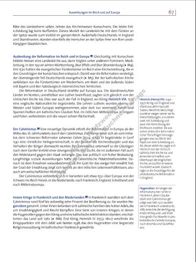 67Auswirkungen im Reich und auf Europa Räte des Landesherrn saßen, leitete das Kirchenwesen Kursachsens. Die letzte Entscheidung lag beim Kurfürsten. Dieses Modell der Landeskirche mit dem Fürsten an der Spitze wurde zum Vorbild im ganzen Reich. Außerhalb Deutschlands, in England und Skandinavien, standen ebenfalls die Herrscher an der Spitze ihrer von Rom unabhängigen Staats kirchen. Ausbreitung der Reformation im Reich und in Europa Gleichzeitig mit Kursachsen bildete Hessen eine Landeskirche aus, dann folgten unter anderem Pommern, Mecklenburg, in den 1550er-Jahren Württemberg, (Kur-)Pfalz und (Kur-)Brandenburg (u M4). Um 1570 hatten die evangelischen Fürstentümer im Reich eine Kirchenordnung, die in den Grundzügen der kursächsischen entsprach. Damit war die Reformation verstetigt, der überwiegende Teil Deutschlands evangelisch (u M5). Bei der katholischen Kirche verblieben nur die Fürstentümer am Niederrhein, am Main und der äußerste Süden mit Bayern und den habsburgisch-österreichischen Territorien. Die Reformation in Deutschland strahlte auf Europa aus. Die skandinavischen Länder im Norden, unmittelbar von Luther beeinfl usst, sagten sich gänzlich von der römischen Kirche los. Dies war auch der Fall in England, wo König Heinrich VIII. 1535 eine englische Nationalkirche begründete. Die Lehren Luthers wurden ebenso im Westen und Süden Europas wahrgenommen, aber dort nur vereinzelt. Italien und Spanien hielten am katholischen Glauben fest. Im östlichen Mitteleuropa, in Ungarn und Polen, verbreiteten sich die neuen Lehren fl ächenhaft. Der Calvinismus Eine neuartige Dynamik erhielt die Reformation in Europa ab der Mitte des 16. Jahrhunderts durch den Calvinismus. Der Name leitet sich ab vom Initiator, dem Schweizer Reformator Johannes Calvin (1509 1564). Er begründete in Genf 1541 eine christliche Heilsgemeinschaft, in der penibel die Kirchendisziplin und das Verhalten der Bürger überwacht wurden. Der Calvinismus unterwarf so die Gläubigen nach dem Genfer Vorbild einer strengen kirchlichen Zucht, die im äußersten Fall auch den Widerstand gegen den Staat verlangte. Das war politisch von hoher Bedeutung. Langfristige soziale Auswirkungen hatte die calvinistische Prädestinationslehre. Danach ist dem Einzelnen vorausbestimmt, ob ihn Gott für das ewige Heil erwählt hat; der Grad der Erwählung zeigt sich bereits an den irdischen Lebensverhältnissen, also auch am wirtschaftlichen Wohlstand. Der Calvinismus verbreitete sich in Varianten seit etwa 1550 über Europa, von der Schweiz ins Reich hinein, in die Niederlande, nach Frankreich, England, Schottland und nach Mittelosteuropa. Innere Kriege in Frankreich und den Niederlanden In Frankreich wandten sich dem Calvinismus rund fünf bis zeitweilig zehn Prozent der Bevölkerung zu. Sie wurden Hugenotten genannt. Unter ihnen befanden sich zahlreiche Familien des hohen Adels, die um Unabhängigkeit und Macht kämpften. Eine Serie von inneren Kriegen, in denen die Hugenotten gegen den König und eine katholische Adelsfraktion standen, erschütterten das Land seit 1562 (u M6). Erst König Heinrich IV. (1553 1610) versöhnte die Kriegsparteien mit dem Edikt von Nantes 1598, das den Hugenotten eine begrenzte Religionsausübung im katholischen Frankreich gewährte. Heinrich (Henry) VIII. (1491 1547): König von England und Irland aus dem Haus der Tudors. Berühmt-berüchtigt wurde er wegen seiner sechs Eheschließungen, von denen zwei mit Scheidung und zwei mit Hinrichtung der Ehefrauen endeten. Da aus seiner ersten Ehe kein männlicher Thronfolger hervorgegangen war, suchte er den Papst um eine Scheidung an. Als dieser ablehnte, sagte sich Heinrich von der römischkatholischen Kirche los und ernannte sich selbst zum Oberhaupt der englischen Kirche, woraufhin er exkommuniziert wurde. Dadurch legte er die Grundlage für die protestantische Reformation in England. Hugenotten: Anhänger der reformatorischen Lehre in Frankreich, deren Glaube stark vom Calvinismus geprägt war. Seit 1530 wurden sie in Frankreich unterdrückt; 1685 erreichte die Verfolgung einen Höhepunkt und löste eine große Fluchtwelle in protestantische Gebiete Europas, nach Amerika und Südafrika aus. 7316_1_1_2015_008-079_Krisen_Revolutionen.indd 67 05.05.15 13:00 Nu r z u Pr üf zw ec ke n Ei ge nt um de s C .C . B uc hn er V er la gs | |