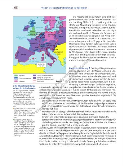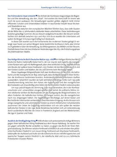69Auswirkungen im Reich und auf Europa Der frühmoderne Staat entsteht Die Einheit der Konfession begünstigte die Regenten und ihre Verwaltung, also den „Staat“. Sie konnten die Herrschaft im Innern wie noch nie zuvor ausbauen. Die Verwaltungen wurden größer, obgleich nicht immer effi zienter. Schulen und Universitäten bildeten in wachsender Anzahl treue Kirchen und Staatsdiener aus. Die Kriege zwischen den europäischen Mächten führten dazu, dass viele Staaten ab der Mitte des 17. Jahr hunderts stehende Heere unterhielten. Diese Veränderungen kosteten gewaltige Summen, die aus Steuern aufgebracht wurden. Die Steuern vervielfachten sich deshalb zwischen 1550 und 1650. Von da an wurden die Untertanen und später die Bürger in Europa regelmäßig hoch besteuert. In dieser Zeit wurden auch die Fundamente des modernen Staates gelegt. Er verlangt zwar heute von seinen Bürgern keine bestimmte Konfession mehr, aber immer noch gebietet er über die Verwaltung, das Bildungswesen, das Militär und die Steuern. Deshalb bezeichnen die beschriebenen Veränderungen bis 1650 die Entstehungsphase des frühmodernen Staates. Das Heilige Römische Reich Deutscher Nation 1555 1618 Im Heiligen Römischen Reich Deutscher Nation bekämpfte Kaiser Karl V., der von 1519 bis 1556 regierte, die evangelischen Fürsten seit 1546 mit Waffengewalt, aber ohne wirklichen Erfolg. Deshalb schloss sein Bruder, der spätere Kaiser Ferdinand I., 1555 Frieden mit den Reichsständen, d. h. mit den Fürsten, Grafen und Städten, die Sitz und Stimme beim Reichstag hatten. Dieser Augsburger Religionsfrieden ließ zwei Konfessionen im Reich zu, die katholische und die evangelische (u M9). Jedoch galt, dass die Reichsstände in ihren Territorien die Konfession bestimmen konnten. Anderskonfessionelle Untertanen durften auswandern, tatsächlich wurden sie bald vertrieben. Allerdings hörte nach 1555 jede Gewaltanwendung zwischen dem Kaiser, den katholischen und den evangelischen Reichsständen auf; etwa dreißig Jahre lebten die Konfessionen friedlich nebeneinander. Um 1590 jedoch kippte die Stimmung. Eine neue Generation, die in den Konfessionsschulen und -universitäten erzogen worden war, betrat die politische Bühne. Immer erbitterter stritten die Reichsstände um die Auslegung des Religionsfriedens. Vor allem forderten die katholischen Fürsten Kirchengut zurück, das die evangelischen nach 1555 eingezogen hatten. Die regelmäßigen Reichstage, auf denen Kaiser und Reichsstände miteinander verhan delten, brachten keine Einigung. 1608 schlossen sich einige evangelische und calvinistische Fürsten zu einem militärischen Schutzbündnis zusammen: der Union. Im Gegenzug verbündeten sich ein Jahr später die meisten katholischen Fürsten in der Liga. Beide Bündnisse bemühten sich um Unterstützung durch ausländische Mächte: die Union in Frankreich, England und den Niederlanden, die Liga in Spanien und Polen. Ausblick: der Dreißigjährige Krieg 1618 erhoben sich protestantische Adlige Böhmens gegen ihren katholischen König Ferdinand aus dem Hause Habsburg. Sie warfen ihm vor, gegen verbriefte Rechte verstoßen zu haben, so gegen das Recht der freien Religionsausübung. Die Böhmen setzten Ferdinand schließlich ab und erhoben den pfälzischen Kurfürsten Friedrich V. zum neuen König. Ferdinand, seit 1619 Kaiser Ferdinand II., bekämpfte den Aufstand und holte sich die böhmische Krone mithilfe bayerischer und spanischer Truppen zurück. Friedrich V., der rebellische Adel und 150 000 böhmische Protestanten mussten fl iehen. 7316_1_1_2015_008-079_Krisen_Revolutionen.indd 69 05.05.15 13:00 Nu r z u Pr üf zw ec ke n Ei ge nt um d es C .C . B uc hn er V er la gs | |