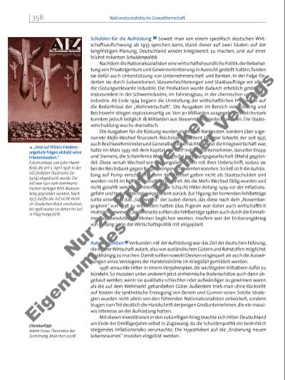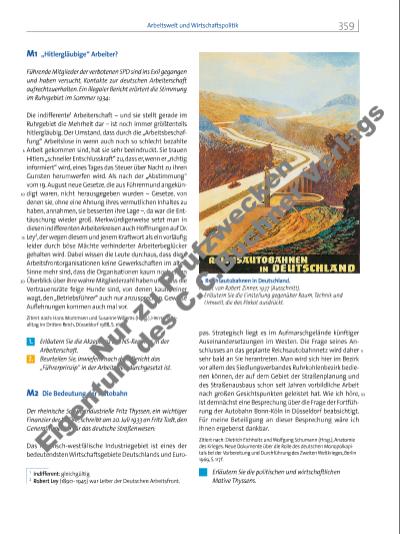 M1 „Hitlergläubige“ Arbeiter? Führende Mitglieder der verbotenen SPD sind ins Exil gegangen und haben versucht, Kontakte zur deutschen Arbeiterschaft aufrechtzuerhalten. Ein illegaler Bericht erörtert die Stimmung im Ruhrgebiet im Sommer 1934: Die indifferente1 Arbeiterschaft – und sie stellt gerade im Ruhrgebiet die Mehrheit dar – ist noch immer größtenteils hitlergläubig. Der Umstand, dass durch die „Arbeitsbeschaffung“ Arbeitslose in wenn auch noch so schlecht bezahlte Arbeit gekommen sind, hat sie sehr beeindruckt. Sie trauen Hitlers „schneller Entschlusskraft“ zu, dass er, wenn er „richtig informiert“ wird, eines Tages das Steuer über Nacht zu ihren Gunsten herumwerfen wird. Als nach der „Abstimmung“ vom 19. August neue Gesetze, die aus Führermund angekündigt waren, nicht herausgegeben wurden – Gesetze, von denen sie, ohne eine Ahnung ihres vermutlichen Inhaltes zu haben, annahmen, sie besserten ihre Lage –, da war die Enttäuschung wieder groß. Merkwürdigerweise setzt man in diesen indifferenten Arbeiterkreisen auch Hoffnungen auf Dr. Ley2, der wegen diesem und jenem Kraftwort als ein vorläufi g leider durch böse Mächte verhinderter Arbeiterbeglücker gehalten wird. Dabei wissen die Leute durchaus, dass diese Arbeitsfrontorganisationen keine Gewerkschaften im alten Sinne mehr sind, dass die Organisationen kaum noch einen Überblick über ihre wahre Mitgliederzahl haben und dass die Vertrauensräte feige Hunde sind, von denen kaum einer wagt, den „Betriebsführer“ auch nur anzusprechen. Gewisse Aufl ehnungen kommen auch mal vor. Zitiert nach: Hans Mommsen und Susanne Willems (Hrsg.), Herrschaftsalltag im Dritten Reich, Düsseldorf 1988, S. 165 f. 1. Erläutern Sie die Akzeptanz des NS-Regimes in der Arbeiterschaft. 2. Beurteilen Sie, inwiefern nach dem Bericht das „Führerprinzip“ in der Arbeitswelt durchgesetzt ist. M2 Die Bedeutung der Autobahn Der rheinische Schwerindustrielle Fritz Thyssen, ein wichtiger Finanzier der NSDAP, schreibt am 20. Juli 1933 an Fritz Todt, den Generalinspektor für das deutsche Straßenwesen: Das rheinisch-westfälische Industriegebiet ist eines der bedeutendsten Wirtschaftsgebiete Deutschlands und Europas. Strategisch liegt es im Aufmarschgelände künftiger Auseinandersetzungen im Westen. Die Frage seines Anschlusses an das geplante Reichsautobahnnetz wird daher sehr bald an Sie herantreten. Man wird sich hier im Bezirk vor allem des Siedlungsverbandes Ruhrkohlenbezirk bedienen können, der auf dem Gebiet der Straßenplanung und des Straßenausbaus schon seit Jahren vorbildliche Arbeit nach großen Gesichtspunkten geleistet hat. Wie ich höre, ist demnächst eine Besprechung über die Frage der Fortführung der Autobahn Bonn-Köln in Düsseldorf beabsichtigt. Für meine Beteiligung an dieser Besprechung wäre ich Ihnen ergebenst dankbar. Zitiert nach: Dietrich Eichholtz und Wolfgang Schumann (Hrsg.), Anatomie des Krieges. Neue Dokumente über die Rolle des deutschen Monopolkapitals bei der Vorbereitung und Durchführung des Zweiten Weltkrieges, Berlin 1969, S. 117 f. Erläutern Sie die politischen und wirtschaftlichen Motive Thyssens. 1 indifferent: gleichgültig 2 Robert Ley (1890 1945) war Leiter der Deutschen Arbeitsfront. 5 10 15 20 5 10 i Reichsautobahnen in Deutschland. Plakat von Robert Zinner, 1937 (Ausschnitt). p Erläutern Sie die Einstellung gegenüber Raum, Technik und Umwelt, die das Plakat ausdrückt. 359Arbeitswelt und Wirtschaftspolitik Nu r z u Pr üf zw ec ke n Ei ge tu m d es C .C .B uc hn er V er la gs | |