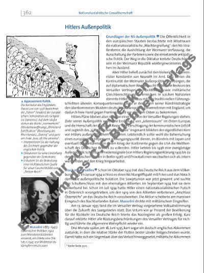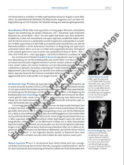 mit Deutschland zu schließen. Im März 1936 besetzten deutsche Truppen in einer Blitzaktion das entmilitarisierte Rheinland. Die Westmächte reagierten auch auf diese Vertragsverletzung nur mit Protesten. Der Versailler Vertrag war bedeutungslos geworden. Neue Bündnisse Als Hitler Ende 1935 Italien im Krieg gegen Äthiopien unterstützte, begann die Annäherung der beiden Diktaturen. Am 1. November 1936 verkündete Mussolini die „Achse Berlin – Rom“. Ein Jahr später trat Italien auch dem Antikominternpakt bei, in dem sich Deutschland und Japan 1936 dazu verpfl ichtet hatten, weltweit den Kommunismus zu bekämpfen und die Sowjetunion außenpolitisch zu isolieren. Im März 1939 schloss sich dem Pakt auch Spanien unter General Franco an, den die Nationalsozialisten und die italienischen Faschisten im Bürgerkrieg seit 1936 massiv unterstützt hatten. Wenn auch das von Hitler stets angestrebte Bündnis mit England nicht zustande gekommen war, so schien das „weltpolitische Dreieck“ Berlin – Rom – Tokio eine Politik ohne – oder sogar gegen – das britische Weltreich zuzulassen (u M1). Der amerikanische Präsident Franklin D. Roosevelt signalisierte zwar in einer Rede eine Abwendung von der Neutralitätspolitik, aber weder Hitler noch Mussolini ließen sich davon beeindrucken. England, Frankreich und die meisten anderen westeuropäischen Länder hatten mit inneren Problemen und den Nachwirkungen der Weltwirtschaftskrise zu kämpfen. Sie wollten unbedingt am Frieden festhalten und setzten auf Appeasement („Beschwichtigung“) als Maxime ihrer Außenpolitik. Nur so ist es zu erklären, dass das Deutsche Reich keinen ernsthaften Widerstand fand und ab 1938 die Aggressivität seiner Außenpolitik noch steigern konnte. Die Österreich-Frage Anders als 1934 hatte Hitler 1937/38 die Billigung Mussolinis, als er erneut versuchte, massiven Einfl uss auf Österreich zu gewinnen. Deutschland erreichte im Juli 1937 zunächst die Verstärkung des Einfl usses österreichischer Nationalsozialisten, die Zulassung von NS-Zeitungen und die Aufnahme von Ministern in die Regierung des Bundeskanzlers Kurt Schuschnigg. Nachdem Hitler offen mit dem Einmarsch der Wehrmacht gedroht hatte, wurde Schuschnigg zur Unterzeichnung eines Abkommens gedrängt, das den Nationalsozialisten in Österreich weitreichende Vollmachten gab, vor allem die Kontrolle über den gesamten Polizeiapparat. Schuschnigg glaubte, mit diesen Zugeständnissen die Eigenstaatlichkeit gesichert zu haben. Als seine neuen Regierungspartner jedoch immer unverhohlener die Staatsgeschäfte übernahmen, sah er eine Machtergreifung voraus und rief die Österreicher am 9. März zu einer Volksabstimmung über die Unabhängigkeit auf. Dies reichte Hitler als Grund für die Mobilisierung der Wehrmacht. Schuschnigg trat auf dessen Druck am 11. März zugunsten des Nationalsozialisten Arthur Seyß-Inquart zurück, der sofort ein telegrafi sches „Hilfeersuchen“ an die Wehrmacht richtete. Am 12. März marschierten deutsche Soldaten in Österreich ein und wurden zum Teil mit triumphalem Jubel empfangen. Unter dem Eindruck dieser Zustimmung verkündete Hitler am 15. März vor begeisterten Menschenmassen auf dem Wiener Heldenplatz „den Eintritt meiner Heimat in das Deutsche Reich“. In den folgenden Wochen wurden in Österreich dann etwa 80 000 Menschen verhaftet, darunter viele Politiker des alten Systems sowie Juden. Weitere Expansion Auch in Deutschland fand Hitlers Politik jetzt fast uneingeschränkte Zustimmung. Nun forderte Hitler die „Lösung des Sudetenproblems“, die für ihn darin bestand, die deutschsprachig dominierten Gebiete der Tschechoslowakei dem Franklin Delano Roosevelt (1882 1945): Rechtsanwalt und Politiker, Neffe Theodore Roosevelts, 1933 1945 US-Präsident (Demokrat). Er setzte sich für soziale Reformen ein, führte die USA in den Zweiten Weltkrieg und engagierte sich für die Gründung der Vereinten Nationen. Kurt Schuschnigg (1897 1977): österreichischer Politiker, Bundeskanzler 1934 1938, regierte Österreich diktatorisch und ohne legale Opposition. Nach dem „Anschluss“ zum Rücktritt gezwungen, bis 1945 in deutschen Konzentrationslagern inhaftiert. 363Hitlers Außenpolitik Nu r z u Pr üf zw ec ke n Ei g tu m d es C .C .B uc hn er V er la gs | |