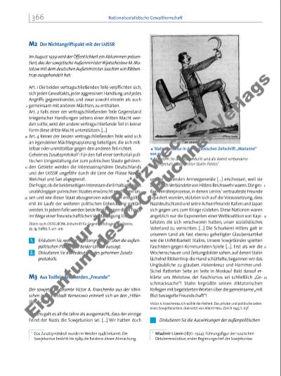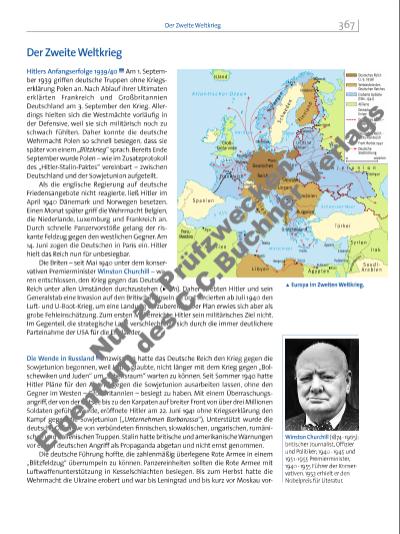 Der Zweite Weltkrieg Hitlers Anfangserfolge 1939/40 Am 1. September 1939 griffen deutsche Truppen ohne Kriegserklärung Polen an. Nach Ablauf ihrer Ultimaten erklärten Frankreich und Großbritannien Deutschland am 3. September den Krieg. Allerdings hielten sich die Westmächte vorläufi g in der Defensive, weil sie sich militärisch noch zu schwach fühlten. Daher konnte die deutsche Wehrmacht Polen so schnell besiegen, dass sie später von einem „Blitzkrieg“ sprach. Bereits Ende September wurde Polen – wie im Zusatzprotokoll des „Hitler-Stalin-Paktes“ vereinbart – zwischen Deutschland und der Sowjetunion aufgeteilt. Als die englische Regierung auf deutsche Friedensangebote nicht reagierte, ließ Hitler im April 1940 Dänemark und Norwegen besetzen. Einen Monat später griff die Wehrmacht Belgien, die Niederlande, Luxemburg und Frankreich an. Durch schnelle Panzervorstöße gelang der riskante Feldzug gegen den westlichen Gegner. Am 14. Juni zogen die Deutschen in Paris ein. Hitler hielt das Reich nun für unbesiegbar. Die Briten – seit Mai 1940 unter dem konservativen Premierminister Winston Churchill – waren entschlossen, den Krieg gegen das Deutsche Reich unter allen Umständen durchzustehen (u M1). Daher strebten Hitler und sein Generalstab eine Invasion auf den Britischen Inseln an und forcierten ab Juli 1940 den Luftund U-Boot-Krieg, um eine Landung vorzubereiten. Der Plan erwies sich aber als grobe Fehleinschätzung. Zum ersten Mal erreichte Hitler sein militärisches Ziel nicht. Im Gegenteil, die strategische Lage verschlechterte sich durch die immer deutlichere Parteinahme der USA für die Engländer. Die Wende in Russland Inzwischen hatte das Deutsche Reich den Krieg gegen die Sowjetunion begonnen, weil Hitler glaubte, nicht länger mit dem Krieg gegen „Bolschewiken und Juden“ um „Lebensraum“ warten zu können. Seit Sommer 1940 hatte Hitler Pläne für den Angriff gegen die Sowjetunion ausarbeiten lassen, ohne den Gegner im Westen – Großbritannien – besiegt zu haben. Mit einem Überraschungsangriff, der von der Ostsee bis zu den Karpaten auf breiter Front von über drei Millionen Soldaten geführt wurde, eröffnete Hitler am 22. Juni 1941 ohne Kriegserklärung den Kampf gegen die Sowjetunion („Unternehmen Barbarossa“). Unterstützt wurde die deutsche Offensive von verbündeten fi nnischen, slowakischen, ungarischen, rumänischen und italienischen Truppen. Stalin hatte britische und amerikanische Warnungen vor einem deutschen Angriff als Propaganda abgetan und nicht ernst genommen. Die deutsche Führung hoffte, die zahlenmäßig überlegene Rote Armee in einem „Blitzfeldzug“ überrumpeln zu können. Panzereinheiten sollten die Rote Armee mit Luftwaffenunterstützung in Kesselschlachten besiegen. Bis zum Herbst hatte die Wehrmacht die Ukraine erobert und war bis Leningrad und bis kurz vor Moskau vorWinston Churchill (1874 1965): britischer Journalist, Offi zier und Politiker; 1940 1945 und 1951 -1955 Premierminister, 1940 1955 Führer der Konservativen. 1953 erhielt er den Nobelpreis für Literatur. i Europa im Zweiten Weltkrieg. 367Der Zweite Weltkrieg Nu r z u Pr üf zw ec ke n Ei g nt um d es C .C .B uc hn er V er la gs | |