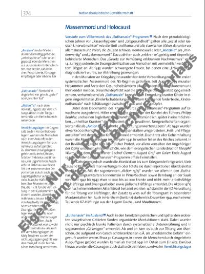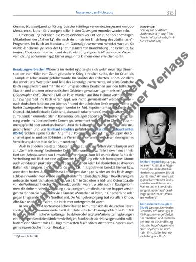 Chelmno (Kulmhof), und zur Tötung jüdischer Häftlinge verwendet. Insgesamt 700 000 Menschen, so lauten Schätzungen, sollen in den Gaswagen ermordet worden sein. Unterstützung bekamen die Polizeieinheiten vor Ort von rund 100 ehemaligen Mitarbeitern der „Aktion T4“, die nach der offi ziellen Einstellung des „Euthanasie“Programms im Reich an Standorte im Generalgouvernement versetzt wurden. So wurde der ehemalige Leiter der T4-Tötungsanstalten Brandenburg und Bernburg, Dr. Irmfried Eberl, erster Kommandant des Vernichtungslagers Treblinka, wo die Massenvernichtung ab Sommer 1942 bisher ungeahnte Dimensionen erreichen sollte. Besatzungsverbrechen Bereits im Herbst 1939 zeigte sich, welch neuartige Dimension der von Hitler vom Zaun gebrochene Krieg erreichen sollte, der im Osten als „Kampf um Lebensraum“ geführt wurde. Ein Großteil des eroberten Landes, vor allem das annektierte Westpolen und Teile des Generalgouvernements, sollte ins Deutsche Reich eingegliedert und mithilfe von umgesiedelten Deutschen aus den baltischen Staaten und anderen osteuropäischen Gebieten gewaltsam „germanisiert“ werden („Generalplan Ost“). Über eine Million Polen wurden aus ihrer Heimat vertrieben oder zur Zwangsarbeit ins Reich verschleppt. Wer nicht „germanisiert“ werden konnte – nach deutschen Schätzungen über 95 Prozent der polnischen Bevölkerung – sollte zu harter Zwangsarbeit herangezogen werden (u M1). Repräsentanten der polnischen Oberschicht, Intellektuelle, Geistliche, aber auch Arbeiter und Gewerkschafter wurden zu Tausenden ermordet oder in Konzentrationslager deportiert. Die jüdische Bevölkerung wurde ins überbevölkerte Generalgouvernement vertrieben, in Ghettos zusammengepfercht oder sofort erschossen. Unter der Leitung des von Heinrich Himmler neu geschaffenen und von Reinhard Heydrich geführten Reichssicherheitshauptamtes (RSHA) rückten eigens für den Angriff auf Polen aufgestellte Einsatzgruppen der Sicherheitspolizei und des SD hinter der Wehrmacht vor, um Hitlers rassenideologisches Vernichtungskonzept in die Tat umzusetzen.* Auch in anderen besetzten Staaten kam es zu massenhaften Vertreibungen und zur „Germanisierung“ bestimmter Gebiete, so wurden etwa Teile Sloweniens annektiert und Zehntausende von Einwohnern vertrieben. Zum Teil wurde diese Politik der Vertreibung mit Blick auf eine gewünschte Herstellung ethnisch homogener Räume auch von Staaten praktiziert, die mit dem Deutschen Reich kollaborierten, so etwa von Italien oder Ungarn, die ihrerseits Gebiete z. B. in Jugoslawien besetzt hielten bzw. annektiert hatten. Auch aus Elsass-Lothringen, das 1940 wieder an das Reich angeschlossen worden war, wurde ein Großteil der französischsprachigen Bevölkerung ins unbesetzte Frankreich abgeschoben. Vor allem in Gebieten in Südund Osteuropa, die von der Wehrmacht erobert und besetzt worden waren, wurde auch in Kauf genommen, die einheimische Bevölkerung auszuhungern, um die deutschen Truppen versorgen zu können. So hungerten viele Tausend Menschen in Polen, in Griechenland oder gegen Kriegsende auch in Nordholland. Die Mangelversorgung traf vor allem Kinder, Alte, Kranke oder Menschen, die in Heimen untergebracht waren. In den westund nordeuropäischen Staaten bemühten sich die deutschen Besatzer dagegen um Zusammenarbeit mit den einheimischen Führungsschichten. Zum Teil ließen sie einheimische Verwaltungen bestehen oder setzten Marionettenregierungen ein. In einigen besetzten Ländern wie Belgien, Frankreich oder Norwegen und in kollaborierenden Staaten wie z. B. Ungarn machten faschistisch orientierte Gruppen auch gemeinsame Sache mit den Besatzern. * Vgl. auch Seite 368. Literaturtipp: Götz Aly, Die Belasteten. „Euthanasie 1933 1945“, Eine Gesellschaftsgeschichte, Frankfurt am Main 2013 Reichssicherheitshauptamt (RSHA) : Gestapo, Kriminalpolizei und SD wurden 1939 im RSHA zusammengeführt, einer mächtigen und zentralen Behörde, die die „Endlösung der Judenfrage“ organisierte. Nach Heydrichs Tod übernahm Ernst Kaltenbrunner die Leitung des RSHA. Reinhard Heydrich (1904 1942, bei einem Attentat in Prag ermordet): Leiter des Reichssicherheitshauptamtes (RSHA), „rechte Hand“ Himmlers, seit 1941 stellvertretender Reichsprotektor von Böhmen und Mähren und mit der „Endlösung der Judenfrage“ beauftragt, 1942 Leiter der „Wannsee-Konferenz“ 375Massenmord und Holocaust Nu r z u Pr üf zw ec ke n E ge tu m d es C .C .B uc hn er V er la gs | |