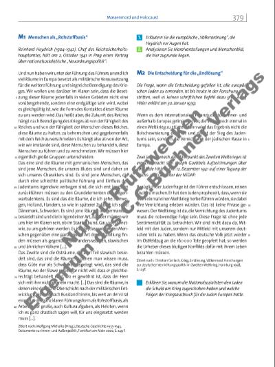 5 10 15 M1 Menschen als „Rohstoffbasis“ Reinhard Heydrich (1904-1942), Chef des Reichssicherheitshauptamtes, hält am 2. Oktober 1941 in Prag einen Vortrag über nationalsozialistische „Neuordnungspolitik“: Und nun haben wir unter der Führung des Führers unendlich viel Räume in Europa besetzt als militärische Voraussetzung für die weitere Führung und siegreiche Beendigung des Krieges. Wir wollen uns darüber im Klaren sein, dass die Besetzung dieser Räume jedenfalls in vielen Gebieten nicht eine vorübergehende, sondern eine endgültige sein wird, wobei es gleichgültig ist, wie die Form des Kontaktes dieser Räume zu uns werden wird. Das heißt aber, die Zukunft des Reiches hängt nach Beendigung des Krieges ab von der Fähigkeit des Reiches und von der Fähigkeit der Menschen dieses Reiches, diese Räume zu halten, zu beherrschen und gegebenenfalls mit dem Reich zu verschmelzen. Es hängt also ab von der Art, wie wir imstande sind, diese Menschen zu behandeln, diese Menschen zu führen und zu verschmelzen. Wir müssen hier eigentlich große Gruppen unterscheiden: Das eine sind die Räume mit germanischen Menschen, das sind jene Menschen, die unseres Blutes sind und daher an sich unseres Charakters sind. Es sind jene Menschen, die durch eine schlechte politische Führung und Einfl uss des Judentums irgendwie verbogen sind, die sich erst langsam zurückführen müssen zu den Grundelementen des Gegenwartsdenkens. Es sind das die Räume, die ich sehe: Norwegen, Holland, Flandern, so wie in späterer Zukunft ich sehe: Dänemark, Schweden. Es sind jene Räume, die germanisch besiedelt sind und die in irgendeiner Art, darüber müssen wir uns hier im Klaren sein, ob im Staatenbund, Gau oder sonstwie, zu uns gehören werden. Es ist klar, dass wir diesen Menschen gegenüber eine ganz andere Art der Behandlung fi nden müssen als gegenüber den andersrassigen, slawischen und ähnlichen Völkern […]. Das Zweite sind die Osträume, die zum Teil slawisch besiedelt sind, das sind die Räume, in denen man wissen muss, dass Güte nur als Schwäche ausgelegt wird, das sind die Räume, wo der Slawe selber gar nicht will, dass er gleichberechtigt behandelt wird, wo er gewöhnt ist, dass der Herr sich mit ihm nicht gemein macht. […] Das sind die Räume, in denen eine deutsche Oberschicht nach der militärischen Entwicklung bis weit nach Russland hinein, bis weit an den Ural einmal in der ganz klaren Führungsform als Rohstoffbasis, als Arbeiter für große, auch Kulturaufgaben, als Heloten, wenn ich es ganz drastisch sagen will, für uns eingesetzt werden muss […]. Zitiert nach: Wolfgang Michalka (Hrsg.), Deutsche Geschichte 1933-1945. Dokumente zur Innenund Außenpolitik, Frankfurt am Main 2002, S. 249 f. 1. Erläutern Sie die europäische „Völkerordnung“, die Heydrich vor Augen hat. 2. Analysieren Sie Moralvorstellungen und Menschenbild, die hier zugrunde liegen. M2 Die Entscheidung für die „Endlösung“ Die Frage, wann die Entscheidung gefallen ist, alle europäischen Juden zu ermorden, ist bis heute in der Forschung umstritten, weil es keinen schriftlichen Befehl dazu gibt. Adolf Hitler erklärt am 30. Januar 1939: Wenn es dem internationalen Finanzjudentum innerund außerhalb Europas gelingen sollte, die Völker noch einmal in einen Weltkrieg zu stürzen, dann wird das Ergebnis nicht die Bolschewisierung der Erde und damit der Sieg des Judentums sein, sondern die Vernichtung der jüdischen Rasse in Europa. Zwei Jahre danach, der Höhepunkt des Zweiten Weltkrieges ist erreicht, macht sich Joseph Goebbels Aufzeichnungen über eine Rede Hitlers vom 12. Dezember 1941 auf einer Tagung der Reichsund Gauleiter der NSDAP: Bezüglich der Judenfrage ist der Führer entschlossen, reinen Tisch zu machen. Er hat den Juden prophezeit, dass, wenn sie noch einmal einen Weltkrieg herbeiführen würden, sie dabei ihre Vernichtung erleben würden. Das ist keine Phrase gewesen. Der Weltkrieg ist da, die Vernichtung des Judentums muss die notwendige Folge sein. Diese Frage ist ohne jede Sentimentalität zu betrachten. Wir sind nicht dazu da, Mitleid mit den Juden, sondern nur Mitleid mit unserem deutschen Volk zu haben. Wenn das deutsche Volk jetzt wieder im Ostfeldzug an die 160 000 Tote geopfert hat, so werden die Urheber dieses blutigen Konfl ikts dafür mit ihrem Leben bezahlen müssen. Zitiert nach: Christian Gerlach, Krieg, Ernährung, Völkermord. Forschungen zur deutschen Vernichtungspolitik im Zweiten Weltkrieg, Hamburg 1998, S. 123 f. Erklären Sie, warum die Nationalsozialisten den Juden die Schuld am Krieg zugeschoben haben und welche Folgen der Kriegsausbruch für die Juden Europas hatte. 5 10 15 20 25 30 35 40 379Massenmord und Holocaust Nu zu Pr üf zw ec ke n Ei g nt um d es C .C .B uc hn er V er la gs | |