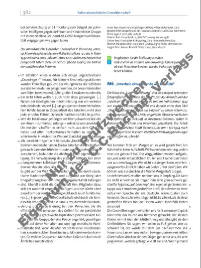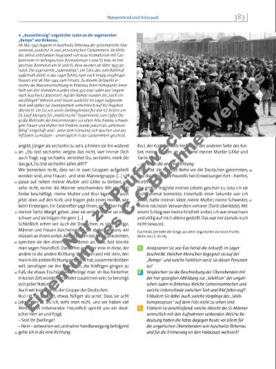 angibt, jünger als sechzehn zu sein, schreien sie ihn wütend an: „Du bist sechzehn, vergiss das nicht, wer immer Dich auch fragt, sag sechzehn, verstehst Du, sechzehn, merk Dir das gut, Du bist sechzehn Jahre alt!!!“ Wir bemerken nicht, dass wir in zwei Gruppen aufgeteilt worden sind, eine Frauenund eine Männergruppe. […] Ich passe auf, neben meiner Mutter und Gilike zu bleiben, ich sehe nicht, wohin die Männer verschwinden. Wir sind mit Ferike beschäftigt, meine Mutter und Boci legen ihn auch jetzt oben auf den Korb und tragen jede einen Henkel, wie beim Einsteigen. Ein Gestreifter sagt ihnen, sie sollten Ferike meiner Tante Margit geben, aber sie antworten, er sei nicht schwer und sie trügen ihn gern. […] Schließlich sehen wir auch die Deutschen, es sind wenige, Männer und Frauen durcheinander, sie stehen vor uns, wir müssen an ihnen vorbei. Als die Reihen bei ihnen ankommen, sprechen sie den einen oder anderen an, leise, fast könnte man sagen freundlich. Daraufhin geht der eine in diese, der andere in die andere Richtung. Wenn jemand mit dem, den man in die andere Richtung geschickt hat, zusammenbleiben will, beruhigen sie ihn freundlich, die Kräftigen gingen zu Fuß, die etwas Erschöpfteren bringe man im Bus hinterher. In kurzer Zeit würden sie wieder zusammen sein. So beruhigt sich jeder. Natürlich. Auch wir kommen zu der Gruppe der Deutschen. Boci ist, da sie stillt, etwas fülliger als sonst. Dass sie acht Jahre älter ist als ich, sieht man nicht, und wir haben viel Ähnlichkeit miteinander. Freundlich spricht uns ein deutscher Herr an und fragt: – Seid ihr Zwillinge? – Nein – antworten wir, und seine Handbewegung befolgend gehe ich in die eine Richtung. u „Aussortierung“ ungarischer Juden an der sogenannten „Rampe“ von Birkenau. Ab Mai 1942 begann in Auschwitz-Birkenau der systematische Massenmord, zunächst in zwei provisorischen Gaskammern. Ab Mitte des Jahres entstanden insgesamt vier neue Krematorien mit Gaskammern im Kellergeschoss (Krematorium II und III) bzw. im Erdgeschoss (Krematorium IV und V); diese wurden ab März 1943 genutzt. Die sogenannte „Judenrampe“, ein Gleis, das vom Bahnhof außerhalb direkt in das Lager führte, kam nach knapp einjähriger Bauzeit erst ab Mai 1944 zum Einsatz. Zu diesem Zeitpunkt erreichte die Massenvernichtung in Birkenau ihren Höhepunkt: Innerhalb von drei Monaten wurden etwa 450 000 Juden aus Ungarn nach Auschwitz deportiert. Auf der Rampe wurden die „noch einsatzfähigen“ Männer und Frauen zunächst ins Lager aufgenommen und später zur Zwangsarbeit vornehmlich auf Reichsgebiet überstellt. Ein Teil, vor allem Zwillingskinder, fi el den KZ-Ärzten um Dr. Josef Mengele für „medizinische“ Experimente zum Opfer. Die große Mehrzahl der Ankommenden, vor allem Alte, Kranke, schwangere Frauen und Mütter mit Kindern, wurde jedoch als „arbeitsunfähig“ eingestuft und – unter dem Vorwand, sich duschen und desinfi zieren zu müssen – unverzüglich in die Gaskammern geschickt. 25 30 35 40 45 50 55 Boci, der Korb, im Korb Ferike, auf der anderen Seite des Korbes meine Mutter, an der Hand meiner Mutter Gilike und Tante Margit … gehen in die andere Richtung. Schon ist die nächste Reihe vor die Deutschen gekommen, und die setzen ihre freundlichen Einweisungen fort – hierhin, dorthin. Die größte Tragödie meines Lebens geschah so, dass ich sie nicht einmal bemerkte. Innerhalb einer Sekunde war ich allein, hatte meinen Vater, meine Mutter, meine Schwester, meine nächsten Verwandten verloren (Tanti überlebte). Mit einem Schlag war meine Kindheit vorbei, ich war erwachsen und völlig auf mich alleine gestellt. Das war mir damals noch nicht bewusst. Éva Fahidi, Die Seele der Dinge, aus dem Ungarischen von Doris Fischer, Berlin 2011, S. 161-163 1. Analysieren Sie, wie Éva Fahidi die Ankunft im Lager beschreibt. Welchen Menschen begegnet sie auf der „Rampe“ und welche Funktion weist sie diesen Personen zu? 2. Vergleichen Sie die Beschreibung der Überlebenden mit der hier gezeigten Abbildung zur „Selektion“ der ungarischen Juden in Birkenau. Welche Gemeinsamkeiten und welche Unterschiede zwischen Text und Bild fallen auf? Erläutern Sie dabei auch, welche Vorgänge des „Selektionsprozesses“ auf dem Foto nicht zu sehen sind. 3. Erörtern Sie anschließend, welche Absicht die SS-Männer vermutlich mit den Aufnahmen verbanden. Welche Bedeutung haben die Fotos dagegen heute vor allem für die ungarischen Überlebenden von Auschwitz-Birkenau und für die Erinnerung an den Holocaust weltweit? 60 65 383Massenmord und Holocaust Nu r z u Pr üf zw ec ke n E ge nt um de s C .C .B uc ne r V er la gs | |