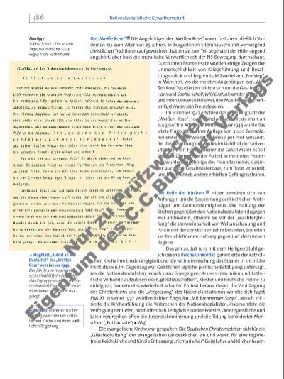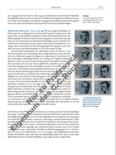 ten. Dagegen formierte sich im Mai 1934 auf Initiative des Pfarrers Martin Niemöller die Bekennende Kirche, der sich mehr als die Hälfte der evangelischen Pfarrer anschloss. In Schriften und Predigten protestierten sie gegen die staatliche Vereinnahmung der Kirche, die nationalsozialistische Rassenpolitik und die Konzentrationslager. Militärischer Widerstand – der 20. Juli 1944 Der einzige Machtfaktor im Hitlerstaat, der zur Organisation und Durchführung eines Umsturzes in der Lage schien, war das Militär. Außerdem waren die Generäle die ersten Befehlsempfänger für Hitlers maßlose Eroberungspläne, und da dieser sprunghaft und ohne strategischen Sachverstand befehligte, wuchs aufseiten der militärischen Führung die Skepsis. Selbst moralische Einwände kamen zum Tragen, denn der rassistische Vernichtungskrieg Hitlers ging für viele weit über das hinaus, was Berufssoldaten zu tun bereit waren (u M4). Generaloberst Ludwig Beck, der 1938 wegen Hitlers Einmarsch in die Tschechoslowakei als Generalstabschef zurückgetreten war, versuchte seitdem, den Widerstand gegen das Regime zu organisieren. Gemeinsam mit dem ehemaligen Oberbürgermeister von Leipzig, Carl Friedrich Goerdeler, plante er schon eine neue deutsche Regierung und knüpfte Kontakte mit dem Ausland. Doch dies war höchst gefährlich, außerdem gab es in den scheinbar erfolgreichen Jahren des Regimes weder in der militärischen Führung noch in der Bevölkerung genügend Unterstützung. Erst nach der militärischen Wende Anfang 1943 erhielt die Verschwörung größeren Rückhalt und mehr Teilnehmer, so Oberst Claus Schenk Graf von Stauffenberg, der als Mitglied des Generalstabs direkten Zugang zu Hitler hatte. Die Ausweitung des Kreises der Verschwörer erhöhte aber auch die unmittelbare Gefahr. So waren ihnen die Sicherheitskräfte auf der Spur und hatten bereits einige Mitwisser verhaftet. Am 20. Juli 1944 nutzte Stauffenberg eine günstige Gelegenheit und deponierte eine Aktentasche voll Sprengstoff in Hitlers Nähe. Die Bombe verfehlte ihren Zweck. Hitler entkam verletzt, berief sich aber künftig auf die „Vorsehung“, die ihn geschützt habe. Das Regime nahm grausam Rache. Graf Stauffenberg und seine engsten Mitarbeiter wurden noch in derselben Nacht erschossen. Die Geheime Staatspolizei verhaftete 7 000 Personen, auch solche, die mit der Verschwörung nichts zu tun hatten. Himmlers Anordnung der „absoluten Sippenhaftung“ bedeutete, dass Verwandte für die Tat mitverantwortlich waren und gleichfalls bestraft wurden. Der Kreisauer Kreis Auf dem schlesischen Gut Kreisau, das dem Sachverständigen für Kriegsund Völkerrecht im Oberkommando der Wehrmacht, Helmuth James Graf von Moltke, gehörte, trafen sich seit Ende 1938 Männer verschiedener Anschauungen und Herkunft: Konservative, Sozialisten, ehemalige Gewerkschaftsvertreter, Großgrundbesitzer, protestantische und katholische Geistliche. Der Kreisauer Kreis erarbeitete Grundsätze für einen Staatsund Gesellschaftsaufbau nach dem Sturz Hitlers, der vom Europagedanken geprägt war. Staatsstreichpläne wurden zwar nicht konkret ausgearbeitet, aber es bestanden Kontakte zu Widerstandsgruppen im Inund Ausland, so auch zu den Attentätern vom 20. Juli 1944. Viele Mitglieder des Kreisauer Kreises, wie Moltke, Peter Graf Yorck von Wartenburg, Adam von Trott zu Solz, Pater Alfred Delp oder der Gewerkschaftsführer Julius Leber, wurden hingerichtet. i Sonderbriefmarken der Deutschen Bundespost von 1964 anlässlich des Jahre stages des Attentates auf Hitler am 20. Juli 1944. Filmtipp: Der neunte Tag; Deutschland/ Luxemburg/Tschechien 2004, Regie: Volker Schlöndorff 387Widerstand Nu r z u Pr üf zw ec ke n Ei ge nt um d es C .C .B uc hn er V er la gs | |