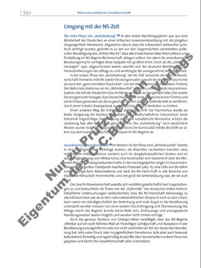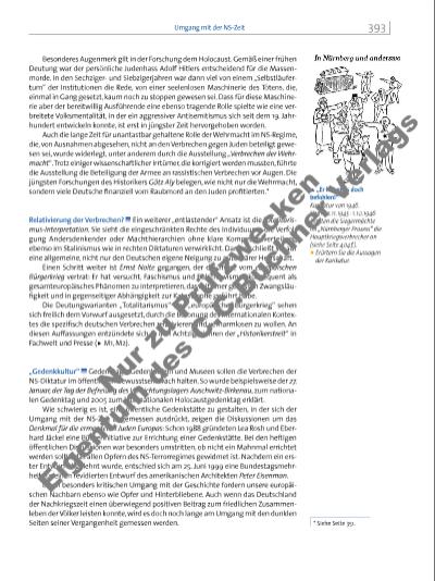 Besonderes Augenmerk gilt in der Forschung dem Holocaust. Gemäß einer frühen Deutung war der persönliche Judenhass Adolf Hitlers entscheidend für die Massenmorde. In den Sechzigerund Siebzigerjahren war dann viel von einem „Selbstläufertum“ der Institutionen die Rede, von einer seelenlosen Maschinerie des Tötens, die, einmal in Gang gesetzt, kaum noch zu stoppen gewesen sei. Dass für diese Maschinerie aber der bereitwillig Ausführende eine ebenso tragende Rolle spielte wie eine verbreitete Volksmentalität, in der ein aggressiver Antisemitismus sich seit dem 19. Jahrhundert entwickeln konnte, ist erst in jüngster Zeit hervorgehoben worden. Auch die lange Zeit für unantastbar gehaltene Rolle der Wehrmacht im NS-Regime, die, von Ausnahmen abgesehen, nicht an den Verbrechen gegen Juden beteiligt gewesen sei, wurde widerlegt, unter anderem durch die Ausstellung „Verbrechen der Wehrmacht“. Trotz einiger wissenschaftlicher Irrtümer, die korrigiert werden mussten, führte die Ausstellung die Beteiligung der Armee an rassistischen Verbrechen vor Augen. Die jüngsten Forschungen des Historikers Götz Aly belegen, wie nicht nur die Wehrmacht, sondern viele Deutsche fi nanziell vom Raubmord an den Juden profi tierten.* Relativierung der Verbrechen? Ein weiterer „entlastender“ Ansatz ist die Totalitarismus-Interpretation. Sie sieht die eingeschränkten Rechte des Individuums, die Verfolgung Andersdenkender oder Machthierarchien ohne klare Kompetenzverteilung ebenso im Stalinismus wie in rechten Diktaturen verwirklicht. Daraus schließt sie auf eine allgemeine, nicht nur den Deutschen eigene Neigung zu autoritärer Herrschaft. Einen Schritt weiter ist Ernst Nolte gegangen, der die These vom europäischen Bürgerkrieg vertrat: Er hat versucht, Faschismus und Bolschewismus konsequent als gesamteuropäisches Phänomen zu interpretieren, das mit einer gewissen Zwangsläufi gkeit und in gegenseitiger Abhängigkeit zur Katastrophe geführt habe. Die Deutungsvarianten „Totalitarismus“ und „europäischer Bürgerkrieg“ sehen sich freilich dem Vorwurf ausgesetzt, durch die Betonung des internationalen Kontextes die spezifi sch deutschen Verbrechen relativieren und verharmlosen zu wollen. An diesen Auffassungen entzündete sich in den Achtzigerjahren der „Historikerstreit“ in Fachwelt und Presse (u M1, M2). „Gedenkkultur“ Gedenktage, Gedenktafeln und Museen sollen die Verbrechen der NS-Diktatur im öffentlichen Bewusstsein wach halten. So wurde beispielsweise der 27. Januar, der Tag der Befreiung des Vernichtungslagers Auschwitz-Birkenau, zum nationalen Gedenktag und 2005 zum internationalen Holocaustgedenktag erklärt. Wie schwierig es ist, eine öffentliche Gedenkstätte zu gestalten, in der sich der Umgang mit der NS-Zeit angemessen ausdrückt, zeigen die Diskussionen um das Denkmal für die ermordeten Juden Europas: Schon 1988 gründeten Lea Rosh und Eberhard Jäckel eine Bürgerinitiative zur Errichtung einer Gedenkstätte. Bei den heftigen öffentlichen Diskussionen war besonders umstritten, ob nicht ein Mahnmal errichtet werden sollte, das allen Opfern des NS-Terrorregimes gewidmet ist. Nachdem ein erster Entwurf abgelehnt wurde, entschied sich am 25. Juni 1999 eine Bundestagsmehrheit für einen revidierten Entwurf des amerikanischen Architekten Peter Eisenman. Einen besonders kritischen Umgang mit der Geschichte fordern unsere europäischen Nachbarn ebenso wie Opfer und Hinterbliebene. Auch wenn das Deutschland der Nachkriegszeit einen überwiegend positiven Beitrag zum friedlichen Zusammenleben der Völker leisten konnte, wird es doch noch lange am Umgang mit den dunk len Seiten seiner Vergangenheit gemessen werden. * Siehe Seite 351. i „Er hat mir’s doch befohlen!“ Karikatur von 1946. Vom 20. 11. 1945 1. 10. 1946 klagten die Siegermächte im „Nürnberger Prozess“ die Hauptkriegsverbrecher an (siehe Seite 404 f.). p Erörtern Sie die Aussagen der Karikatur. 393Umgang mit der NS-Zeit Nu r z u P üf zw ec ke n Ei ge tu m d es C .C .B uc hn er V er la gs | |