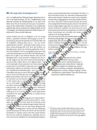M2 Wie lange haften die Nachgeborenen? Am 11. Juli 1986 greift der Philosoph Jürgen Habermas mit seinem in der Wochenzeitung „Die Zeit“ veröffentlichten Essay führende Historiker der Bundesrepublik an, vor allem Ernst Nolte. Dieser hat die Ursachen des Holocaust in Zusammenhang mit den stalinistischen Terrorakten in der Sowjetunion gebracht (M1). Daraus entstand eine heftige Debatte um die „Einmaligkeit“ des nationalsozialistischen Völkermordes („Historikerstreit“). Dazu schreibt Habermas: Unsere Situation hat sich, im Vergleich zu der vor vierzig Jahren […], gründlich verändert. Damals ging es um die Unterscheidung zwischen der persönlichen Schuld der Täter und der kollektiven Haftung derer, die es – aus wie immer verständ lichen Gründen – unterlassen hatten, etwas zu tun. Diese Unterscheidung trifft nicht mehr das Problem von Nachgeborenen, denen das Unterlassungshandeln ihrer Eltern und Großeltern nicht zur Last gelegt werden kann. Gibt es für diese überhaupt noch ein Problem der Mithaftung? […] Nach wie vor gibt es die einfache Tatsache, dass auch die Nachgeborenen in einer Lebensform aufgewachsen sind, in der das möglich war. Mit jenem Lebenszusammenhang, in dem Auschwitz möglich war, ist unser eigenes Leben […] innerlich verknüpft. Unsere Lebensform ist mit der Lebensform unserer Eltern und Großeltern verbunden durch ein schwer entwirrbares Gefl echt von familialen, ört lichen, politischen, auch intellektuellen Überlieferungen – durch ein geschichtliches Milieu also, das uns erst zu dem gemacht hat, was und wer wir heute sind. Niemand von uns kann sich aus diesem Milieu herausstehlen, weil mit ihm unsere Identität, sowohl als Individuen wie als Deutsche, unaufl öslich verwoben ist. […] Wir müssen also zu unseren Traditionen stehen, wenn wir uns nicht selber verleugnen wollen. […] Aber was folgt aus dieser existenziellen Verknüpfung mit Traditionen und Lebensformen, die durch unaussprechliche Verbrechen vergiftet worden sind? […] Überträgt sich etwas von dieser Haftung auch noch auf die nächste und die übernächste Generation? Aus zwei Gründen, denke ich, sollten wir die Frage bejahen. Da ist zunächst die Verpfl ichtung, dass wir in Deutschland – selbst wenn es niemand sonst mehr auf sich nähme – unverstellt, und nicht nur mit dem Kopf, die Erinnerung an das Leiden der von deutschen Händen Hingemordeten wachhalten müssen. […] Wenn wir uns über dieses Benjamin’sche Vermächtnis1 hinwegsetzten, würden jüdische Mitbürger, würden überhaupt die Söhne, die Töchter und die Enkel der Ermordeten in unserem Lande nicht mehr atmen können. Das hat auch politische Implikationen. Jedenfalls sehe ich nicht, wie sich das Verhältnis der Bundesrepublik beispielsweise zu Israel auf absehbare Zeit „normalisieren“ könnte. […] Nach Auschwitz können wir nationales Selbst bewusstsein allein aus den besseren Traditionen unserer nicht unbesehen, sondern kritisch angeeigneten Geschichte schöpfen. Wir können einen nationalen Lebenszusammenhang, der einmal eine unvergleichliche Versehrung der Substanz menschlicher Zusammengehörigkeit zugelassen hat, einzig im Lichte von solchen Traditionen fortbilden, die einem durch die moralische Katastrophe belehrten, ja argwöhnischen Blick standhalten. Sonst können wir uns selbst nicht achten und von anderen nicht Achtung erwarten. Diese Prämisse hat bisher das offi zielle Selbstverständnis der Bundesrepublik getragen. Der Konsens wird heute von rechts aufgekündigt. Man fürchtet nämlich eine Konsequenz: Eine kritisch sichtende Traditionsaneignung fördert in der Tat nicht das naive Vertrauen in die Sittlichkeit bloß eingewöhnter Verhältnisse; sie verhilft nicht zur Identifi kation mit ungeprüften Vorbildern. Jürgen Habermas, Vom öffentlichen Gebrauch der Historie, in: „Historikerstreit“. a. a. O., S. 246 ff. 1. Erläutern Sie, was Habermas mit einer „kritisch angeeigneten Geschichte“ (Zeile 43) meint. 2. Analysieren Sie, welche „Erkenntnisinteressen“ in der Interpretation des „Dritten Reiches“ Habermas bestimmten Gruppen von Zeitgenossen vorwirft. 3. Nehmen Sie Stellung zur Frage der „Mithaftung der Nachgeborenen“ und des „richtigen Umgangs“ mit der Geschichte des „Dritten Reiches“. Wie wirkt sich dies auf das deutsche Selbst verständnis aus? 5 10 15 20 25 30 35 40 45 50 55 1 Der Literaturwissenschaftler Walter Benjamin (1892 1940) war jüdischer Herkunft und nahm sich auf der Flucht vor der Gestapo das Leben. In seinen Aufzeichnungen fand sich die dringende Mahnung, dass die immerwährende Erinnerung an die grausamen Verbrechen der Deutschen die einzig mögliche Sühne wäre. 395Umgang mit der NS-Zeit Nu r z u Pr üf zw ec ke Ei ge nt um d s C .C .B uc hn er V rla gs | |
