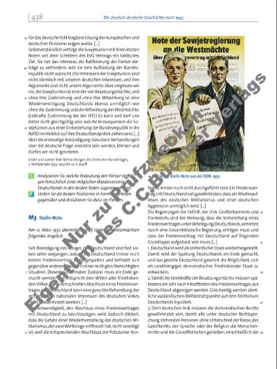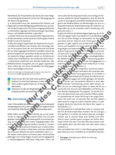 439Die Entwicklung der Bundesrepublik Deutschland 1945 1989 Redefreiheit, der Pressefreiheit, des Rechts der freien Religionsausübung, der Freiheit der politischen Überzeugung und der Versammlungsfreiheit. 4. In Deutschland muss den demokratischen Parteien und Organisationen freie Betätigung gewährleistet sein, sie müssen das Recht haben, über ihre inneren Angelegenheiten frei zu entscheiden, Tagungen und Versammlungen abzuhalten, Presseund Publikationsfreiheit zu genießen. 5. Auf dem Territorium Deutschlands dürfen Organisationen, die der Demokratie und der Sache der Erhaltung des Friedens feindlich sind, nicht bestehen. 6. Allen ehemaligen Angehörigen der deutschen Armee, einschließlich der Offi ziere und Generäle, allen ehemaligen Nazis, mit Ausnahme derer, die nach Gerichtsurteil eine Strafe für von ihnen begangene Verbrechen verbüßen, müssen die gleichen bürgerlichen und politischen Rechte wie allen anderen deutschen Bürgern gewährt werden zur Teilnahme am Aufbau eines friedliebenden, demokratischen Deutschland. 7. Deutschland verpfl ichtet sich, keinerlei Koalitionen oder Militärbündnisse einzugehen, die sich gegen irgendeinen Staat richten, der mit seinen Streitkräften am Krieg gegen Deutschland teilgenommen hat. Zitiert nach: http://germanhistorydocs.ghi-dc.org/sub_document.cfm? document_id=3082&language=german [05. 09. 2016] 1. Fassen Sie den Kern der Stalin-Note zusammen. 2. Verfassen Sie einen Brief Adenauers, in dem er seine Position zu dem Angebot Stalins an US-Präsident Truman übermittelt. 3. Diskutieren Sie über die Möglichkeiten einer Wiedervereinigung auf Basis des Vorschlags Stalins. M4 Innere Ordnung und Demokratie In der Schlussdebatte des Bundestages zur Verabschiedung der Notstandsgesetze am 30. Mai 1968 macht sich Außenminister und Vizekanzler Willy Brandt für die Gesetzesvorlage stark: Bisher hatten die Alliierten noch Rechte, die uns als Untermieter im eigenen Haus erscheinen ließen. Das soll jetzt geändert werden. Unsere Bundesrepublik ist erwachsen genug, um die Ordnung ihrer inneren Angelegenheiten ohne Einschränkung in die eigenen Hände zu nehmen. [...] An dem Tage, an dem eigene deutsche Gesetze zum Schutze unserer Demokratie in Notzeiten in Kraft treten, erlöschen die Rechte, die sich unsere Alliierten bis dahin vorbehalten haben. [...] Wir wissen, meine Damen und Herren, dass manche unserer Mitbürger noch immer fragen, ob denn die Vorsorgegesetze [= Notstandsgesetze] überhaupt nötig seien. Hierzu hat 45 50 55 60 5 10 nicht zuletzt der Bundesjustizminister, mein Kollege Dr. Heinemann, wiederholt darauf hingewiesen, dass der Verzicht auf ein im Grundgesetz verankertes Notstandsrecht unweigerlich das Wiederaufl eben von Bemühungen um eine außerparlamentarische Notstandsvorsorge der Exekutive zur Folge hätte, die an die Schranken unserer Verfassung nicht gebunden wäre. [...] Es gibt eine Kritik an der Notstandsgesetzgebung, die ich für reine Demagogie1 halte. Diese stützt sich in der Bevölkerung zum Teil auf einen Mangel an Vertrautheit mit Tatsachen, und daran sind wir vielleicht nicht immer ganz schuldlos gewesen. Es gibt zugleich eine andere Kritik, die ich ernst nehme und respektiere. Ich meine zahlreiche Männer unseres geistigen und wissenschaftlichen Lebens, aus denen eine ehrliche Sorge spricht. Manche von ihnen meinen, es könnte sich quer durch die Parteien eine Art „Partei der Ordnung“ im Sinne bloßer Beharrung bilden, die alle Unzulänglichkeiten des Bestehenden zementieren und in Versuchung geraten könnte, sich zu diesem Zweck auch der Vorsorgegesetze zu bedienen; eben damit würde sie einen tiefen Bruch im Volk, also einen Notstand hervorrufen. […] Wir sind [...] Zeugen einer erregenden, manchmal anstrengenden Unruhe der jungen Generation, die inzwischen über alle nationalen Grenzen hinausgewachsen ist. Sie fi ndet in jedem Land andere Anlässe des Protestes. Zum Teil ist sie von dem Aufbegehren gegen das Gefühl getragen, der einzelne Mensch könnte zum manipulierten Rädchen in einer alles beherrschenden Technisierung unserer Welt werden. Sie lehnt ab, sich von Erfahrungen leiten zu lassen, die für sie Geschichte sind. Sie sucht nach Maßstäben und Werten, die über Wohlstandskategorien hinausgehen. Sie möchte Technik in den Dienst ihres noch unformulierten Willens stellen. Ich sympathisiere mit dieser Strömung in der jungen Generation. Das weiß man. Ich wünsche, dass sie ihren Idealen näher kommen möge, als andere imstande waren, im Laufe jüngerer deutscher Geschichte die Ideale ihrer Jugend zu verwirklichen. [...] Die demokratische Empfi ndlichkeit vieler in unserem Volk hat sich als leicht ansprechbar erwiesen. Das ist auch gut. Doch gehöre ich zu denen, die meinen, dass wir uns fragen müssen, was in unserem Staat nicht stimmt, noch nicht stimmt, wenn zuweilen ganze Gruppen von tiefem Misstrauen erfüllt sind, wenn man dem Wort des anderen nicht mehr glaubt, wenn alle allen alles oder viele vielen vieles zutrauen. [...] Dies und anderes hat mich [...] in der Überzeugung bestärkt, dass vieles doch noch notleidend ist im Verhältnis zwischen 1 Demagogie: Aufwiegelung der öffentlichen Meinung, politische Hetze 15 20 25 30 35 40 45 50 55 Nu r z u Pr üf zw ec ke n Ei ge nt um d es C .C .B uc hn er V e la gs | |