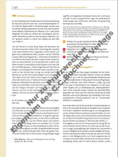 131Fallbeispiel: China und die imperialistischen Mächte eine Kultur kommt, die nicht auf dem Christentum aufgebaut ist: Jede heidnische Kultur, mag sie noch so schön und herrlich sein, geht zugrunde, wenn große Aufgaben an sie herantreten. So sende ich Euch aus, dass Ihr bewähren sollt einmal Eure alte deutsche Tüchtigkeit, zum zweiten die Hingebung, die Tapferkeit und das freudige Ertragen jedweden Ungemachs und zum dritten Ehre und Ruhm unserer Waffen und Fahnen. Ihr sollt Beispiele abgeben von der Manneszucht und Disziplin, aber auch der Überwindung und Selbstbeherrschung. Ihr sollt fechten gegen eine gut bewaffnete Macht, aber Ihr sollt auch rächen, nicht nur den Tod des Gesandten, sondern auch vieler Deutscher und Europäer. Kommt ihr an den Feind, so wird er geschlagen, Pardon wird nicht gegeben; Gefangene nicht gemacht. Wer Euch in die Hände fällt, sei in Eurer Hand. Wie vor tausend Jahren die Hunnen unter König Etzel sich einen Namen gemacht, der sie noch jetzt in der Überlieferung gewaltig erscheinen lässt, so möge der Name Deutschland in China in einer solchen Weise bekannt werden, dass niemals wieder ein Chinese es wagt, einen Deutschen auch nur scheel anzusehen. [...] Gebt, wo es auch sei, Beweise Eures Mutes, und der Segen Gottes wird sich an Eure Fahnen heften und es Euch geben, dass das Christentum in jenem Lande seinen Eingang fi nde. Dafür steht Ihr Mir mit Eurem Fahneneid, und nun glückliche Reise. Adieu Kameraden. Bernd Sösemann, Die sogenannte Hunnenrede Wilhelms II. Textkritische und interpretatorische Bemerkungen zur Ansprache des Kaisers vom 27. Juli 1900 in Bremerhaven, in: Historische Zeitschrift 222 (1976), S. 349 f. 1. Geben Sie die wesentlichen Inhalte der Ansprache Kaiser Wilhelms II. wieder. 2. Analysieren Sie Stil und Wortwahl der Ansprache. Charakterisieren Sie die Sichtweise des Kaisers gegenüber China. 3. Erklären Sie, welche Bedeutung der Anspielung auf die Hunnen zukommt und was dies über das Selbstverständnis des Kaisers aussagt. 4. Erörtern Sie, warum die Reichsbehörden eine Veröffentlichung der vollständigen Rede zu verhindern suchten. M10 China unter der Guomindang Der Historiker Thoralf Klein beschreibt die Schwierigkeiten der Guomindang (GMD)-Regierung, China zu stabilisieren: In der Zeit zwischen 1927 und 1937 (der sogenannten Nanjing-Periode) verfolgte die GMD mit Chiang Kaishek1 an der Spitze den Plan eines umfassenden Aufbaus. Trotz vieler Anstrengungen und Erfolge und obwohl es seine Herrschaft wenn nötig mit brutaler Gewalt verteidigte, verfügte das Regime über keine hinreichende Stabilität. Chiang Kaishek konnte sich weder auf die Loyalität der Partei noch auf diejenige des Militärs vollständig verlassen. Bis Mitte der 1930erJahre führten Meutereien und Rebellionen von Koalitionen aus innerparteilichen Gegnern Chiangs und regionalen Militärmachthabern immer wieder zu regelrechten Bürgerkriegen. Schon im Herbst 1927 kam es zur militärischen Auseinandersetzung zwischen der Regierung Chiangs in Nanjing und einer prokommunistisch eingestellten GMD-Gegenregierung in Wuhan, die eine schwere Niederlage hinnehmen musste und daraufhin zusammenbrach. Zwischen 1931 und 1936 befand sich mit der Provinz Guangdong sogar die ursprüngliche Machtbasis der GMD in offener Sezession von der Regierung in Nanjing. Während Chiang bis Mitte der 1930er-Jahre die Oberhand über seine Gegner in den eigenen Reihen gewann, gelang es ihm nicht, den Bürgerkrieg mit den Kommunisten und ihrer Roten Armee erfolgreich zu beenden. In vier Einkreisungsfeldzügen erwies sich die kommunistische Partisanenstrategie als erfolgreich. Erst die fünfte, von deutschen Militärberatern eingeleitete Kampagne von Herbst 1933 bis Frühjahr 1934 brachte die kommunistischen Streitkräfte vor allem durch die konsequente Abriegelung des Sowjetgebiets mittels eines Systems von Blockhäusern an den Rand der Niederlage. Die Führung der KPCh2 ordnete daher schließlich die Evakuierung der Sowjets an und ließ nur eine Nachhut zur Abwehr der GMD-Streitkräfte zurück. Rund 90 000 Menschen machten sich im Oktober 1934 auf den später so genannten Langen Marsch. Nach einem außerordentlich verlustreichen Exodus durch die Provinzen Südwestchinas erreichten ein Jahr später rund 8 000 bis 9 000 Über lebende die nordwestliche Provinz Shaanxi, wo die Partei 1936 ihr neues Hauptquartier in der kleinen Stadt Yan’an einrichtete. Thoralf Klein, a. a. O., S. 51 1. Fassen Sie zusammen, wodurch nach Thoralf Klein die Guomindang-Regierung geschwächt wird. 2. Erläutern Sie anhand des Textes, wie die GuomindangRegierung mit ihren Gegnern umgeht. 3. Beurteilen Sie, was die innere Bedrohung der GMDHerrschaft für den späteren Krieg gegen Japan (seit 1937) bedeutete. 2 KPCh: Kommunistische Partei Chinas; 1921 gegründet, seit 1949 vorherrschende Partei der Volksrepublik China 1 Chiang Kaishek (1887 1975): chinesischer Politiker und Offi zier, seit 1925 Parteiführer der Guomindang 20 25 30 35 5 10 15 20 25 30 35 Nu r z u Pr üf zw ec ke Ei ge nt um d es C .C .B uc hn er V rla gs | |