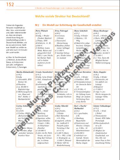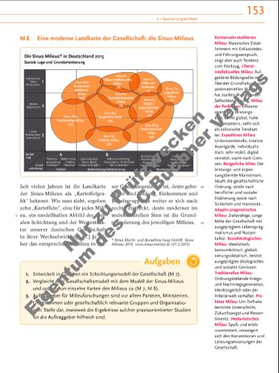 153 M 8 Eine moderne Landkarte der Gesellschaft: die Sinus-Milieus Die Sinus-Milieus® in Deutschland 2015 Soziale Lage und Grundorientierung © SINUS Soziale Lage orientierung Untere Unterschicht 3 Mittlere Mittelschicht 2 Obere Mittelschicht 1 Modernisierung/Individualisierung Tradition Neuorientierung Modernisierte Tradition "Bewahren" Lebensstandard, Status, Besitz "Haben & Genießen" Multioptionalität, Beschleunigung, Pragmatismus "Machen & Erleben" Selbstverwirklichung, Emanzipation, Authentizität "Sein & Verändern" CBA Exploration, Refokussierung, neue Synthesen "Grenzen überwinden" Sinus C1 Milieu der Performer 7% Sinus C12 Expeditives Milieu 7% Sinus BC23 Hedonistisches Milieu 15% Sinus B1 Milieu 7% Sinus AB12 etabliertes Milieu 10% Sinus AB23 Traditionelles Milieu 14% Sinus B23 14% Sinus B3 9% Sinus C2 pragmatisches Milieu 9% Sinus B12 Sozialökologisches Milieu 7% Oberschicht/ Mittelschicht/ GrundKonservativLiberal-intellektuelles Bürgerliche Mitte Prekäres Milieu AdaptivTraditionsverwurzelung "Festhalten" 5 Seit vielen Jahren ist die Landkarte der Sinus-Milieus als „Kartoffelgrafi k“ bekannt. Wie man sieht, ergeben zehn „Kartoffeln“, eine für jedes Milieu, ein modellhaftes Abbild der sozialen Schichtung und der Wertestruktur unserer deutschen Gesellschaft in ihrer Wechselwirkung. [...] Je höher das entsprechende Milieu in dieser Grafi k angesiedelt ist, desto gehobener sind Bildung, Einkommen und Berufsgruppe; je weiter er sich nach rechts erstreckt, desto moderner im soziokulturellen Sinn ist die Grundorientierung des jeweiligen Milieus. © Sinus Marktund Sozialforschung GmbH, Sinus Milieus 2015, www.sinus-institut.de (27.3.2015) 10 15 Aufgaben 1. Entwickelt in Gruppen ein Schichtungsmodell der Gesellschaft (M 7). 2. Vergleicht euer Gesellschaftsmodell mit dem Modell der Sinus-Milieus und ordnet nun einzelne Karten den Milieus zu (M 7, M 8). 3. Auftraggeber für Milieuforschungen sind vor allem Parteien, Ministerien, Unternehmen oder gesellschaftlich relevante Gruppen und Organisationen: Stelle dar, inwieweit die Ergebnisse solcher praxisorientierter Studien für die Auftraggeber hilfreich sind. Konservativ-etabliertes Milieu: Klassisches Establishment mit Exklusivitäts und Führungsanspruch, zeigt aber auch Tendenz zum Rückzug. Liberalintellektuelles Milieu: Aufgeklärte Bildungselite mit liberaler Grundhaltung und postmateriellen Wurzeln, hat starken Wunsch nach Selbstbestimmung. Milieu der Performer: Effi zienzorientierte Leistungselite, denkt global, hohe IT-Kompetenz, sieht sich als stilistische Trendsetter. Expeditives Milieu: Unkonventionelle, kreative Avantgarde, individualistisch, sehr mobil, digital vernetzt, sucht nach Grenzen. Bürgerliche Mitte: Der leistungsund anpassungsbereite Mainstream, bejaht die gesellschaftliche Ordnung, strebt nach berufl icher und sozialer Etablierung sowie nach Sicherheit und Harmonie. Adaptiv-pragmatisches Milieu: Zielstrebige, junge Mitte der Gesellschaft mit ausgeprägtem Lebenspragmatismus und Nutzenkalkül. Sozialökologisches Milieu: Idealistisch, konsumkritisch, globalisierungsskeptisch, besitzt ausgeprägtes ökologisches und soziales Gewissen. Traditionelles Milieu: Ordnungsliebende Kriegs und Nachkriegsgeneration, kleinbürgerlich oder der Arbeiterwelt verhaftet. Prekäres Milieu: Um Teilhabe bemühte Unterschicht, Zukunftsangst und Ressentiments. Hedonistisches Milieu: Spaßund erlebnisorientiert, verweigert sich den Konventionen und Leistungserwartungen der Gesellschaft. 6.1 Soziale Ungleichheit Nu r z u Pr üf zw ec ke n Ei g nt um d es C .C .B uc ne r V rla gs | |