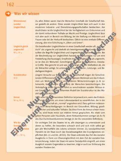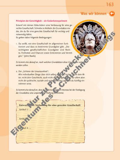 163 Was wir können Prinzipien der Gerechtigkeit – ein Gedankenexperiment Entwirf mit deinen Mitschülern eine Verfassung für eine gerechte Gesellschaft. Schreibe in Artikeln die Grundsätze nieder, die du für eine gerechte Gesellschaft für wichtig und notwendig hältst. Es gelten dabei folgende Bedingungen: 1. Du weißt, wie eine Gesellschaft im allgemeinen funktioniert und dass es bestimmte Grundgüter gibt. „Die wichtigsten gesellschaftlichen Grundgüter sind Rechte, Freiheiten und Chancen sowie Einkommen und Vermögen.“ (John Rawls) Es kommt also darauf an, nach welchen Grundsätzen diese Grundgüter verteilt werden sollen. 2. Der „Schleier der Unwissenheit“: Alle individuellen Dinge über dich selbst weißt du nicht – nicht dein Alter, nicht dein Geschlecht, auch nicht deine Begabungen, vor allem aber nicht die politische, soziale und wirtschaftliche Lage, die du künftig einnehmen wirst. Es kommt also darauf an, dass du in deinem eigenen Interesse bei der Festlegung der Grundsätze eine unparteiische Haltung einnimmst. Entwurf einer Verfassung für eine gerechte Gesellschaft Artikel 1: ... Artikel 2: ... Artikel 3: ... Nu r z u Pr üf zw ec ke n Ei ge nt um d es C .C .B u hn er V er la gs | |