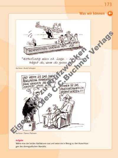 173 Was wir können Aufgabe Wähle eine der beiden Karikaturen aus und setze sie in Bezug zu den Auswirkungen des demografi schen Wandels. Karikatur: Rudolf Schoepper Karikatur: Thomas Plaßmann Nu r z u Pr üf zw ec ke n Ei ge nt um d es C .C .B uc hn er V er la gs | |