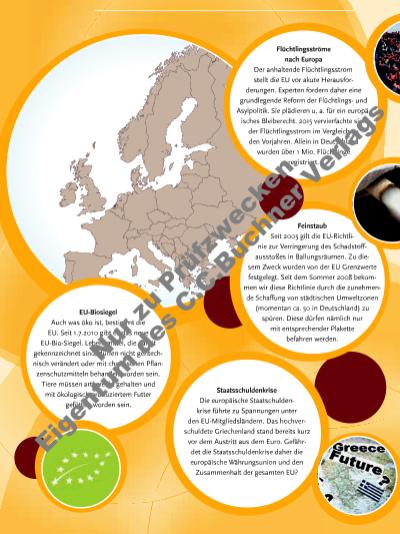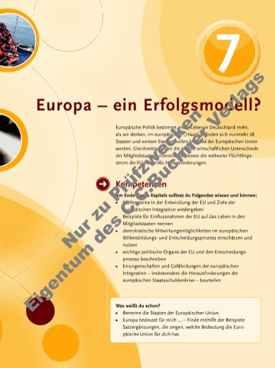 7.1 Die Europäische Union – „in Vielfalt geeint“? Europa – ein Erfolgsmodell? Europäische Politik bestimmt unser Leben in Deutschland mehr, als wir denken. Im europäischen „Haus“ befi nden sich nunmehr 28 Staaten und weitere Staaten wollen Mitglied der Europäischen Union werden. Gleichzeitig stellen die großen wirtschaftlichen Unterschiede der Mitgliedstaaten untereinander sowie der weltweite Flüchtlingsstrom die EU vor große Herausforderungen. Kompetenzen Am Ende dieses Kapitels solltest du Folgendes wissen und können: • Meilensteine in der Entwicklung der EU und Ziele der europäischen Integration wiedergeben • Beispiele für Einfl ussnahmen der EU auf das Leben in den Mitgliedstaaten nennen • demokratische Mitwirkungsmöglichkeiten im europäischen Willensbildungsund Entscheidungsprozess einschätzen und nutzen • wichtige politische Organe der EU und den Entscheidungsprozess beschreiben • Errungenschaften und Gefährdungen der europäischen Integration – insbesondere die Herausforderungen der europäischen Staatsschuldenkrise – beurteilen Was weißt du schon? • Benenne die Staaten der Europäischen Union. • Europa bedeutet für mich … – Finde mithilfe der Beispiele Satzergänzungen, die zeigen, welche Bedeutung die Europäische Union für dich hat. 7 Nu r z u Pr üf zw ck en Ei ge nt um d es C .C .B uc hn er V er la gs | |