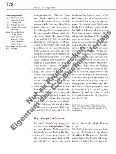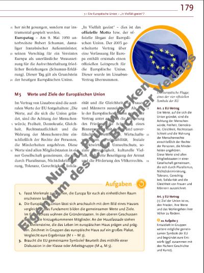 179 7.1 Die Europäische Union – „in Vielfalt geeint“? 15 20 25 5 10 M 5 Werte und Ziele der Europäischen Union Im Vertrag von Lissabon sind die zentralen Werte der EU festgehalten: „Die Werte, auf die sich die Union gründet, sind die Achtung der Menschenwürde, Freiheit, Demokratie, Gleichheit, Rechtsstaatlichkeit und die Wahrung der Menschenrechte einschließlich der Rechte der Personen, die Minderheiten angehören. Diese Werte sind allen Mitglied staaten in einer Gesellschaft gemeinsam, die sich durch Pluralismus, Nichtdiskriminierung, Toleranz, Gerech tigkeit, Solidarität und die Gleichheit von Frauen und Männern auszeichnet.“ Als Ziele der Europäischen Union nennt der Vertrag unter anderen die Förderung des Friedens, die Schaffung eines Binnenmarkts mit freiem und unverfälschtem Wettbewerb, Wirtschaftswachstum, Preisstabilität, Soziale Marktwirtschaft, Umweltschutz, soziale Gerechtigkeit, kulturelle Vielfalt, weltweite Beseitigung der Armut und die Förderung des Völkerrechts. Art. 2 EU-Vertrag Die Werte, auf die sich die Union gründet, sind die Achtung der Menschenwürde, Freiheit, Demokratie, Gleichheit, Rechtsstaatlichkeit und die Wahrung der Menschenrechte einschließlich der Rechte der Personen, die Minderheiten angehören. Diese Werte sind allen Mitgliedstaaten in einer Gesellschaft gemeinsam, die sich durch Pluralismus, Nichtdiskriminierung, Toleranz, Gerechtigkeit, Solidarität und die Gleichheit von Frauen und Männern auszeichnet. Art. 3 EU-Vertrag (1) Ziel der Union ist es, den Frieden, ihre Werte und das Wohlergehen ihrer Völker zu fördern. 15 20 25 her nicht gesungen, sondern nur instrumental gespielt werden. Europatag – Am 9. Mai 1950 unterbreitete Robert Schuman, damaliger französischer Außenminister, seinen Vorschlag für ein Vereintes Europa als unerlässliche Voraussetzung für die Aufrechterhaltung friedlicher Beziehungen (Schuman-Erklärung). Dieser Tag gilt als Grundstein der heutigen Europäischen Union. „In Vielfalt geeint“ – dies ist das offi zielle Motto bzw. der offi zielle Slogan der Europäischen Union. Der 2005 gescheiterte Vertrag über eine Verfassung für Europa enthält erstmals einen offi ziellen Leitspruch für die Europäische Union. Dieser wurde im LissabonVertrag übernommen. Die europäische Flagge; eines der vier offi ziellen Symbole der EU Aufgaben 1. Fasst Merkmale zusammen, die Europa für euch als einheitlichen Raum erscheinen lassen. 2. Die Europäische Union lässt sich anschaulich mit dem Bild eines Hauses vergleichen. Das Fundament bilden die gemeinsamen Werte und Ziele. Im Erdgeschoss wohnen die Gründerstaaten. In den oberen Geschossen wohnen die hinzugekommenen Mitglieder. An der Hausfassade stehen die Meilensteine, die das Leben im europäischen Haus prägen und prägten. Zeichnet in Gruppen das europäische Haus auf ein großes Plakat. Vergleicht eure Ergebnisse (M 1 – M 3). 3. Braucht die EU gemeinsame Symbole? Beurteilt dies mithilfe einer Diskussion in der Klasse oder Arbeitsgruppe (M 4, M 5). zu Aufgabe 3 Entwickelt in Gruppen weitere mögliche gemeinsamen Symbole der EU und begründet eure Entwürfe (ggf. zusammen mit den Fächern Geschichte und Kunst). Nu r z u Pr üf zw ec ke n Ei ge nt u d es C .C .B uc hn er V er la gs | |
