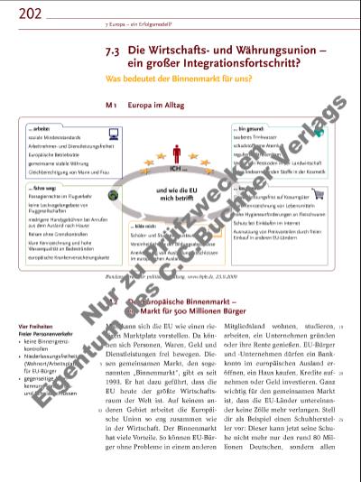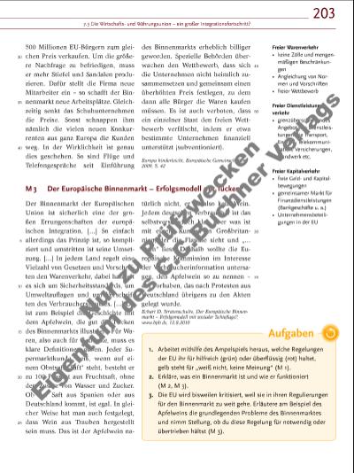 203 7.3 Die Wirtschaftsund Währungsunion – ein großer Integrationsfortschritt? 30 35 Freier Warenverkehr • keine Zölle und mengenmäßigen Beschränkungen • Angleichung von Normen und Vorschriften • freier Wettbewerb Freier Dienstleistungsverkehr • grenzüberschreitendes Angebot von Dienstleistungen wie Transport, Energie, Telekommunikation, Versicherungen, Handwerk etc. Freier Kapitalverkehr • freie Geldund Kapitalbewegungen • gemeinsamer Markt für Finanzdienstleistungen (Bankgeschäfte u. a.) • Unternehmensbeteiligungen in der EU 30 35 40 500 Millionen EU-Bürgern zum gleichen Preis verkaufen. Um die größere Nachfrage zu befriedigen, muss er mehr Stiefel und Sandalen produzieren. Dafür stellt die Firma neue Mitarbeiter ein – so schafft der Binnenmarkt neue Arbeitsplätze. Gleichzeitig senkt das Schuhunternehmen die Preise. Sonst schnappen ihm nämlich die vielen neuen Konkurrenten aus ganz Europa die Kunden weg. In der Wirklichkeit ist genau dies geschehen. So sind Flüge und Telefongespräche seit Einführung des Binnenmarkts erheblich billiger geworden. Spezielle Behörden überwachen den Wettbewerb, dass sich die Unternehmen nicht heimlich zusammensetzen und gemeinsam einen überhöhten Preis festlegen, zu dem dann alle Bürger die Waren kaufen müssen. Es ist auch verboten, dass ein einzelner Staat den freien Wettbewerb verfälscht, indem er etwa bestimmte Unternehmen fi nanziell unterstützt (subventioniert). Europa kinderleicht, Europäische Gemeinschaften 2009, S. 42 45 50 M 3 Der Europäische Binnenmarkt – Erfolgsmodell mit Tücken? Der Binnenmarkt der Europäischen Union ist sicherlich eine der großen Errungenschaften der europäischen Integration. [...] So einfach allerdings das Prinzip ist, so kompliziert und umstritten ist seine Umsetzung. [...] In jedem Land regelt eine Vielzahl von Gesetzen und Vorschriften den Warenverkehr, dabei handelt es sich um Sicherheitsstandards, um Umweltaufl agen und um Vorschriften des Verbraucherschutzes. […] Da ist zum Beispiel die Geschichte mit dem Apfelwein, die gut die Tücken des Binnenmarkts illustriert. Für Waren, also auch für Getränke, muss es klare Defi nitionen geben. Jeder Supermarktkunde weiß, wenn auf einem Obstsaft „Saft“ steht, besteht er zu 100 Prozent aus Fruchtsaft, ohne den Zusatz von Wasser und Zucker. Ob der Saft aus Spanien oder aus Deutschland kommt, ist egal. In gleicher Weise hat man auch festgelegt, dass Wein aus Trauben hergestellt sein muss. Das ist der Apfelwein na5 10 15 20 25 Aufgaben türlich nicht, er ist also kein Wein. Jedem deutschen Verbraucher ist das selbstverständlich klar, aber was ist mit einem Kunden in Großbritannien, der die Flasche sieht und „... wein“ liest? Deshalb wollte die Europäische Kommission im Interesse der Verbraucherinformation untersagen, den Apfelwein so zu nennen – ein Vorhaben, das nach Protesten aus Deutschland übrigens zu den Akten gelegt wurde. Eckart D. Stratenschulte, Der Europäische Binnenmarkt – Erfolgsmodell mit sozialer Schiefl age?, www.bpb.de, 12.8.2010 1. Arbeitet mithilfe des Ampelspiels heraus, welche Regelungen der EU ihr für hilfreich (grün) oder überfl üssig (rot) haltet, gelb steht für „weiß nicht, keine Meinung“ (M 1). 2. Erkläre, was ein Binnenmarkt ist und wie er funktioniert (M 2, M 3). 3. Die EU wird bisweilen kritisiert, weil sie in ihren Regulierungen für den Binnenmarkt zu weit gehe. Erläutere am Beispiel des Apfelweins die grundlegenden Probleme des Binnenmarktes und nimm Stellung, ob du diese Regelung für notwendig oder übertrieben hältst (M 3). Nu zu P rü fzw ec ke n Ei ge nt um d es C .C .B uc hn er V er la gs | |
