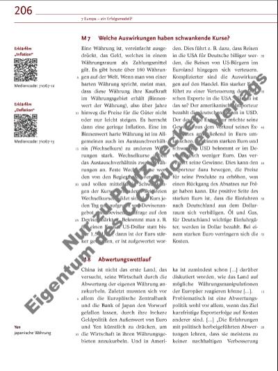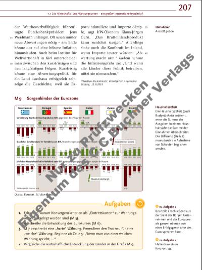 207 Griechenland Veränderung des Bruttoinlandsprodukts (BIP) gegenüber dem Vorjahr in Prozent Staatlicher Schuldenstand im Verhältnis zum BIP, Veränderungen gegenüber dem Vorjahr in Prozent Jährliches Haushaltsdefizit im Verhältnis zum BIP, Veränderungen gegenüber dem Vorjahr in Prozent Portugal Spanien Italien Zypern Irland 2010 2011 2012 2013 -4,9 -7,1 -6,4 -4,4 2010 2011 2012 2013 10,7 9,4 6,6 4,6 2010 2011 2012 2013 9,8 4,4 5,0 4,9 2010 2011 2012 2013 9,7 9,4 10,2 6,7 2010 2011 2012 Maastricht-Limit bei 3%! !Maastricht-Limit bei 60% 2013 4,5 3,9 2,9 2,1 2010 2011 2012 2013 5,3 6,3 5,5 4,5 2010 2011 2012 2013 30,9 13,4 7,7 7,3 2010 2011 2012 2013 +1,9 -1,6 -3,2 -1,9 2010 2011 2012 2013 -0,3 +0,4 -1,4 -1,4 2010 2011 2012 2013 +1,8 +0,4 -2,2 -1,0 2010 2011 2012 2013 +1,3 +0,5 -2,3 -3,5 2010 2011 2012 2013 -0,8 +1,4 +0,7 +1,1 2010 2011 Schätzungen für 2012 und 2013 2012 2013 148 171 162 176 2010 2011 2012 2013 108 121 124 94 2010 2011 2012 2013 62 69 88 96 +0,4 2010 2011 2012 2013 127 128119 121 2010 2011 2012 2013 61 71 87 93 2010 92 2011 2012 2013 106 117 122 25 30 der Wettbewerbsfähigkeit führen“, sagte Bundesbankpräsident Jens Weidmann unlängst. Oft seien immer neue Abwertungen nötig – am Ende könne das auf eine höhere Infl ation hinauslaufen. Auch beim Institut für Weltwirtschaft in Kiel unterscheidet man zwischen den kurzfristigen und den langfristigen Folgen. Kurzfristig könne eine Abwertungspolitik für ein Land durchaus erfolgreich sein, zeige die Geschichte, weil sie Exporte stimuliere und Importe dämpfe, sagt IfW-Ökonom Klaus-Jürgen Gern. „Das Bruttoinlandsprodukt kann zunächst steigen.“ Allerdings sinke auch die Kaufkraft im Inland, wenn Importe teurer würden: „Abwertung macht arm.“ Zudem nehme die Infl ationsgefahr zu: „Und wenn alle Länder diese Politik betreiben, nützt sie niemandem.“ Christian Siedenbiedel, Frankfurter Allgemeine Zeitung, 12.8.2015 35 40 Aufgaben M 9 Sorgenkinder der Eurozone Quelle: Eurostat, EU-Kommission Haushaltsdefi zit Ein Haushaltsdefi zit (auch Budgetdefi zit) entsteht, wenn die Summe der Ausgaben in einem Haushaltsjahr die Summe der Einnahmen überschreitet. Die Differenz (Defi zit) muss durch die Aufnahme von Schulden beglichen werden. stimulieren Anstoß geben 1. Erläutere, warum Konvergenzkriterien als „Eintrittskarten“ zur Währungsunion festgelegt worden sind (M 5). 2. Beschreibe die Entwicklung des Eurokurses (M 6). 3. M 7 beschreibt eine „harte“ Währung. Formuliere den Text neu für eine „weiche“ Währung. Beginne ab Zeile 5: „Wenn man von einer weichen Währung spricht, …“ 4. Vergleiche die wirtschaftliche Entwicklung der Länder in der Grafi k M 9. zu Aufgabe 4 Halte dazu einen Kurzvortrag. zu Aufgabe 2 Beurteile anschließend aus der Sicht der Bürger, Unternehmen und der Eurozone als ganzer, ob man von einer Erfolgsgeschichte des Euro sprechen kann. 7.3 Die Wirtschaftsund Währungsunion – ein großer Integrationsfortschritt? Nu r z u Pr üf zw ec ke n Ei ge nt um d es C. C. Bu ch ne r V er la gs | |
