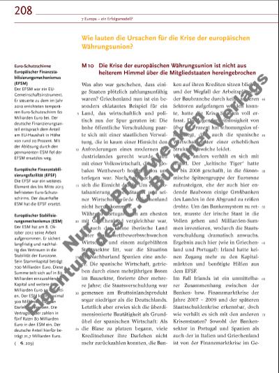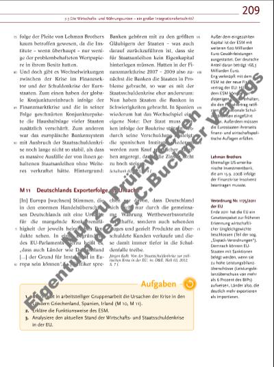 209 95 100 105 110 folge der Pleite von Lehman Brothers kaum betroffen gewesen, da die Institute – wenn überhaupt – nur wenige der problembehafteten Wertpapiere in ihrem Besitz hatten. Und doch gibt es Wechselwirkungen zwischen der Krise im Finanzsektor und der Schuldenkrise der Eurostaaten. Zum einen haben der globale Konjunktureinbruch infolge der Finanzmarktkrise und die in seiner Folge geschnürten Konjunkturpakete die Haushaltslage vieler Staaten zusätzlich verschärft. Zum anderen war das europäische Bankensystem mit Ausbruch der Staatsschuldenkrise noch lange nicht so stabil, als dass es massive Ausfälle der von ihnen gehaltenen Staatsanleihen ohne Weiteres verkraftet hätte. Hintergrund: Banken gehören mit zu den größten Gläubigern der Staaten – was auch darauf zurückzuführen ist, dass sie für Staatsanleihen kein Eigenkapital hinterlegen müssen. Hatten in der Finanzmarktkrise 2007 – 2009 also zunächst die Banken die Staaten in Probleme gebracht, so war es mit der Staatsschuldenkrise eher andersrum: Nun haben Staaten die Banken in Schwierigkeiten gebracht. In Spanien wiederum hat das Wechselspiel eine eigene Note: Der Staat muss Banken infolge der Baukrise stützen, wodurch seine Verschuldung ansteigt; die spanischen Institute wiederum werden zum Kauf spanischer Anleihen angeregt, damit die Zinsen nicht zu hoch steigen. Schulbank 02/2013, S. 4 f. 75 80 85 90 Aufgaben Außer dem eingezahlten Kapital ist der ESM mit weiteren 620 Milliarden Euro Gewährleistungen ausgestattet. Der deutsche Anteil daran beträgt 168,3 Milliarden Euro. Eng verknüpft mit dem ESM ist der neue Fiskalvertrag der EU: Hilfen aus dem ESM können nur diejenigen Länder erhalten, die den Fiskalvertrag ratifi ziert und nationale Schuldenbremsen eingeführt haben. Außerdem müssen die Eurostaaten ihrerseits fi nanzund wirtschaftspolitische Aufl agen erfüllen. Verordnung Nr. 1175/2011 der EU Ende 2011 hat die EU ein Gesetzespaket zur früheren Erkennung wirtschaftlicher Ungleichgewichte beschlossen (Teil der sog. „Sixpack-Verordnungen“). Demnach können EUStaaten mit Sanktionen belegt werden, wenn sie zu hohe Leistungsbilanzüberschüsse (Leistungsbilanzüberschuss von mehr als 6 Prozent des BIPs) aufweisen, Länder also, die deutlich mehr exportieren als importieren.1. Beschreibt in arbeitsteiliger Gruppenarbeit die Ursachen der Krise in den Ländern Griechenland, Spanien, Irland (M 10, M 11). 2. Erkläre die Funktionsweise des ESM. 3. Analysiere den aktuellen Stand der Wirtschaftsund Staatsschuldenkrise in der EU. M 11 Deutschlands Exporterfolge als Ursache 5 10 [In] Europa [wachsen] Stimmen, die in den enormen Handelsüberschüssen Deutschlands mit eine Ursache für die mangelnde Konkurrenzfähigkeit der jeweils heimischen Produkte sehen. In einer Begründung des EU-Parlaments hierzu heißt es, „dass auch Länder wie Deutschland […] der Grund für Instabilität in Europa sein können“. […] Kritiker sprechen gar davon, dass Deutschland sich nicht nur durch die gemeinsame Währung Wettbewerbsvorteile verschaffe, sondern auch sehenden Auges und gezielt Produkte an überschuldete Kunden verkaufe und diese damit immer tiefer in die Schuldenfalle treibe. Jürgen Kalb, Von der Staatsschuldenkrise zur politischen Krise in der EU, in: D&E, Heft 63, 2012, S. 7 f. 15 Lehman Brothers Ehemalige US-amerikanische Investmentbank, die am 15.9. 2008 infolge der Finanzkrise Insolvenz beantragen musste. 7.3 Die Wirtschaftsund Währungsunion – ein großer Integrationsfortschritt? Nu r u Pr üf zw ck en ig en tu m d es C .C .B uc hn er V rla gs | |