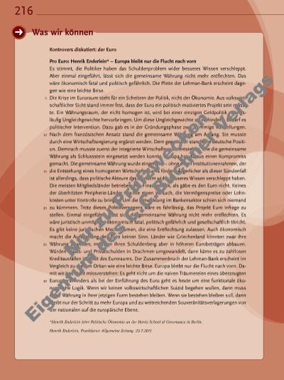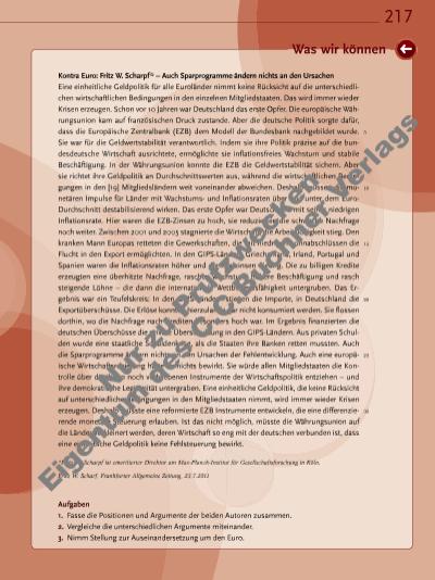 7.1 Die Europäische Union – „in Vielfalt geeint“? 217 Aufgaben 1. Fasse die Positionen und Argumente der beiden Autoren zusammen. 2. Vergleiche die unterschiedlichen Argumente miteinander. 3. Nimm Stellung zur Auseinandersetzung um den Euro. Kontra Euro: Fritz W. Scharpf* – Auch Sparprogramme ändern nichts an den Ursachen Eine einheitliche Geldpolitik für alle Euroländer nimmt keine Rücksicht auf die unterschiedlichen wirtschaftlichen Bedingungen in den einzelnen Mitgliedstaaten. Das wird immer wieder Krisen erzeugen. Schon vor 10 Jahren war Deutschland das erste Opfer. Die europäische Währungsunion kam auf französischen Druck zustande. Aber die deutsche Politik sorgte dafür, dass die Europäische Zentralbank (EZB) dem Modell der Bundesbank nachgebildet wurde. Sie war für die Geldwertstabilität verantwortlich. Indem sie ihre Politik präzise auf die bundesdeutsche Wirtschaft ausrichtete, ermöglichte sie infl ationsfreies Wachstum und stabile Beschäftigung. In der Währungsunion konnte die EZB die Geldwertstabilität sichern. Aber sie richtet ihre Geldpolitik an Durchschnittswerten aus, während die wirtschaftlichen Bedingungen in den [19] Mitgliedsländern weit voneinander abweichen. Deshalb müssen die monetären Impulse für Länder mit Wachstumsund Infl ationsraten über und unter dem EuroDurchschnitt destabilisierend wirken. Das erste Opfer war Deutschland mit seiner niedrigen Infl ationsrate. Hier waren die EZB-Zinsen zu hoch, sie reduzierten die schwache Nachfrage noch weiter. Zwischen 2001 und 2005 stagnierte die Wirtschaft, die Arbeitslosigkeit stieg. Den kranken Mann Europas retteten die Gewerkschaften, die mit niedrigen Lohnabschlüssen die Flucht in den Export ermöglichten. In den GIPS-Ländern Griechenland, Irland, Portugal und Spanien waren die Infl ationsraten höher und die Realzinsen niedrig. Die zu billigen Kredite erzeugten eine überhitzte Nachfrage, rasches Wachstum, höhere Beschäftigung und rasch steigende Löhne – die dann die internationale Wettbewerbsfähigkeit untergruben. Das Ergebnis war ein Teufelskreis: In den GIPS-Ländern stiegen die Importe, in Deutschland die Exportüberschüsse. Die Erlöse konnten hierzulande gar nicht konsumiert werden. Sie fl ossen dorthin, wo die Nachfrage nach Krediten besonders hoch war. Im Ergebnis fi nanzierten die deutschen Überschüsse die private Überschuldung in den GIPS-Ländern. Aus privaten Schulden wurde eine staatliche Schuldenkrise, als die Staaten ihre Banken retten mussten. Auch die Sparprogramme ändern nichts an den Ursachen der Fehlentwicklung. Auch eine europäische Wirtschaftsregierung hätte da nichts bewirkt. Sie würde allen Mitgliedstaaten die Kontrolle über die ihnen noch verbliebenen Instrumente der Wirtschaftspolitik entziehen – und ihre demokratische Legitimität untergraben. Eine einheitliche Geldpolitik, die keine Rücksicht auf unterschiedliche Bedingungen in den Mitgliedstaaten nimmt, wird immer wieder Krisen erzeugen. Deshalb müsste eine reformierte EZB Instrumente entwickeln, die eine differenzierende monetäre Steuerung erlauben. Ist das nicht möglich, müsste die Währungsunion auf die Länder verkleinert werden, deren Wirtschaft so eng mit der deutschen verbunden ist, dass eine einheitliche Geldpolitik keine Fehlsteuerung bewirkt. *Fritz W. Scharpf ist emeritierter Direktor am Max-Planck-Institut für Gesellschaftsforschung in Köln. Fritz W. Scharf, Frankfurter Allgemeine Zeitung, 23.7.2011 5 10 15 20 25 30 Was wir können Nu r z u Pr üf zw ec ke n E ge nt um d es C .C .B uc hn er V er la gs | |