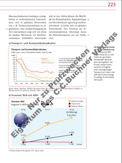 223 a) Transportund Kommunikationskosten Kommunikationstechnologien ermöglichen es multinationalen Unternehmen, sich in globalen Netzwerken von z. B. Tochterunternehmen zu organisieren. Das Auslandsengagement der Unternehmen zeigt sich vor allem im starken Wachstum der Direktinvestitionen. Schließlich entwickelte sich in den 1990er-Jahren die Mobilität des Finanzkapitals. Kapitalanleger und Kreditnehmer agieren grenzüberschreitend, es bildet sich ein globaler Finanzmarkt. Das Volumen der Finanztransaktionen übersteigt heute das Handelsvolumen um ein Vielfaches. 60 65 55 b) Vernetzte Welt seit 2005 Transportund Kommunikationskosten Index (1930 = 100), in konstanten Preisen, 1930 bis 2005 1970 1980 1990 2000 2005 Seefracht¹ 35,0 11,8 0,06 Lufttransport² Telekommunikation³ 10 0 20 30 40 50 60 70 80 90 1930 1940 1950 1960 Jahr 100 110 Index ³ Kosten eines 3-minütigen Telefongespräches von New York nach London ¹ Durchschnittliche Seetransportkosten und Hafengebühren für Import und Exportfracht pro short ton ² Durchschnittlicher Lufttransportumsatz pro Passagier und Meile Vernetzte Welt 2005 2010 2014 (Schätzung) 6.915 Mio. 1.243 1.229 2.032 5.290 1.147 2.923 1.024 2.205 Angaben in Millionen weltweit *Festnetz Mobilfunkverträge Internetnutzer Telefonanschlüsse* Quelle: Busse, Matthias: HWWA Discussion Paper Nr 116; BDI: Außenwirtschafts-Report 04/2002, in: Bundeszentrale für politische Bildung, 2009, www.bpb.de (7.6.2015) © Globus-Grafi k 6736; Quelle: ITU, Stand: 2013 Die Bedeutung der Container für die Globalisierung Mit Containerschiffen werden heute bis zu zwei Drittel des grenzüberschreitenden Warenverkehrs durchgeführt. Der Einsatz riesiger Frachtcontainer ermöglicht einen kostengünstigen Transport von Gütern und stellt damit eine wichtige Grundlage für die Globalisierung dar. Nu r z u Pr üf zw ec ke n Ei ge nt um d es C .C .B uc hn er V er la gs | |