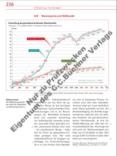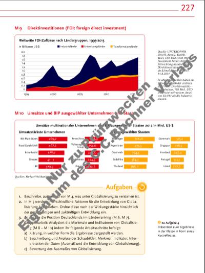 227 Weltweite FDI-Zuflüsse nach Ländergruppen, 1995-2013 in Billionen US-$ Industrieländer Entwicklungsländer Transformationsländer 1995 2000 2005 2010 2015 0 0.2 0.4 0.6 0.8 1.0 1.2 1.4 1.6 1.8 2.0 Quelle: UNCTAD/WIR 2014/S. Benz/J. Karl/E. Yalci, Der UNCTAD World Investment Report 2014, Die Entwicklung ausländischer Direktinvestitionen, in: ifo Schnelldienst, 15/2014, 14.8.2014 In absoluten Zahlen haben die Entwicklungsländer erstmals 2012 mehr Direktinvestitionen erhalten (778 Mrd. USD entspricht weltweitem Anteil von 53,6%) als die Industriestaaten. M 9 Direktinvestitionen (FDI: foreign direct investment) Umsätze multinationaler Unternehmen und BIP ausgewählter Staaten 2012 in Mrd. US-$ Umsatzstärkste Unternehmen BIP ausgewählter Staaten 469,2Wal-Mart-Stores 467,2Royal Dutch Shell 420,7ExxonMobil 411,7Sinopec 370,9BP 308,9PetroChina 254,0Volkswagen Group 240,5Total 224,5Toyota Motor 222,6Chevron Norwegen 500,0 Argentinien 475,5 Österreich 394,5 Südafrika 384,3 Thailand 366,0 Dänemark 315,2 Singapur 276,5 Finnland 247,4 Portugal 212,1 Irland 210,6 Quellen: Forbes / Weltbank 2014 M 10 Umsätze und BIP ausgewählter Unternehmen und Staaten Aufgaben 1. Beschreibe, ausgehend von M 4, was unter Globalisierung zu verstehen ist. 2. In M 5 werden unterschiedliche Faktoren für die Entwicklung von Globalisierung beschrieben. Ordne diese nach der Wirkungsstärke hinsichtlich der gegenwärtigen und zukünftigen Entwicklung ein. 3. Analysiere die Position Deutschlands im Länderranking (M 6, M 7). 4. Gruppenarbeit: Analysiert die Merkmale und Indikatoren von Globalisierung (M 8 – M 10) indem ihr folgende Arbeitsschritte befolgt: a) Klärung, in welcher Form die Ergebnisse dargestellt werden. b) Beschreibung und Analyse der Schaubilder: Merkmal, Indikator, Interpretation der Daten (Ausmaß und die Entwicklung von Globalisierung). c) Bewertung des Ausmaßes von Globalisierung. zu Aufgabe 4 Präsentiert eure Ergebnisse in der Klasse in Form eines Kurzreferates. Nu r z u Pr üf zw ec ke n Ei ge n um d es C .C .B uc hn er V rla gs | |