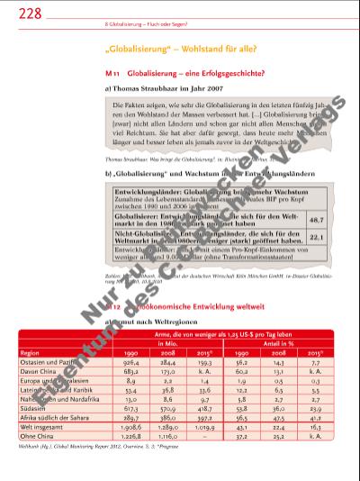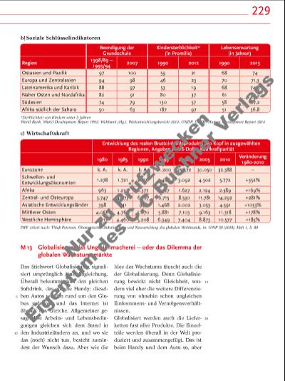 229 Entwicklung des realen Bruttoinlandsprodukts pro Kopf in ausgewählten Regionen, Angaben in US-Dollar Kaufkraftparität 1980 1985 1990 1995 2000 2005 2010 Veränderung 1980-2010 Eurozone k. A. k. A. k. A. 21.200 25.472 30.050 32.388 – Schwellenund Entwicklungsökonomien 1.278 1.721 2.156 2.488 3.092 4.302 5.772 +352% Afrika 963 1.210 1.377 1.427 1.627 2.124 2.589 +169% Zentralund Osteuropa 3.747 4.973 6.167 6.715 8.530 11.781 14.292 +281% Asiatische Entwicklungsländer 398 641 948 1.468 2.002 3.053 4.591 +1053% Mittlerer Osten 4.066 4.767 5.070 5.881 7.103 9.163 11.318 +178% Westliche Hemisphäre 3.713 4.460 5.208 6.349 7.404 8.873 10.577 +185% Beendigung der Grundschule Kindersterblichkeit* (in Promille) Lebenserwartung (in Jahren) Region 1998/89 – 1993/94 2007 1990 2012 1990 2013 Ostasien und Pazifi k 97 100 59 21 68 74 Europa und Zentralasien 94 98 46 23 70 71,3 Lateinamerika und Karibik 88 97 53 19 68 74,9 Naher Osten und Nordafrika 82 91 80 37 61 70,2 Südasien 74 79 130 57 58 67,2 Afrika südlich der Sahara 50 63 187 97 51 56,8 *Sterblichkeit von Kindern unter 5 Jahren World Bank, World Development Report 1992; Weltbank (Hg.), Weltentwicklungsbericht 2010; UNDP, UNDP, Human Development Report 2014 b) Soziale Schlüsselindikatoren IWF, zitiert nach: Thieß Petersen, Ökonomische Globalisierung und Neuverteilung des globalen Wohlstands, in: GWP 59 (2010), Heft 1, S. 80 c) Wirtschaftskraft 15 20 M 13 Globalisierung ist Ungleichmacherei – oder das Dilemma der globalen Wachstumsmärkte Das Stichwort Globalisierung signalisiert ursprünglich eine Angleichung. Überall bekommt man den gleichen Softdrink, das gleiche Handy; dieselben Autos werden rund um den Globus gefahren und das Internet ist überall das Gleiche. Allgemeiner gesagt: Die Arbeitsund Lebensbedingungen gleichen sich dem Stand in den Industrieländern an, und wo sie das (noch) nicht tun, besteht zumindest der Wunsch dazu. Aber wie die Idee des Wachstums täuscht auch die der Globalisierung. Denn Globalisierung bewirkt nicht Gleichheit, sondern viel eher die weitere Differenzierung von ohnehin schon ungleichen Einkommensund Vermögensverhältnissen. Globalisiert werden auch die Lieferketten fast aller Produkte. Die Einzelteile werden überall in der Welt produziert und zusammengefügt. Das ist beim Handy und dem Auto so, aber 5 10 Nu r z u Pr üf zw ec ke n Ei ge nt um d es C. C. Bu ch ne r V er la gs | |