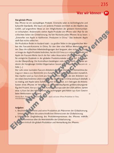 235 Was wir können Das globale iPhone Das iPhone ist ein zwiespältiges Produkt. Einerseits setzt es technologische und kulturelle Standards. Wie kaum ein anderes Produkt vermittelt es den Käufern das Gefühl, auf angenehme Weise an den Möglichkeiten der globalen Kommunikation teilzuhaben. Andererseits stehen Apple-Produkte wie iPhone oder iPad für die schlechten Seiten der Globalisierung. Auf der Rückseite jedes iPhones ist zu lesen: „Entworfen von Apple in Kalifornien. Produziert in China.“ Das bedeutet: Apple stellt fast nichts selbst her. Die Produktion fi ndet im Ausland statt – zu großen Teilen in den gigantischen Werken des Foxconn-Konzerns in China, für den über eine Million Menschen arbeiten. Dass die schlechten Arbeitsbedingungen dort langsam, aber sicher das positive Image der Apple-Produkte bedrohen, hat die US-Firma 2011 erkannt. Deshalb ließ Apple die Foxconn-Werke durch die Fair Labor Association (FLA) kontrollieren, die für erträgliche Zustände in der globalen Produktionskette sorgen soll. Das Ergebnis der Überprüfung: Die Kontrolleure bestätigten viele der Vorwürfe, die unter anderem die Hongkonger Kritiker-Organisation Sacom gegen Apple und Foxconn erhebt. […] Der Lohn einer normalen Foxconn-Arbeiterin im Werk Chengdu in Zentralchina betrug 2011 etwa 2.000 Renmimibi (210 Euro) für rund 240 Arbeitsstunden monatlich. Das machte rund 90 Euro-Cent pro Stunde – eine Summe, die den Arbeitern nur ein relativ bescheidenes Leben ermöglichte. D[ie] Löhne in China sind auch deshalb so niedrig, weil Apple seine Zulieferer unter Druck setzt. 2011 betrugen die Arbeitskosten eines iPhones im Verhältnis zu dessen Verkaufspreis größenordnungsmäßig drei Prozent. Von 500 Euro, die Kunden in Europa oder den USA zahlten, kamen etwa 15 Euro bei den Arbeiterinnen an [,wohingegen geschätzte 240 Euro Gewinn beim Weltkonzern verbleiben]. Hannes Koch, Fragwürdige Arbeitsbedingungen – Apple und seine iPhone-Produktion in China, www.derwesten.de, 13.9.2012 Aufgaben 1. Beschreibe das iPhone und seine Produktion als Phänomen der Globalisierung. Unterscheide dabei die unterschiedlichen Dimensionen der Globalisierung. 2. Erläutere die Zergliederung des Produktionsprozesses des iPhones mithilfe deiner Kenntnisse über die Antriebskräfte der Globalisierung. 3. Erörtere kritisch die globale Produktion und Vermarktung des iPhones. 5 10 15 20 25 Nu r z u Pr üf zw ec ke n Ei g nt um d es C .C .B uc hn r V er la gs | |