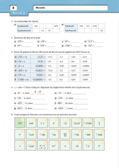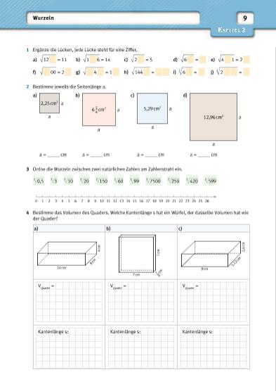 9Kapitel 2 Wurzeln 1 Ergänze die Lücken, jede Lücke steht für eine Ziffer. a) 12 = 11 b) 1 6 = 14 c) 2 = 5 d) 6 = e) 4 1 = 2 f) 00 = 2 g) 4 = 1 h) 144 = i) 6 3 = j) 2 3 = 2 Bestimme jeweils die Seitenlänge a. a) 2,25 cm2 a a b) 6 14 cm 2 a a c) 5,29 cm2 a a d) 12,96 cm2 a a a = _____ cm a = _____ cm a = _____ cm a = _____ cm 3 Ordne die Wurzeln zwischen zwei natürlichen Zahlen am Zahlenstrahl ein. 0 1 2 3 4 5 6 7 8 9 10 11 12 13 14 15 16 17 18 19 20 21 22 23 24 25 26 0,5 2 3 2 10 2 20 3 150 2 60 2 99 2 7500 3 250 2 420 2 599 2 4 Bestimme das Volumen des Quaders. Welche Kantenlänge s hat ein Würfel, der dasselbe Volumen hat wie der Quader? a) b) c) 16 cm 4 c m 8 c m 7 cm 7 8 cm 7 c m 9 cm 2 ,4 c m 5, 12 cm V Quader = V Quader = V Quader = Kantenlänge s: Kantenlänge s: Kantenlänge s: | |