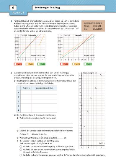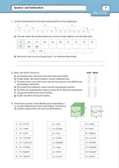 7Kapitel 2 Quadratund Kubikzahlen 1 Auf dem Zahlenstrahl sind die ersten Quadratzahlen rot hervorgehoben. +1 +3 +5 +7 0 1 2 3 4 5 6 7 8 9 10 11 12 13 14 15 16 a) Fülle die Tabelle der Quadratzahlen aus, rechne im Kopf. Ergänze auch die letzte Zeile. n 16 17 18 19 20 21 22 23 24 n2 256 289 + 33 + 35 b) Wie kommt man von einer Quadratzahl n2 zur nächsten? Beschreibe. ____________________________________________________________________________________ ____________________________________________________________________________________ 2 Wahr oder falsch? Kreuze an. wahr falsch a) Das Quadrat einer rationalen Zahl nennt man Quadratzahl. b) Es gibt Zahlen, die sowohl Quadratals auch Kubikzahl sind. c) Die dritte Potenz einer Zahl a kann man als das Volumen eines Würfels der Kantenlänge a verstehen. d) Man erhält eine Kubikzahl, indem man eine Quadratzahl quadriert. e) Die Reihe der Quadratzahlen steigt schneller als die Reihe der Kubikzahlen. f) Jede gerade Kubikzahl ist durch 8 teilbar. g) Es gibt unendlich viele Quadratzahlen. 3 Ordne dem Volumen V eines Würfels seine Kantenlänge a a a a a aV Würfel = a3 A Quadrat = a2 zu und den Flächeninhalt A einer Seitenfl äche. Nummeriere die Spalten entsprechend und achte auf die Einheiten. 1 V = 27 cm3 a = 12 m A = 1 mm2 2 V = 1 mm3 1 a = 0,3 dm 1 A = 9 cm2 3 V = 1 dm3 a = 7 cm A = 100 cm2 4 V = 3,375 m3 a = 15 dm A = 1,21 cm2 5 V = 1,331 cm3 a = 0,04 dm A = 225 dm2 6 V = 1728 m3 a = 1 mm A = 0,49 dm2 7 V = 64 mm3 a = 10 cm A = 0,16 cm2 8 V = 343 cm3 a = 1,1 cm A = 144 m2 | |