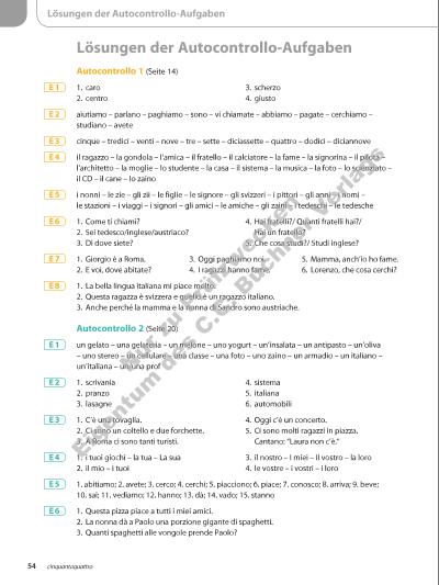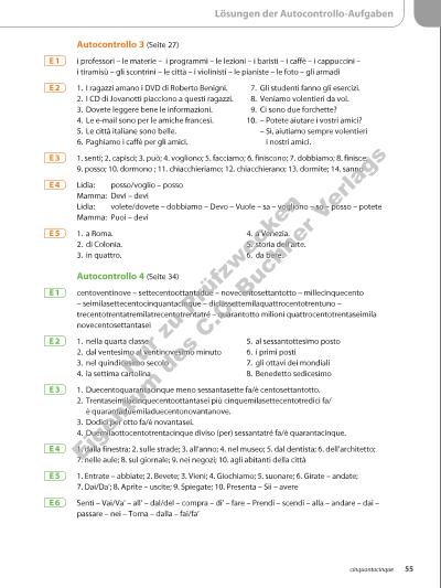 cinquantacinque 55 Lösungen der Autocontrollo-Aufgaben Autocontrollo 3 (Seite 27) i professori – le materie – i programmi – le lezioni – i baristi – i caffè – i cappuccini – i tiramisù – gli scontrini – le città – i violinisti – le pianiste – le foto – gli armadi 1 . I ragazzi amano i DVD di Roberto Benigni . 2 . I CD di Jovanotti piacciono a questi ragazzi . 3 . Dovete leggere bene le informazioni . 4 . Le e-mail sono per le amiche francesi . 5 . Le città italiane sono belle . 6 . Paghiamo i caffè per gli amici . 7 . Gli studenti fanno gli esercizi . 8 . Veniamo volentieri da voi . 9 . Ci sono due forchette? 10 . – Potete aiutare i vostri amici? – Sì, aiutiamo sempre volentieri i nostri amici . 1 . senti; 2 . capisci; 3 . può; 4 . vogliono; 5 . facciamo; 6 . finiscono; 7 . dobbiamo; 8 . finisce; 9 . posso; 10 . dormono ; 11 . chiacchieriamo; 12 . chiacchierano; 13 . dormite; 14 . sanno Lidia: posso/voglio – posso Mamma: Devi – devi Lidia: volete/dovete – dobbiamo – Devo – Vuole – sa – vogliono – so – posso – potete Mamma: Puoi – devi 1 . a Roma . 2 . di Colonia . 3 . in quattro . 4 . a Venezia . 5 . storia dell‘arte . 6 . da bere . Autocontrollo 4 (Seite 34) centoventinove – settecentoottantadue – novecentosettantotto – millecinquecento – seimilasettecentocinquantacinque – diciassettemilaquattrocentotrentuno – trecentotrentatremilatrecentotrentatré – quarantotto milioni quattrocentotrentaseimila novecentosettantasei 1 . nella quarta classe 2 . dal ventesimo al ventinovesimo minuto 3 . nel quindicesimo secolo 4 . la settima cartolina 5 . al sessantottesimo posto 6 . i primi posti 7 . gli ottavi dei mondiali 8 . Benedetto sedicesimo 1 . Duecentoquarantacinque meno sessantasette fa/è centosettantotto . 2 . Trentaseimilacinquecentoottantasei più cinquemilasettecentotredici fa/ è quarantaduemiladuecentonovantanove . 3 . Dodici per otto fa/è novantasei . 4 . Duemilaottocentotrentacinque diviso (per) sessantatré fa/è quarantacinque . 1 . dalla finestra; 2 . sulle strade; 3 . all’anno; 4 . nel museo; 5 . dal dentista; 6 . dell’architetto; 7 . nelle aule; 8 . sul giornale; 9 . nei negozi; 10 . agli abitanti della città 1 . Entrate – abbiate; 2 . Bevete; 3 . Vieni; 4 . Giochiamo; 5 . suonare; 6 . Girate – andate; 7 . Dai/Da’; 8 . Aprite – uscite; 9 . Spiegate; 10 . Presenta – Sii – avere Senti – Vai/Va’ – all’ – dal/del – compra – di’ – fare – Prendi – scendi – alla – andare – dai – passare – nei – Torna – dalla – fai/fa’ E 1 E 2 E 3 E 4 E 5 E 1 E 2 E 3 E 4 E 5 E 6 Nu r z u Pr üf zw ec ke n Ei ge nt um d es C .C . B uc hn r V er la gs | |