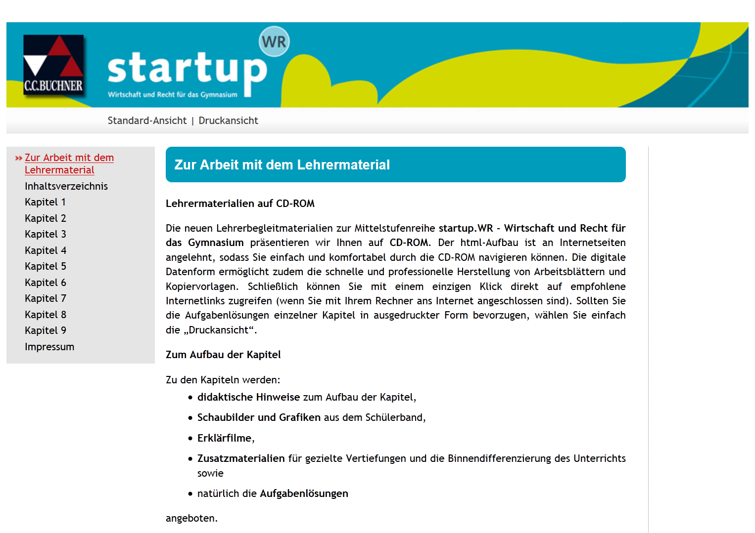 Das Lehrermaterial zu startup.WR 1 präsentieren wir Ihnen in digitaler Form. Zu den Kapiteln werden didaktische Hinweise, Kopiervorlagen für Arbeitsblätter, Aufgabenlösungen, Tafelbilder sowie ergänzende Materialien für die Hand des Lehrers oder zur gezielten Vertiefung des Unterrichts angeboten.